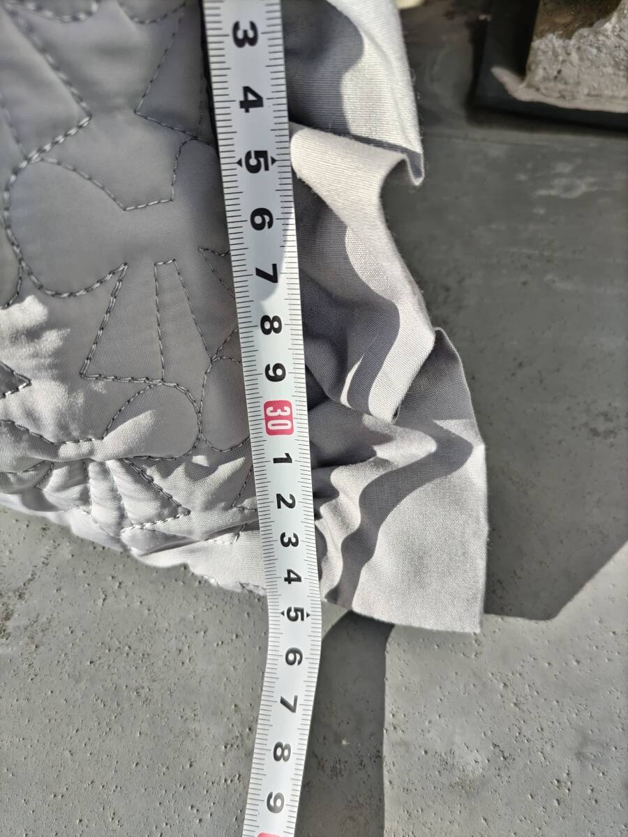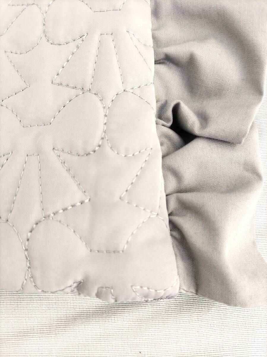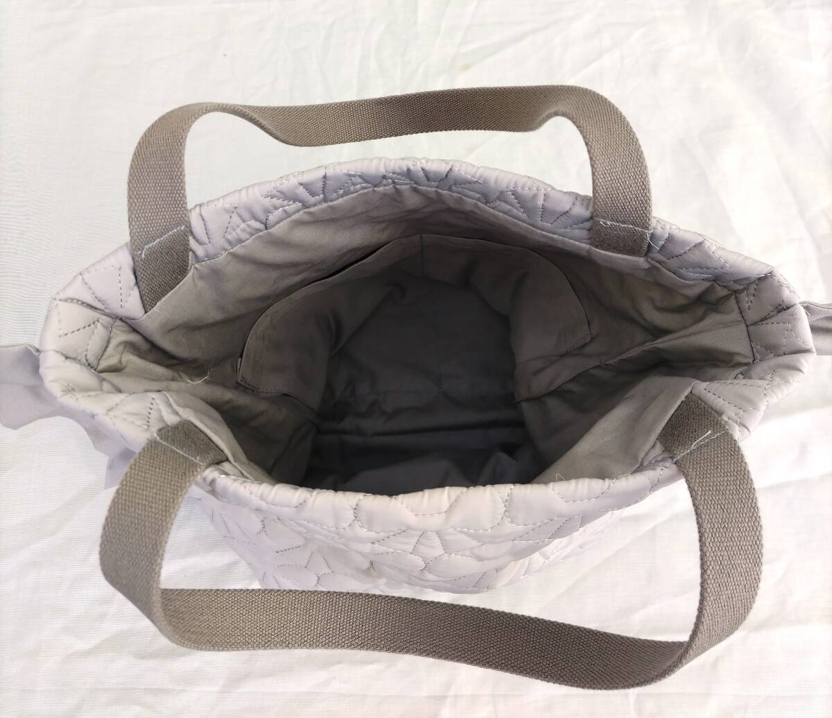 フリルデザインのグレーの手提げバッグ、裏地付きで実用的。