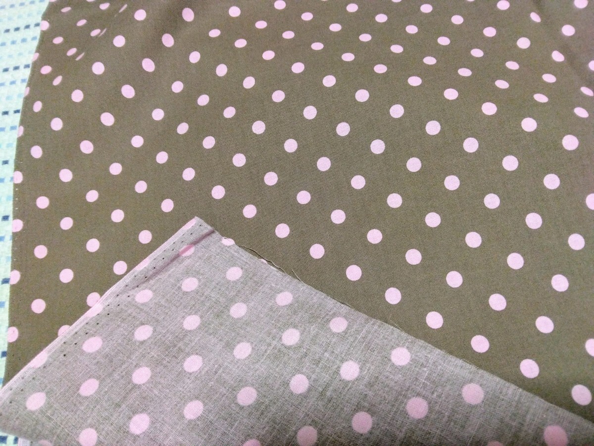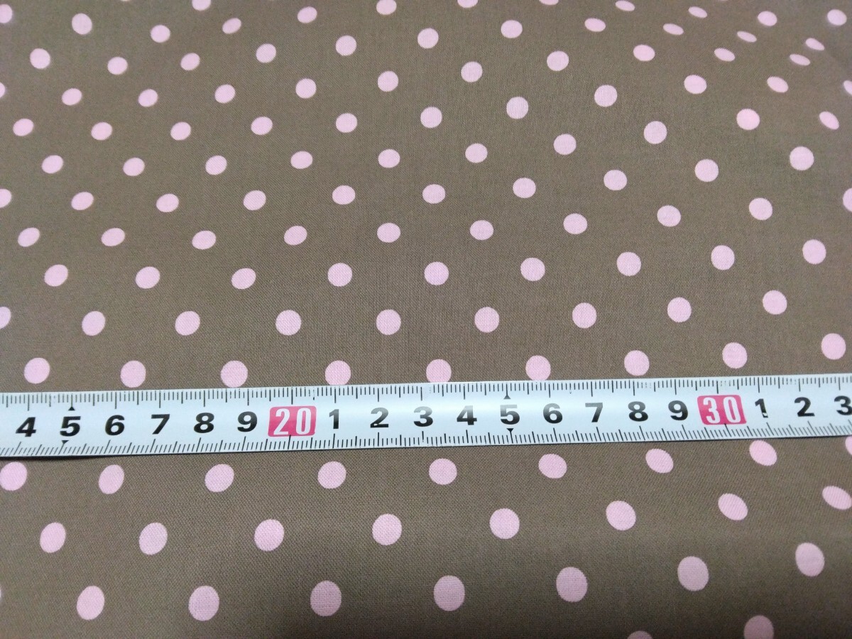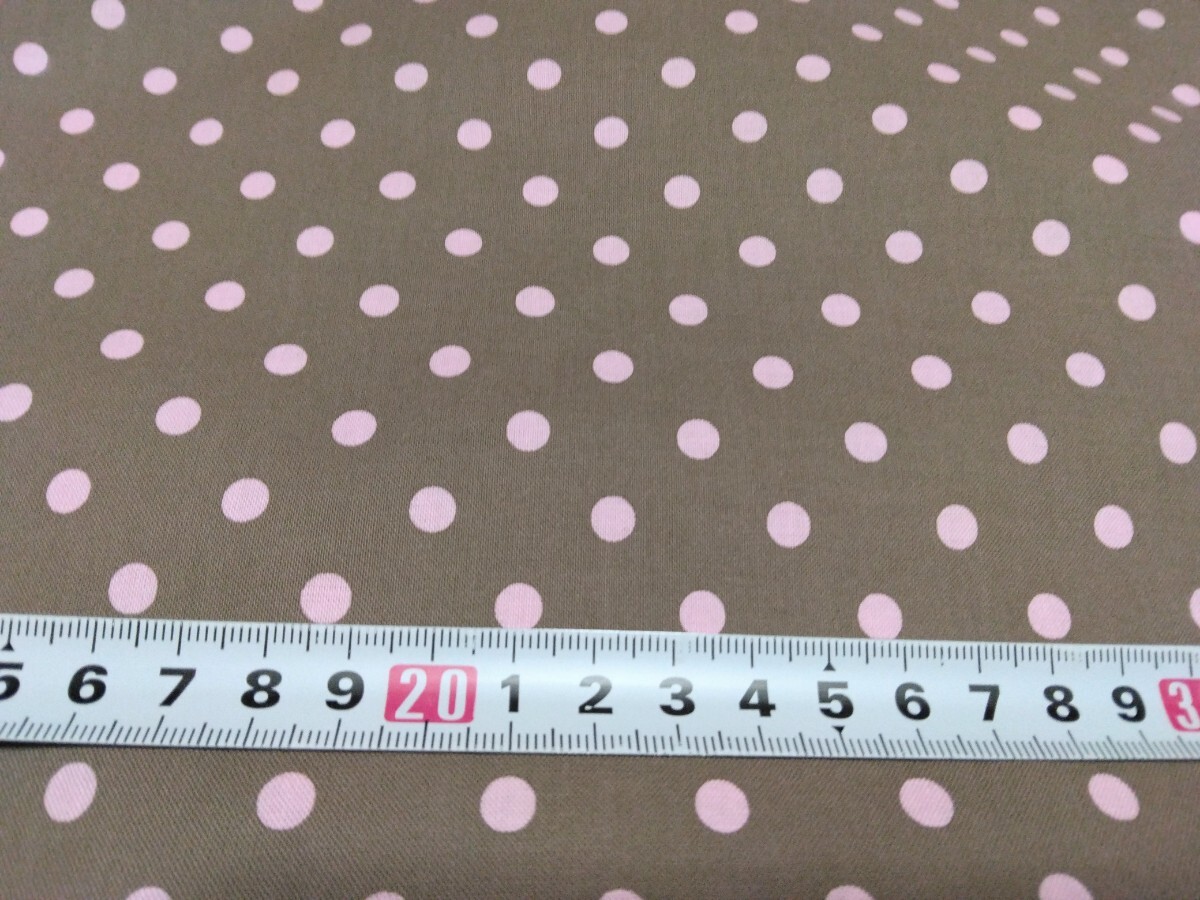 モカ茶?にピンクのドット柄の綿生地です。生地の詳細は不明ですが、シーチング位の厚みかと思います。107×48センチの金額になります。
