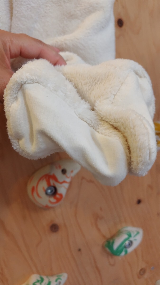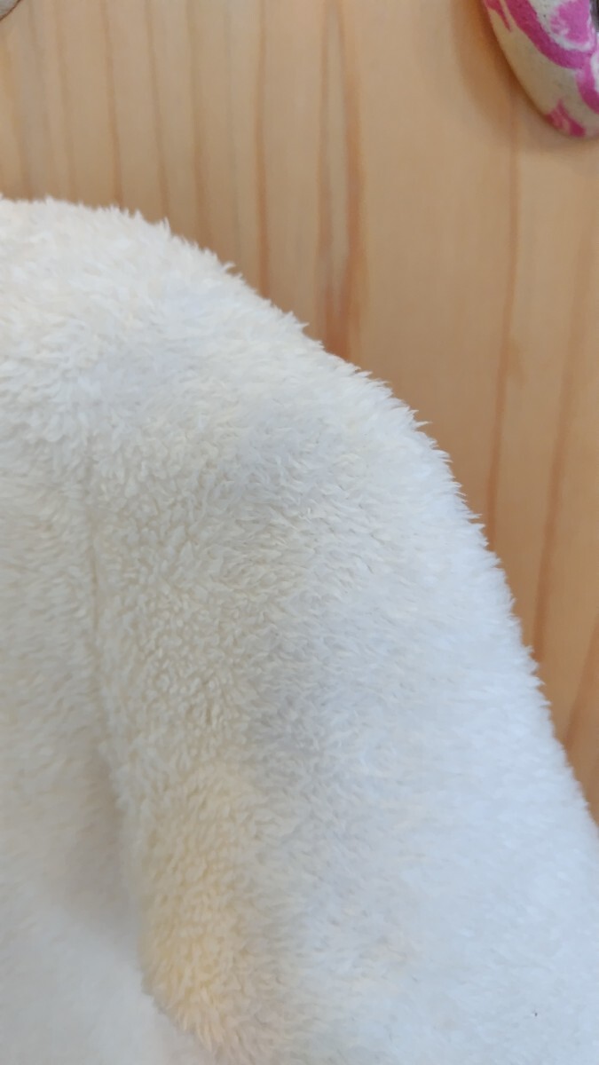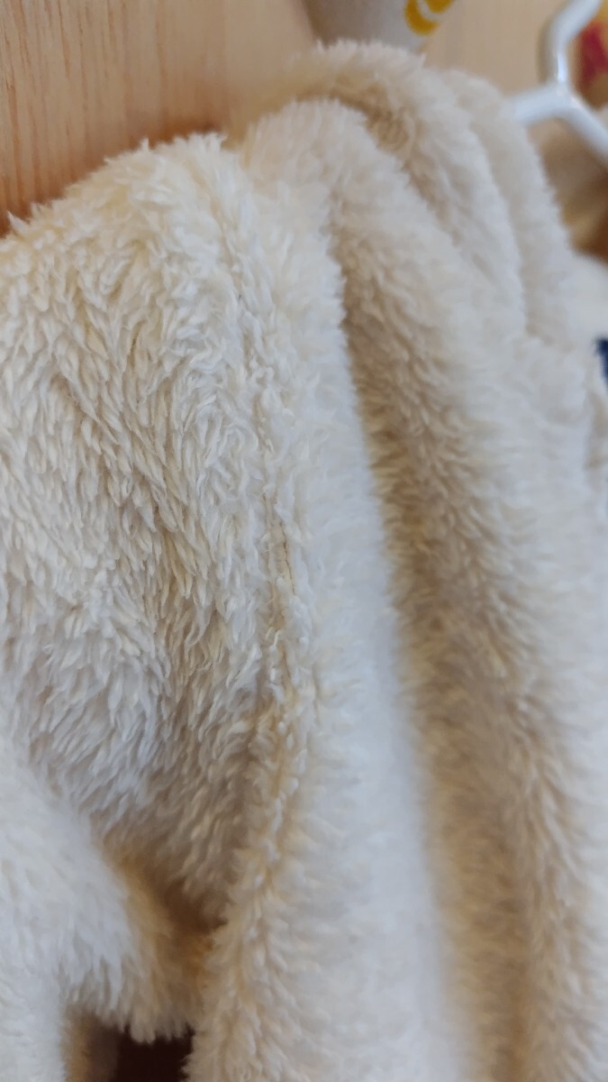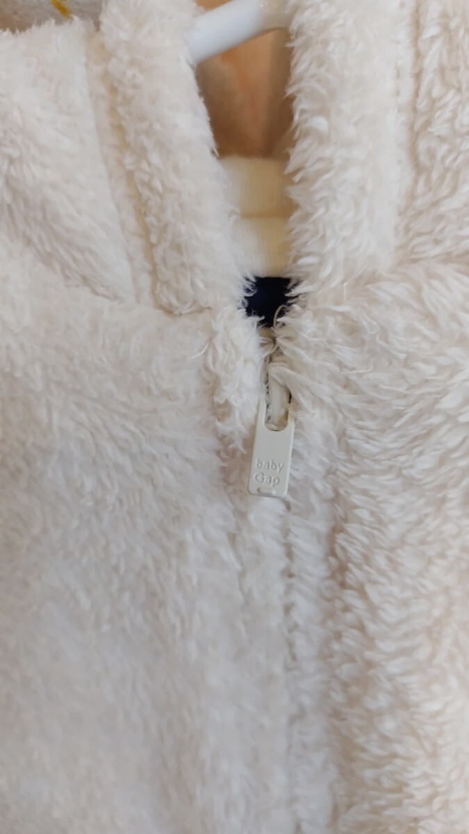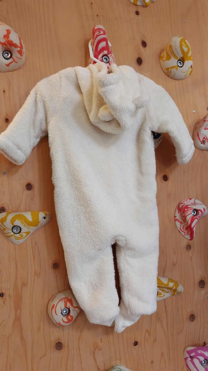 フリース素材のフード付きロンパース、柔らかく暖かいデザイン。