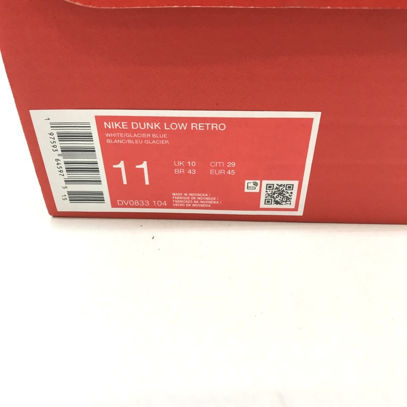 Nike ナイキ スニーカー Dunk Low Retro Glacier Blue DV0833-104 箱付き タグ付き ダンク ロー レトロ グレイシアブルー ランク:A 使用感の少ない綺麗な商品です。 左足数ヶ所汚れありです。 ※写真にないものは付属しておりません。 原産国/製造国:インドネシア カット:ローカット 靴のアウトソール素材:ゴム 個数:1 靴のサイズ(UK):10 靴のサイズ(EUR):45 カラー:グレイシアブルー |