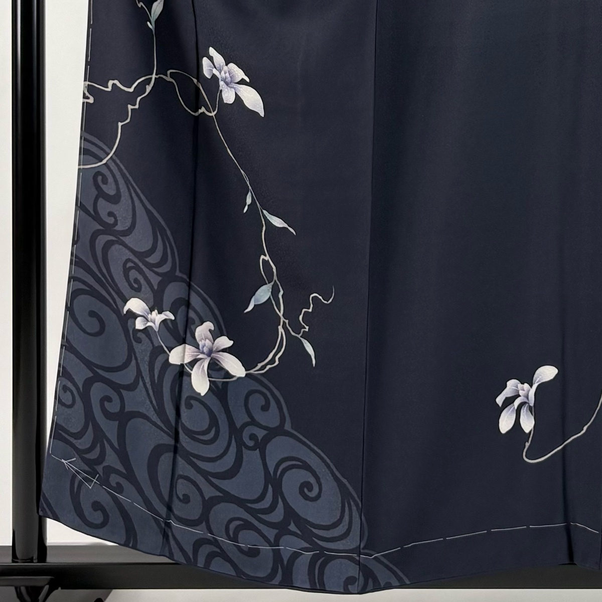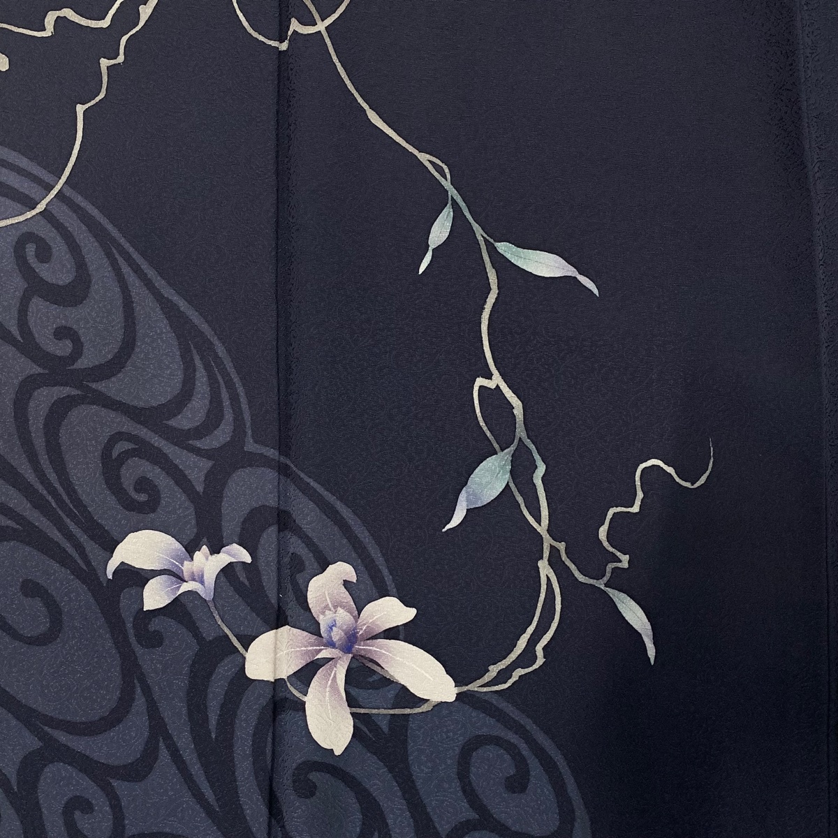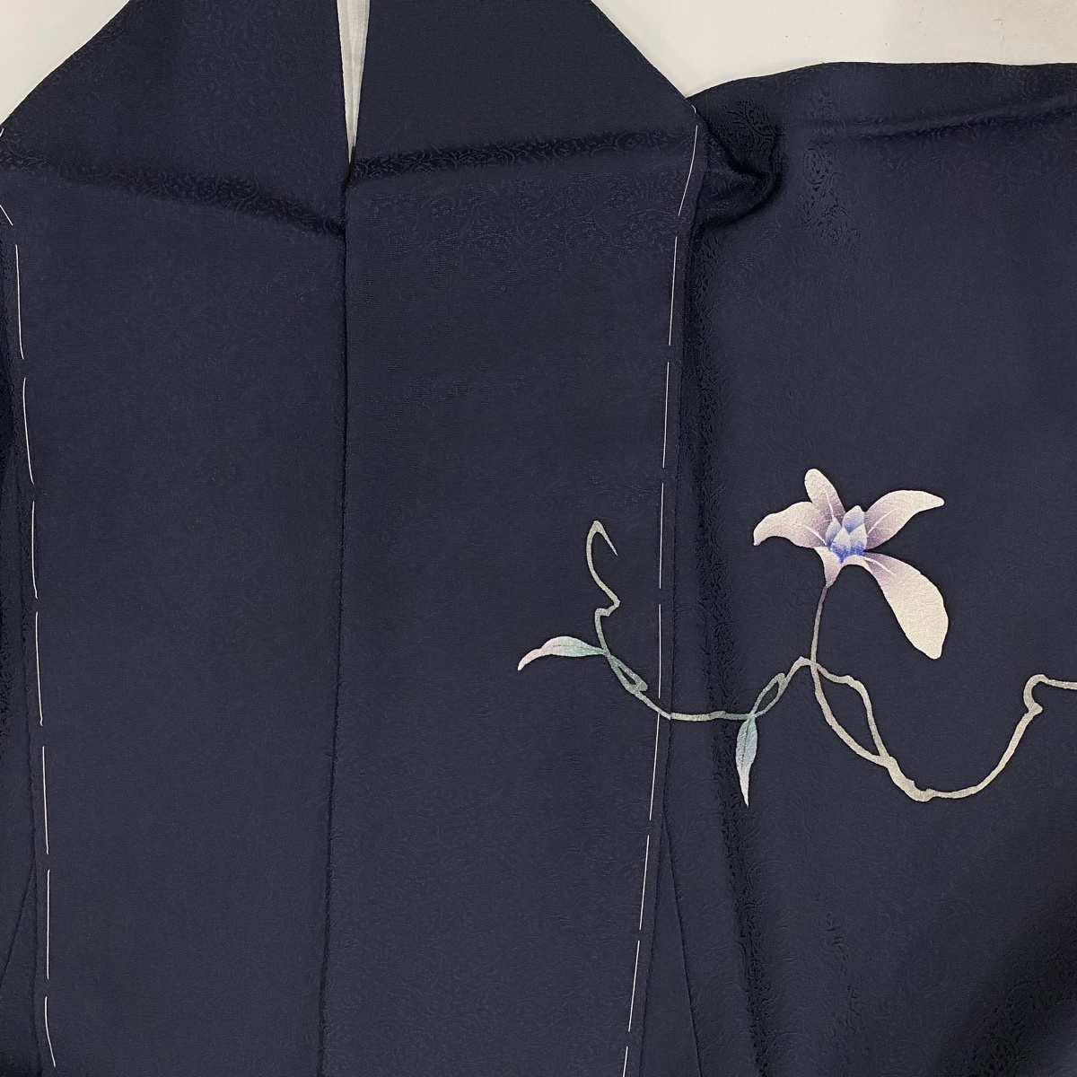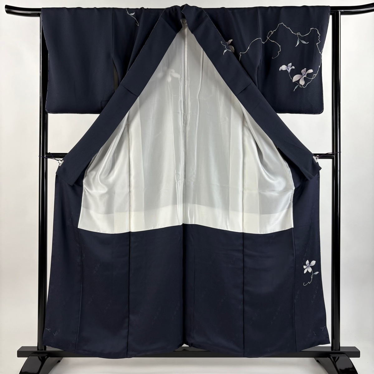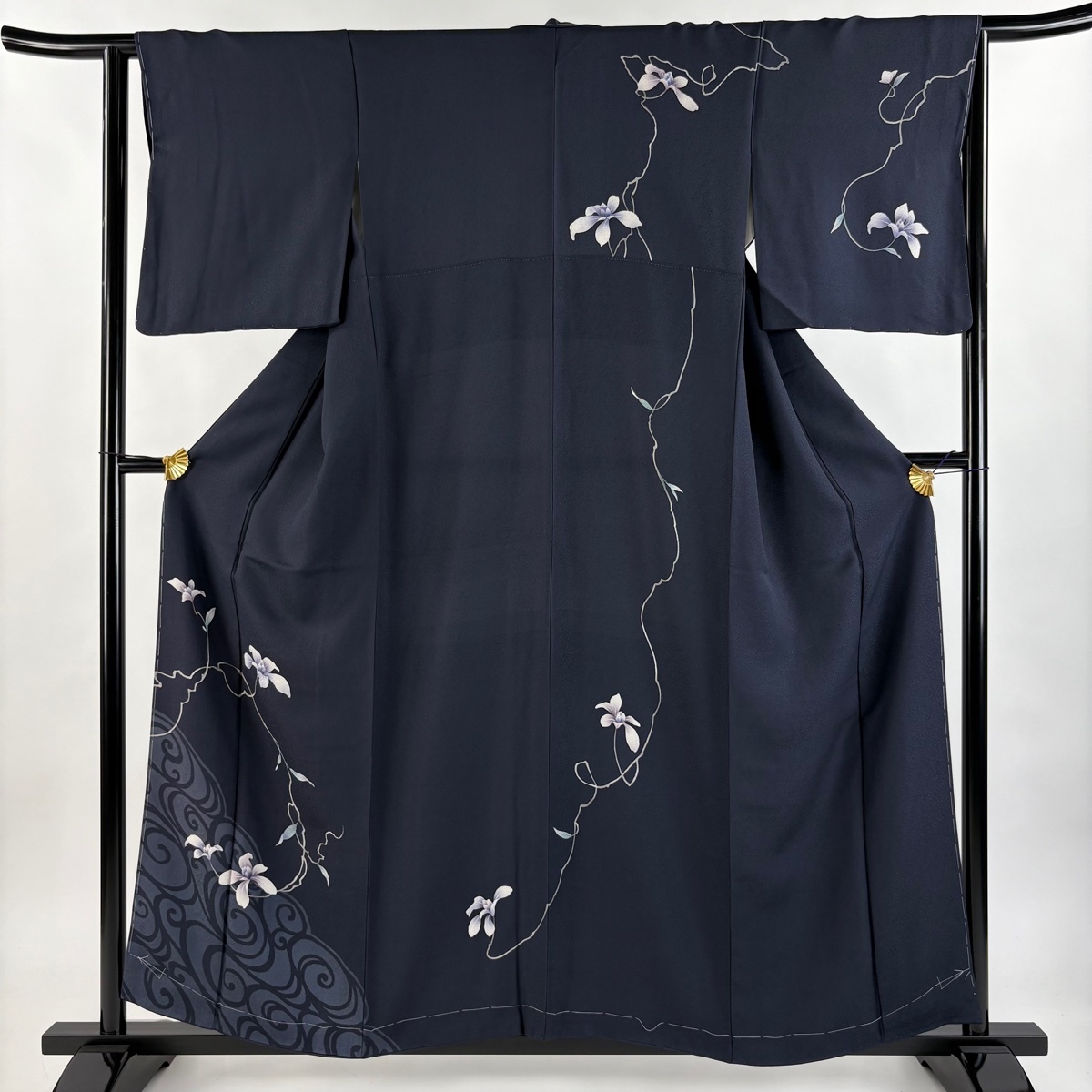 | 付下げ 秀品 草花 流水 濃紺 袷 身丈158 裄丈64 M 正絹 【中古】 |