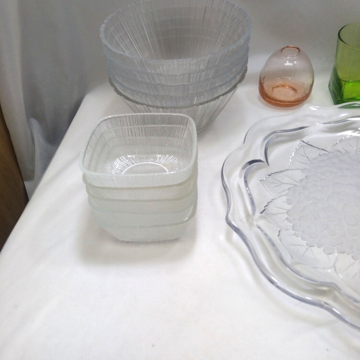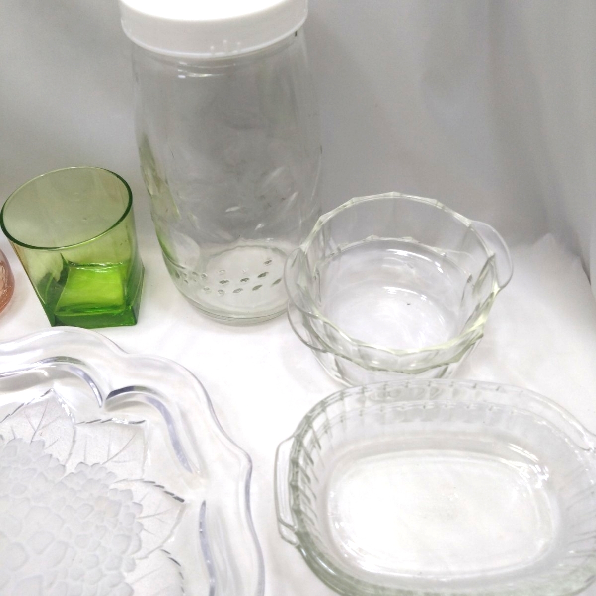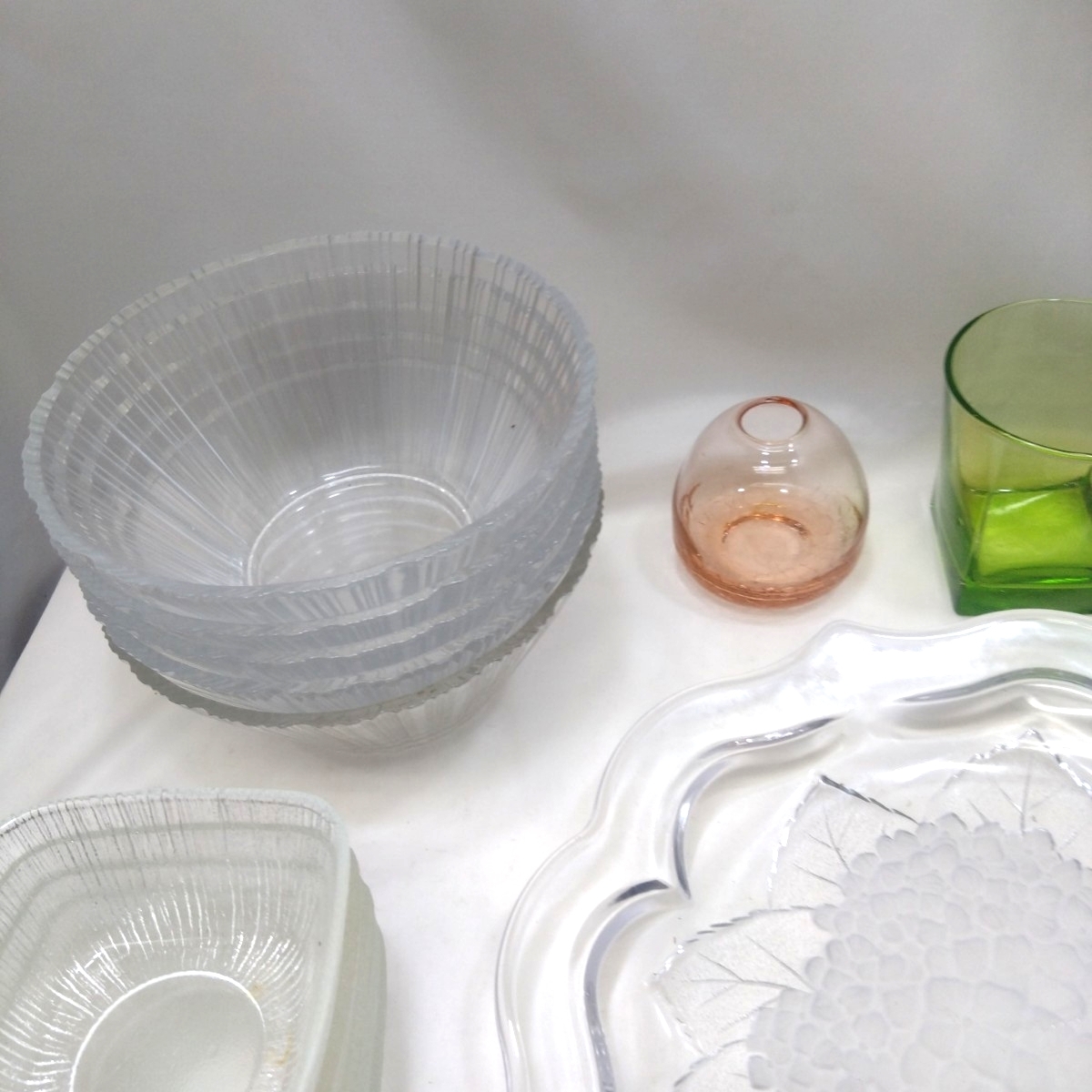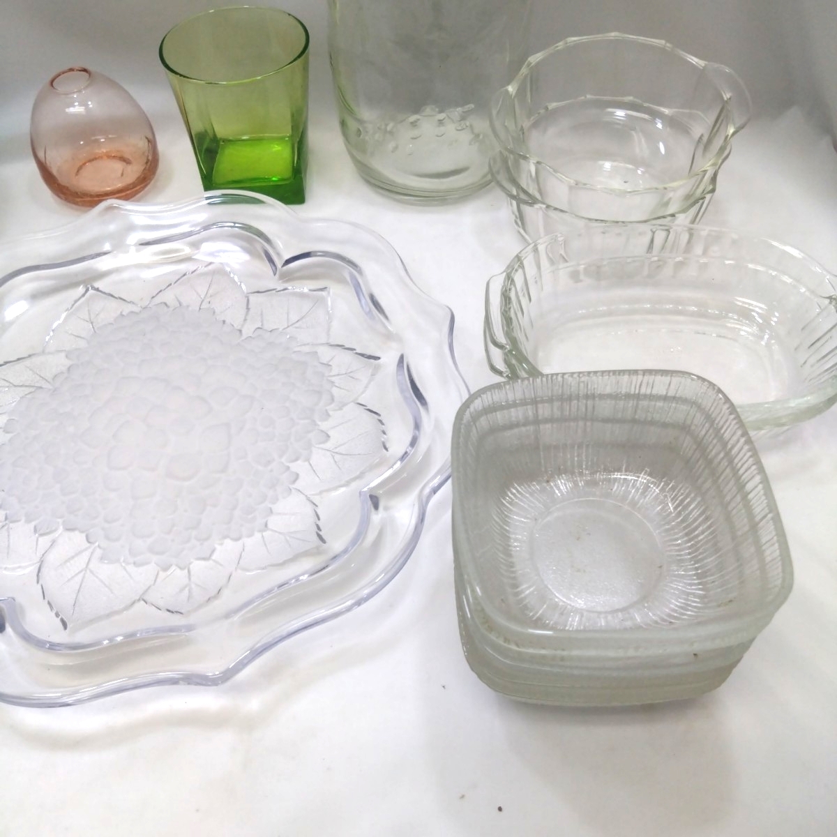 | ■まとめ レトロ 食器 ガラス製品 カラー硝子 大皿1 中鉢型5 小鉢10 グラタン皿2+2(Pyrex)パイレックス グラス1 一輪挿し1 模様瓶1■ |