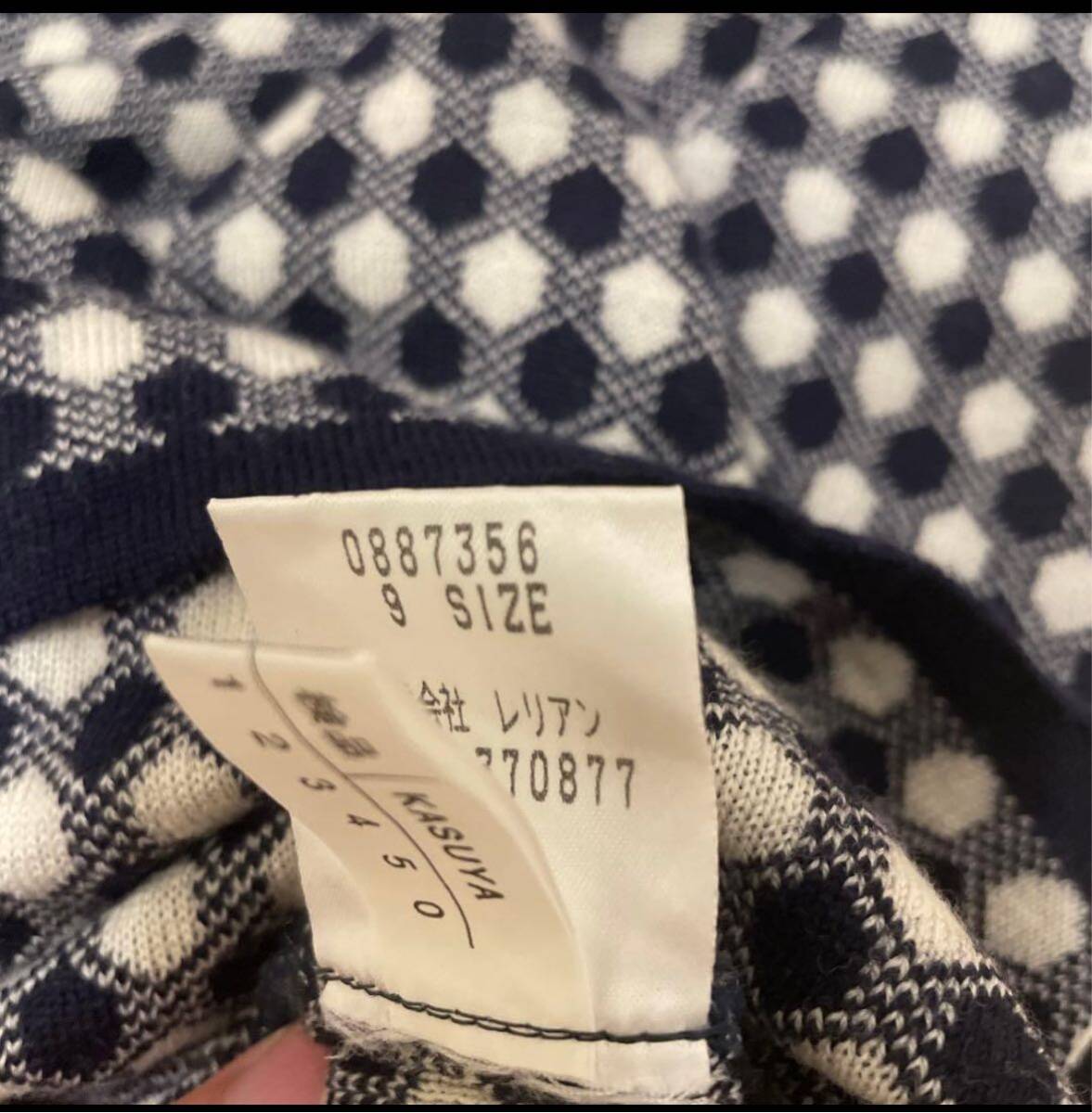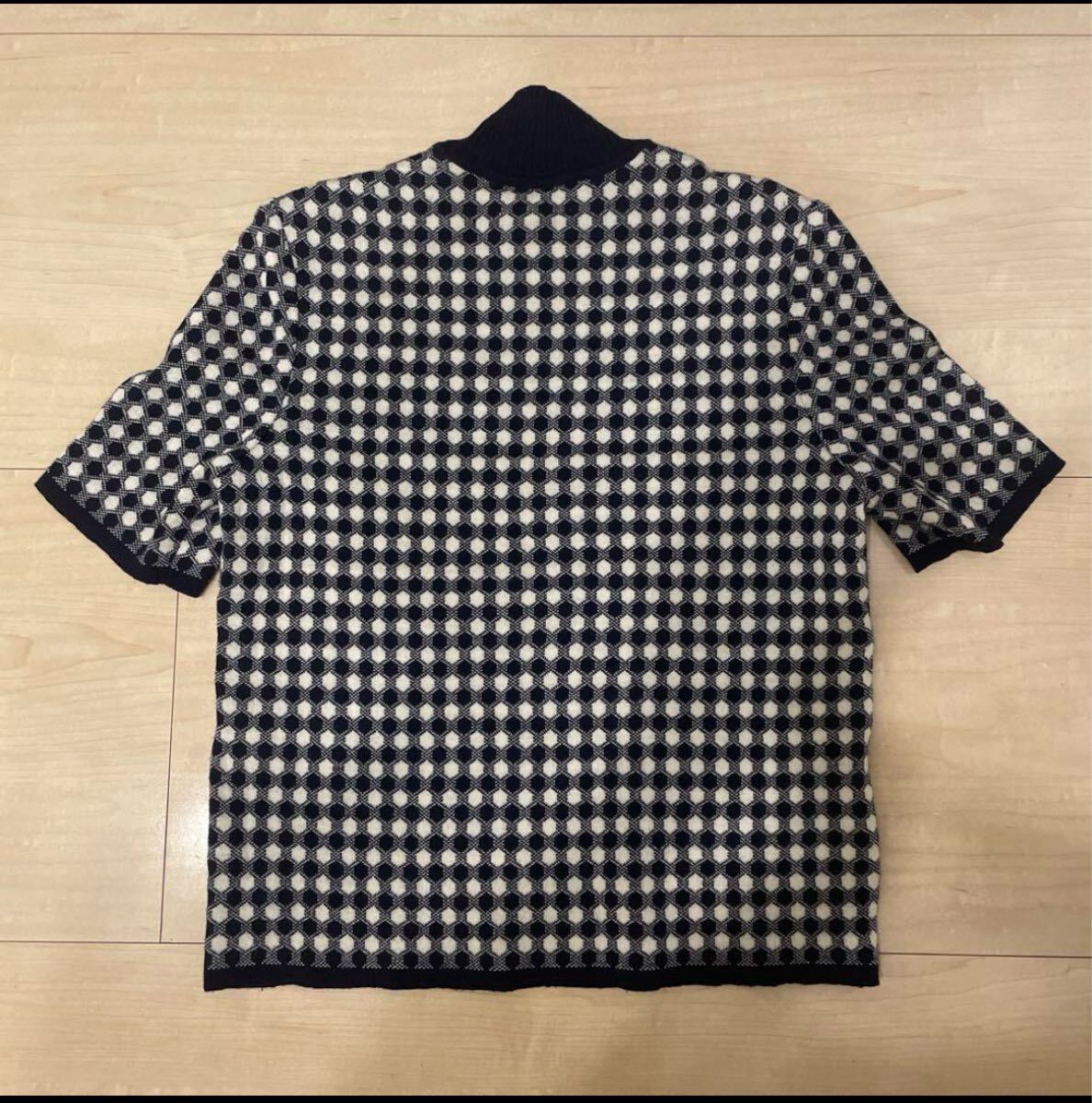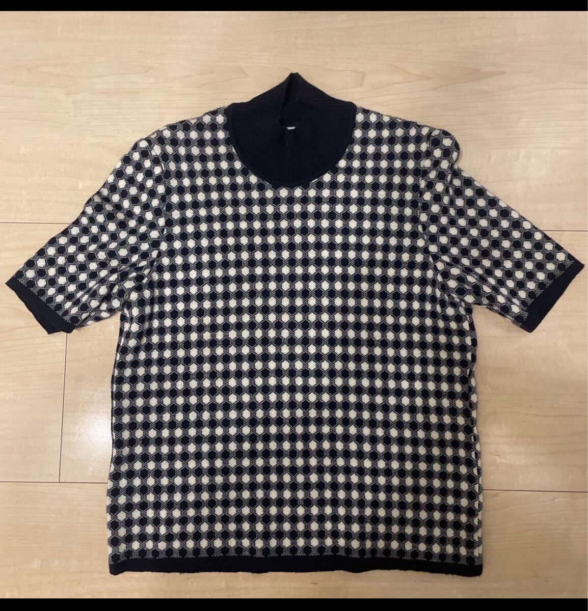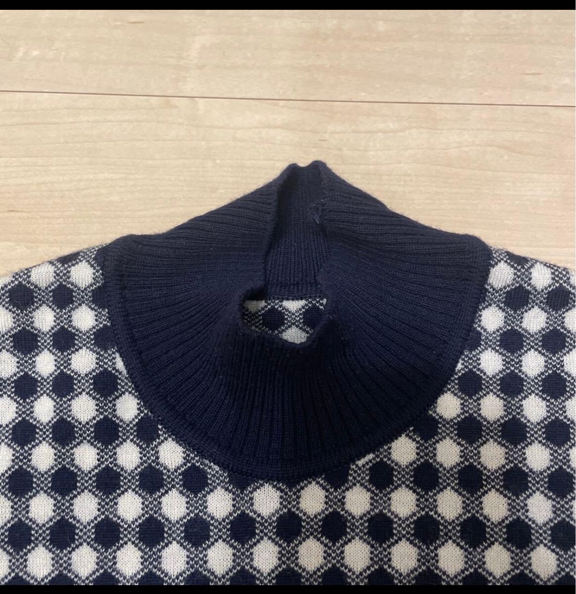 ネイビーとホワイトのドット柄のハイネックニット半袖トップス。