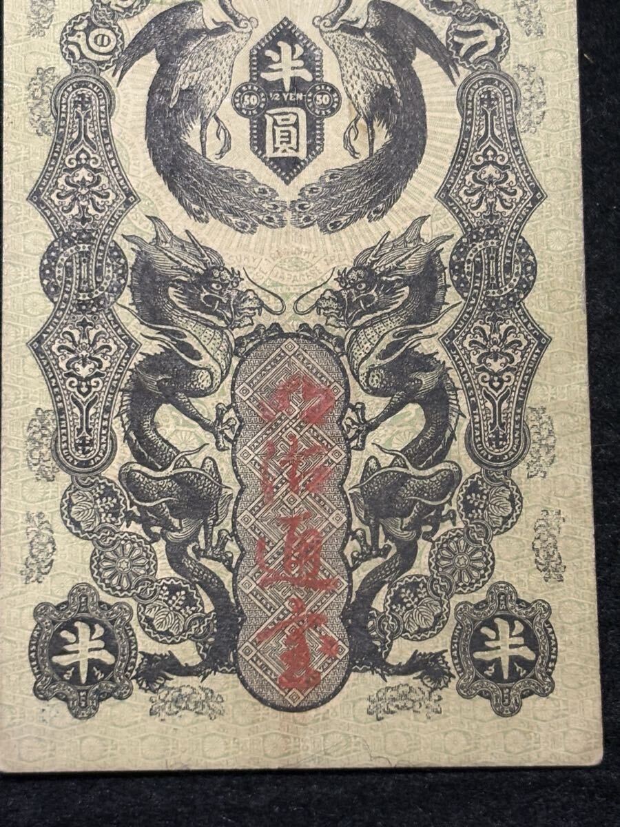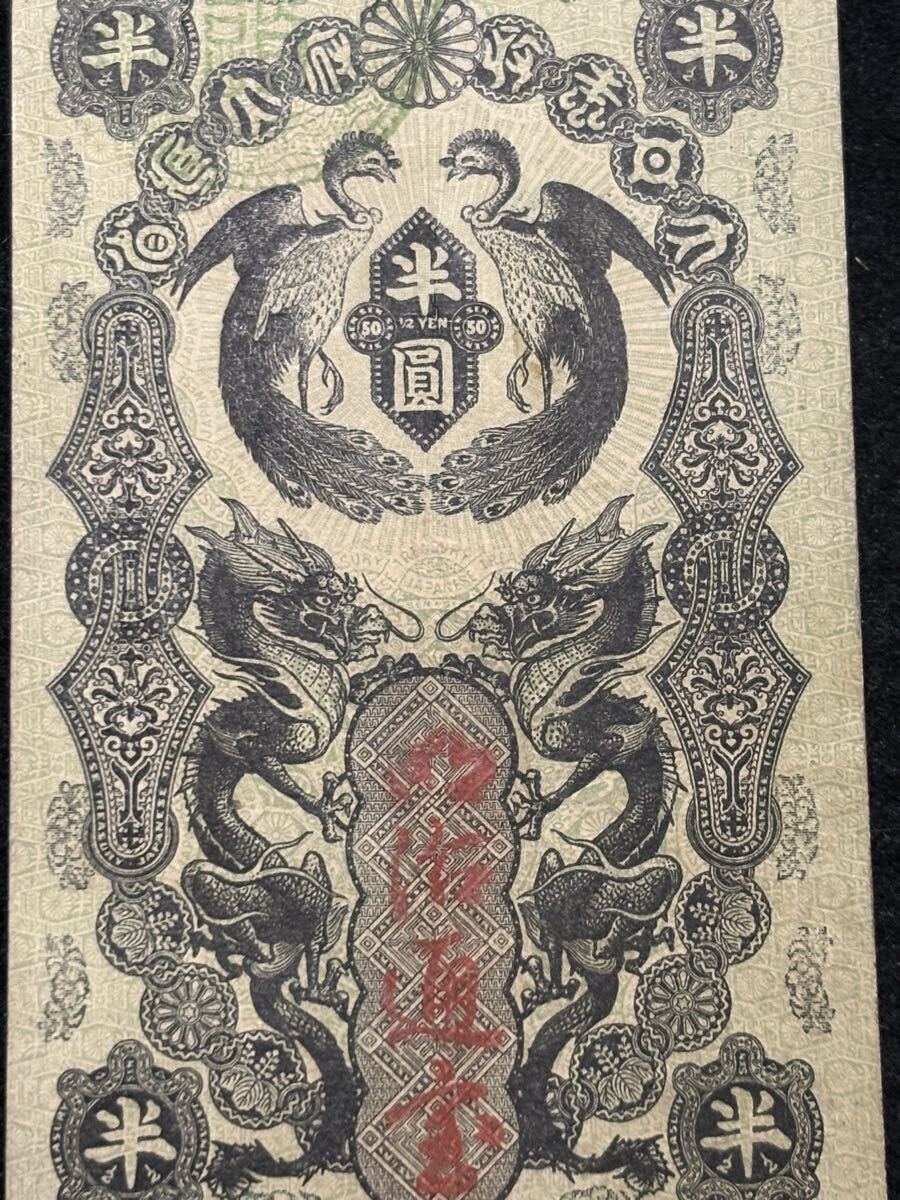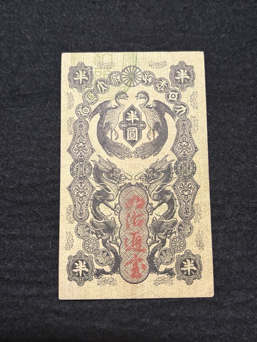 ● 明治通宝の半圓紙幣です。明治通宝は、明治時代初期に発行された政府紙幣で、日本で初めて西洋式の印刷技術を用いて製造された紙幣として知られています。