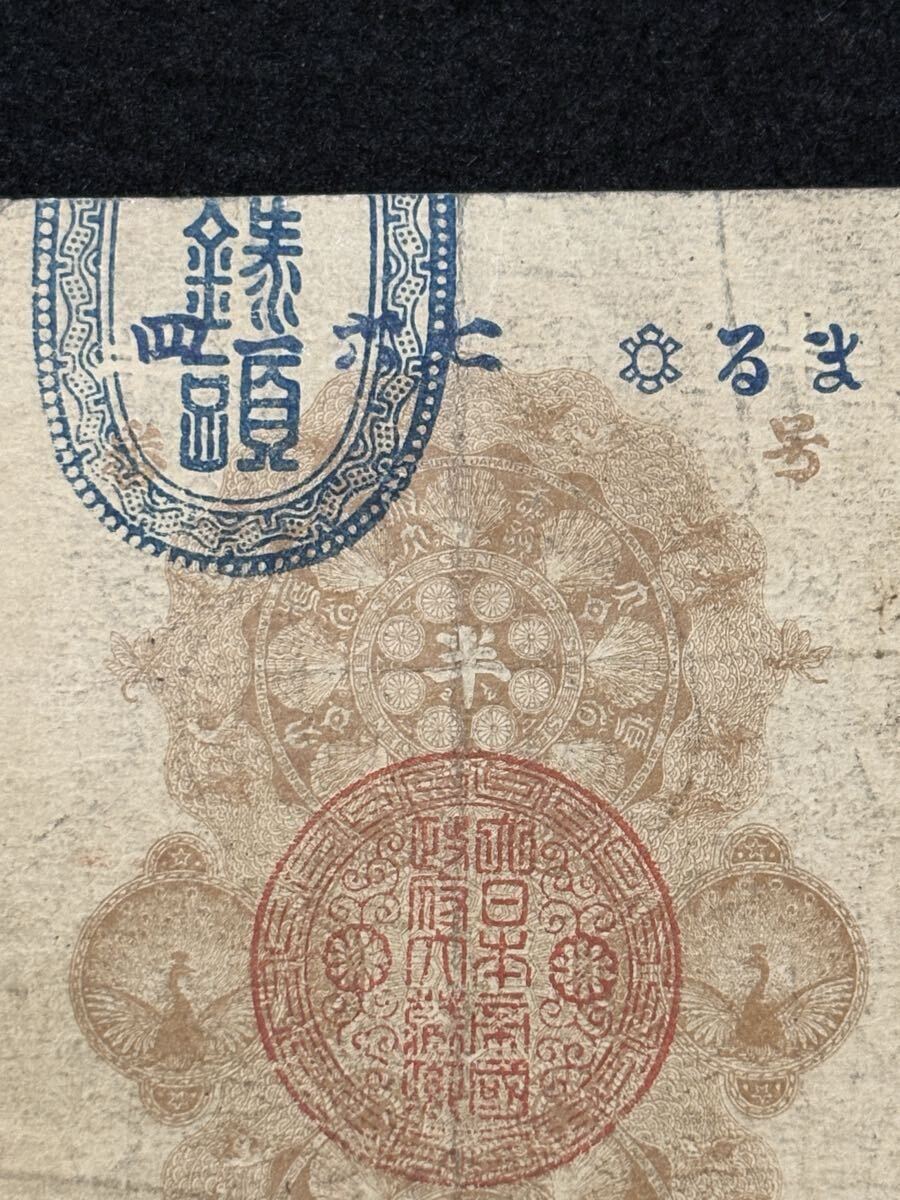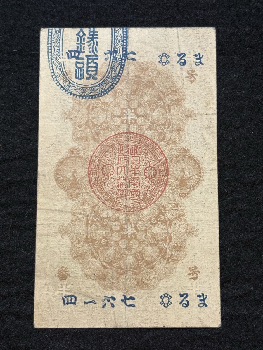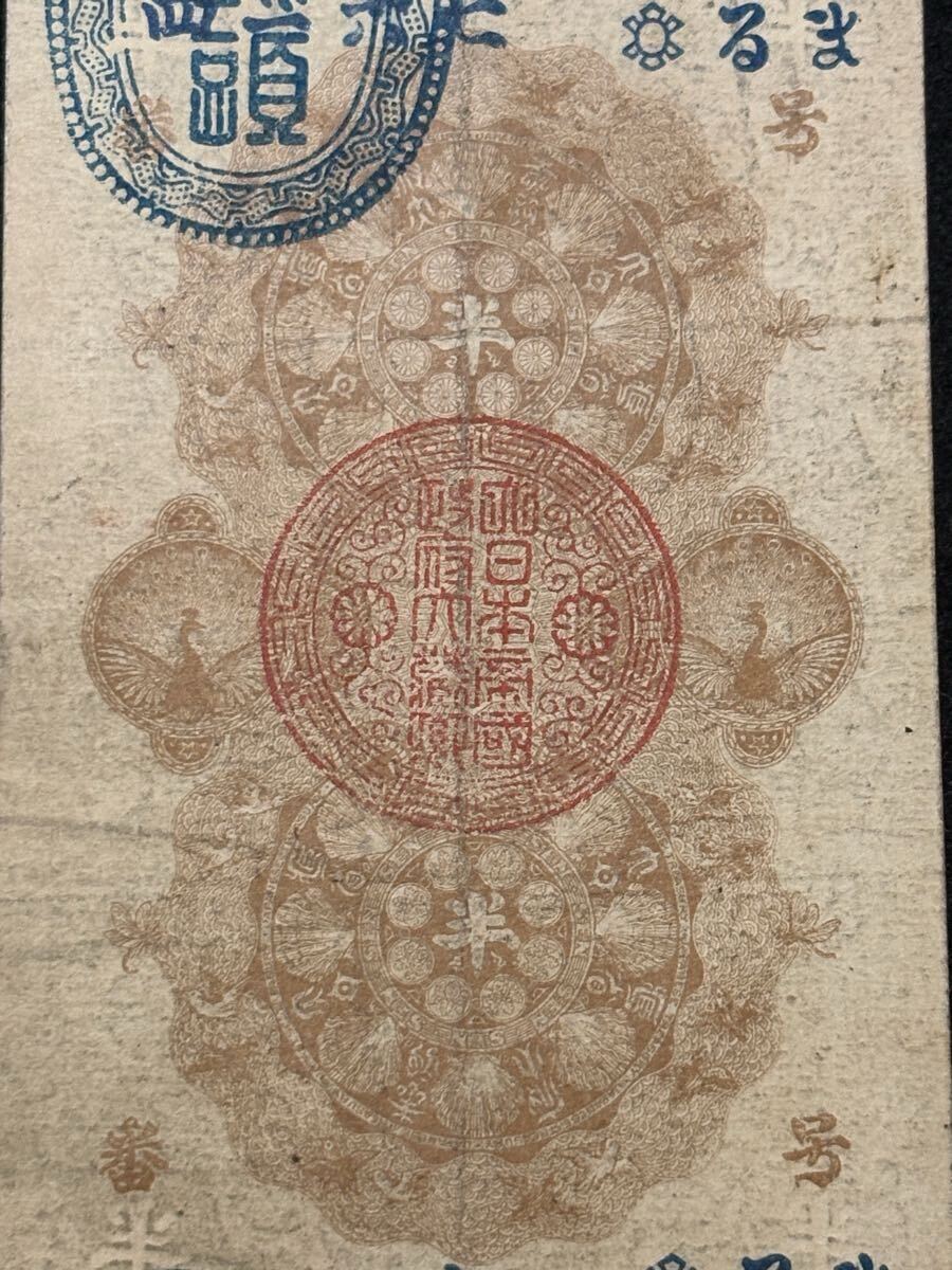 ● 明治通宝の半圓紙幣です。明治通宝は、明治時代初期に発行された政府紙幣で、日本で初めて西洋式の印刷技術を用いて製造された紙幣として知られています。
