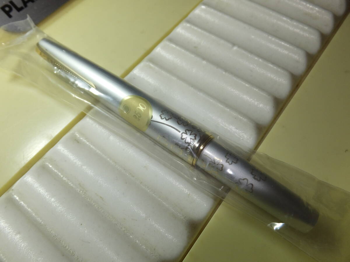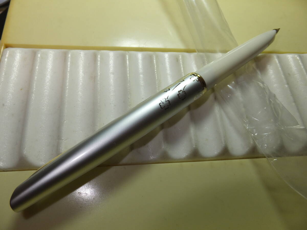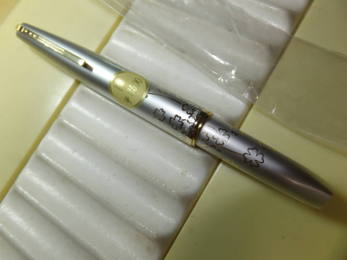 こちらは当時定価2500円。14Kペン先。キャップ、尻部にクローバーのようなの模様が入った女性向け、さわやかなデザインです。文具店でビニール袋に入った状態で長期保管されていたもので、未使用と思いますが保管時の詳細不明のため未使用に近いとさせていただきます。保管時の小傷、劣化、くすみなどあります点ご了承をお願いします。