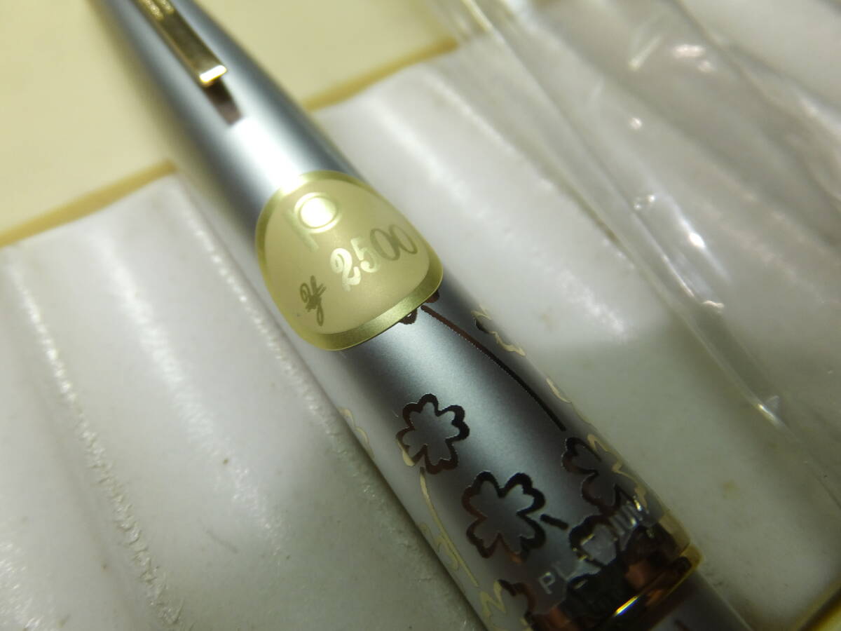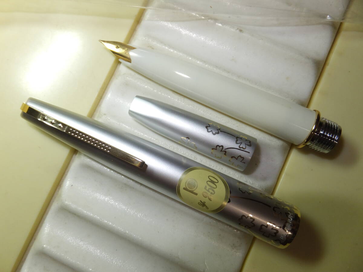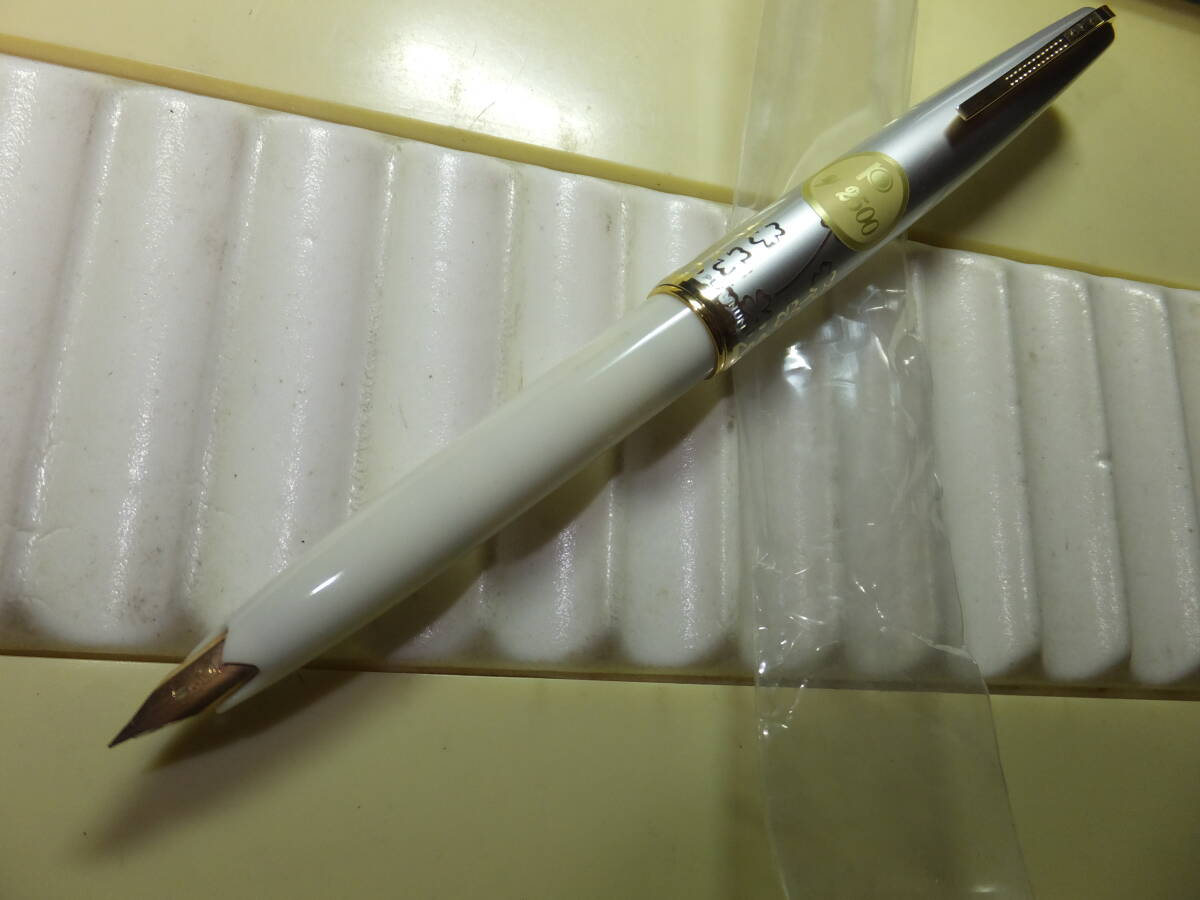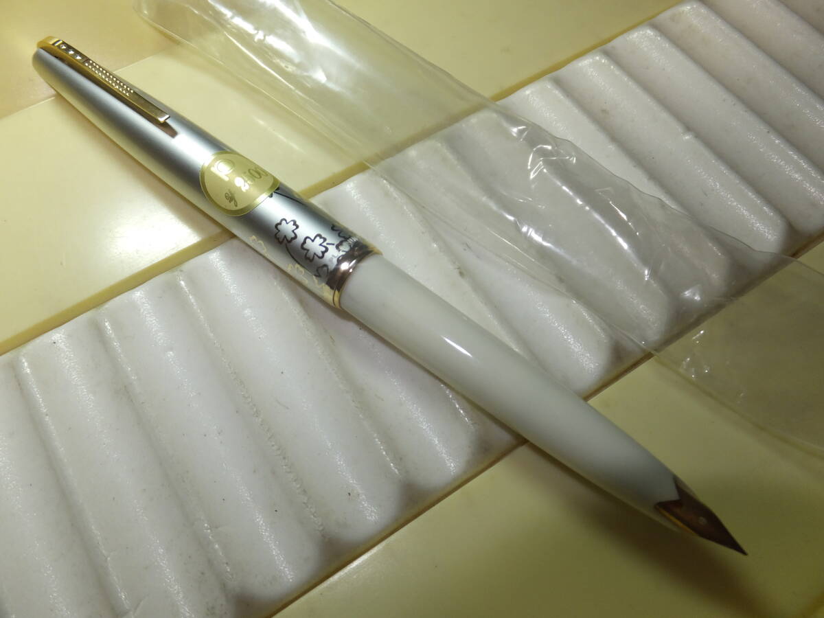 こちらは当時定価2500円。14Kペン先。キャップ、尻部にクローバーのようなの模様が入った女性向け、さわやかなデザインです。文具店でビニール袋に入った状態で長期保管されていたもので、未使用と思いますが保管時の詳細不明のため未使用に近いとさせていただきます。保管時の小傷、劣化、くすみなどあります点ご了承をお願いします。