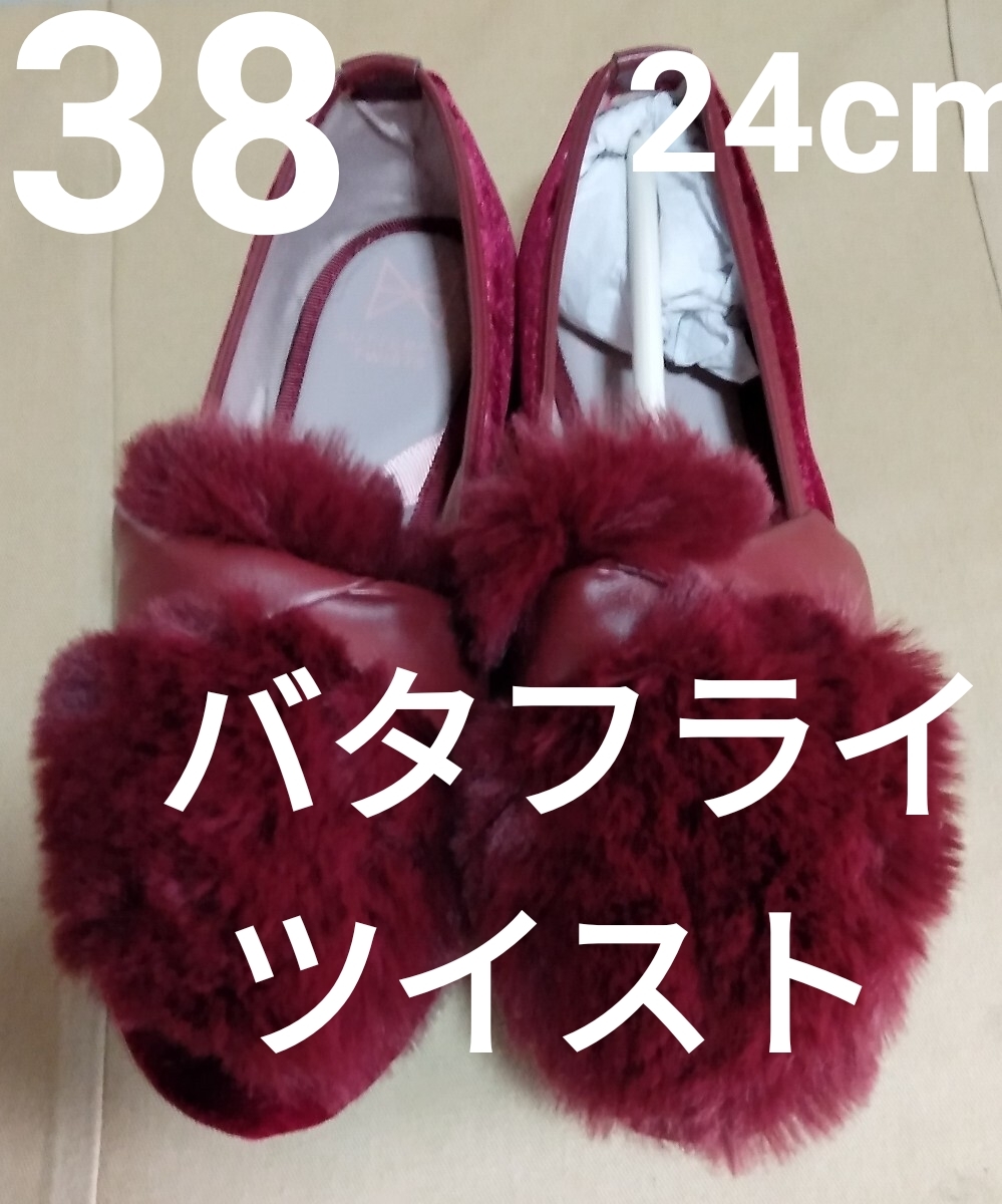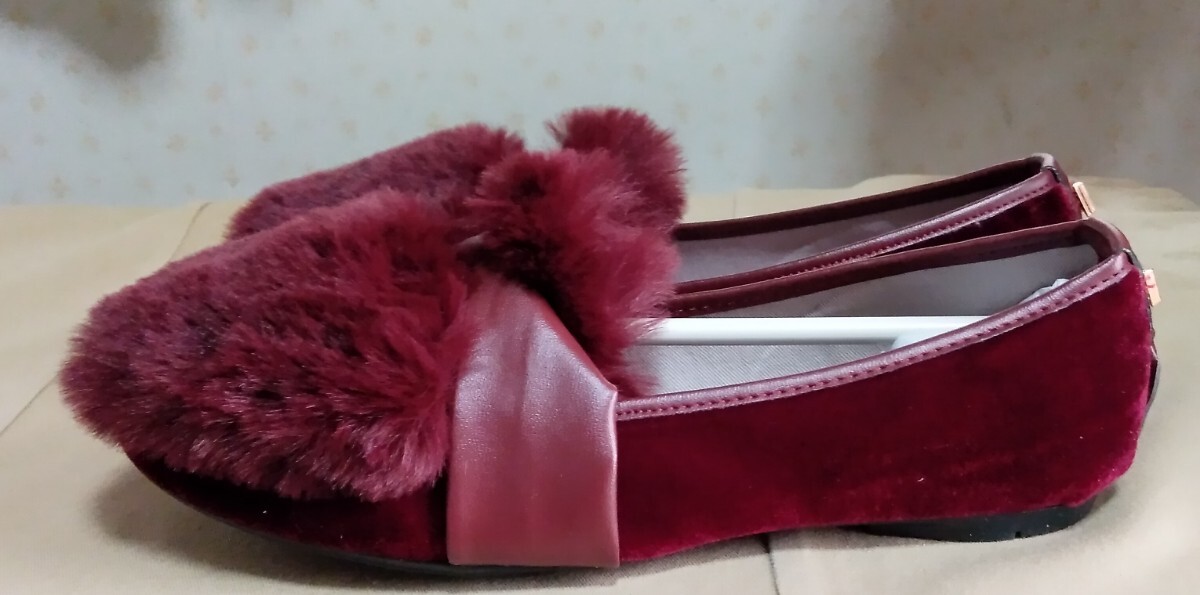 バタフライツイストのフェイクファーとベロアと合皮の異素材フラットシューズです。