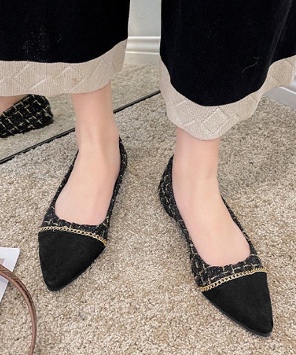 スエード生地とツイード風生地に合金チェーン、上品でお洒落な異素材mixパンプス