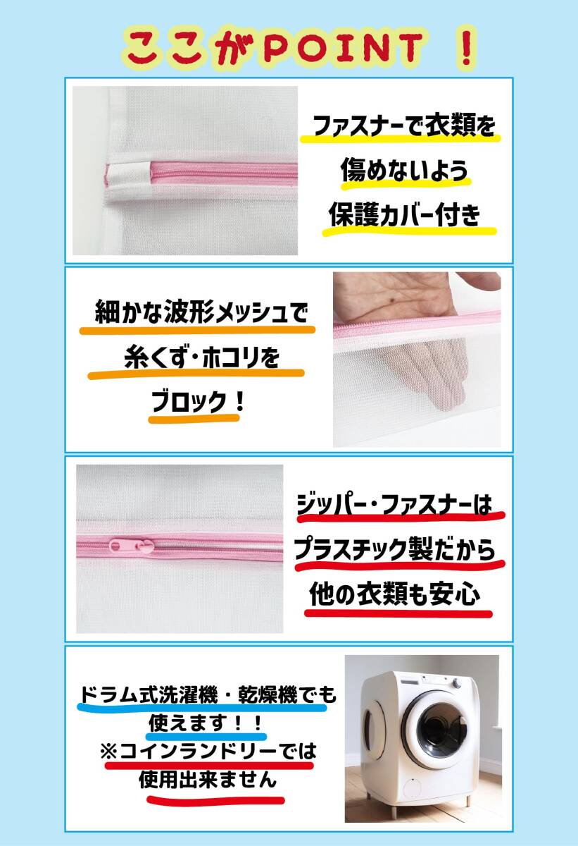 ・【使用上の注意】●本品は家庭での洗濯用ネットです。本来の用途以外でのご使用はおやめください。●洗濯物に表示されている取り扱い絵表示に必ず従ってください。●乾燥機でのご使用はおやめください。●重いものを入れたり詰めすぎたりしないで下さい。●尖った物や鋭利なものを入れないで下さい。●洗濯の際は必ずツマミをファスナーカバーの中に入れ、最後まで閉めて使用してください。●ネットからの出し入れの際はファスナーに引っかけないようご注意ください。●ファスナーは強く引っ張らないでください。破損の原因になります。●火や熱源のそばには置かないでください。●使用後は乾燥させてください。