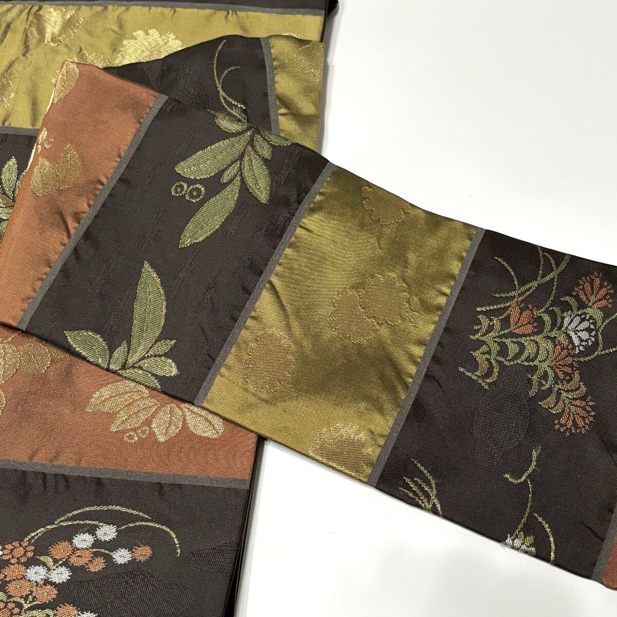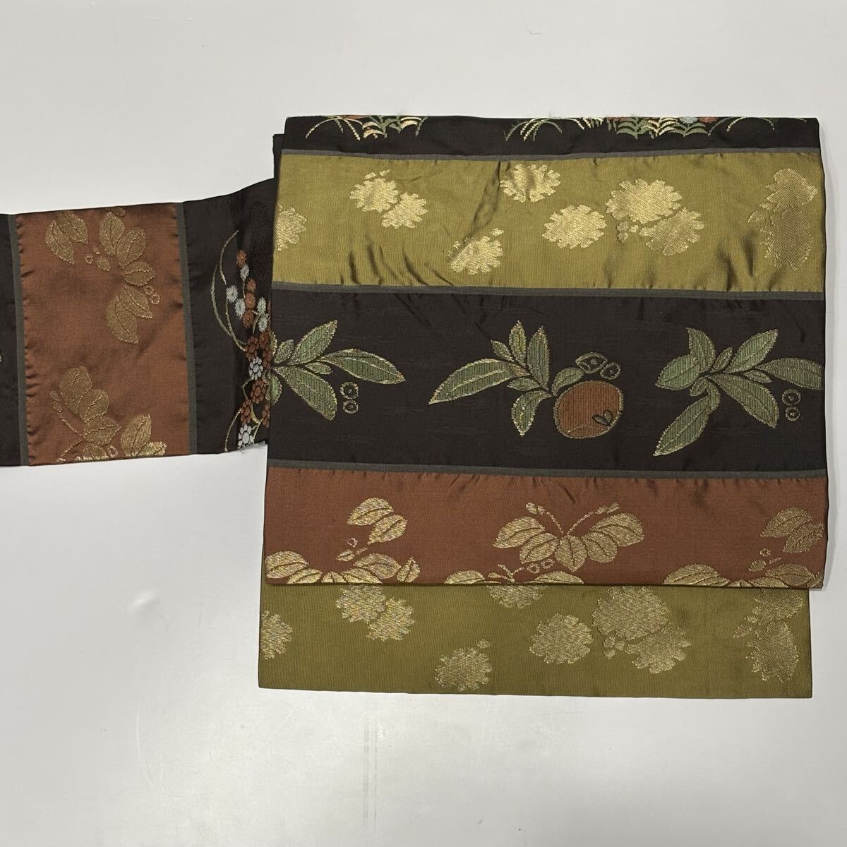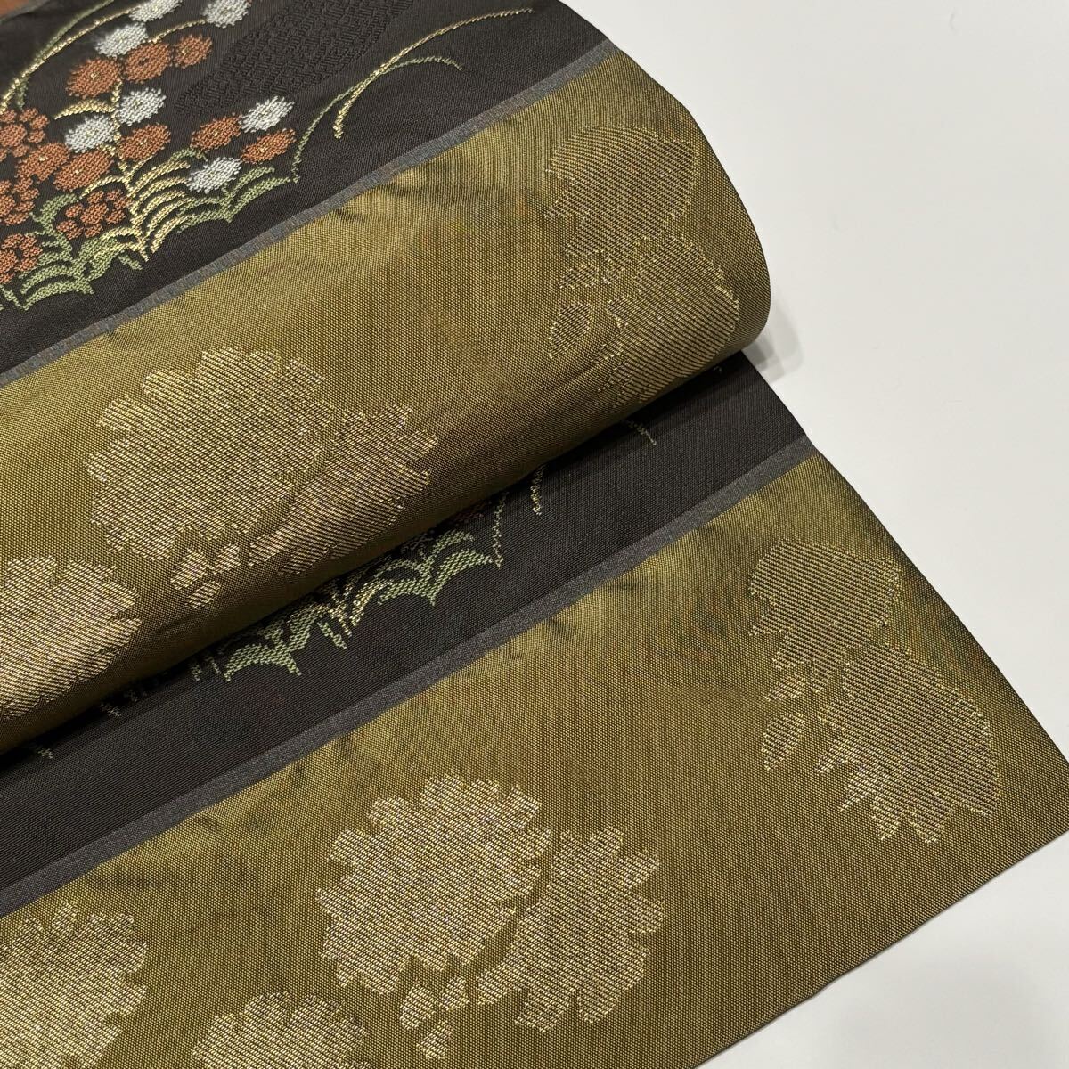 草花柄とカラーの切り替えが印象的で、上品な雰囲気の名古屋帯です。