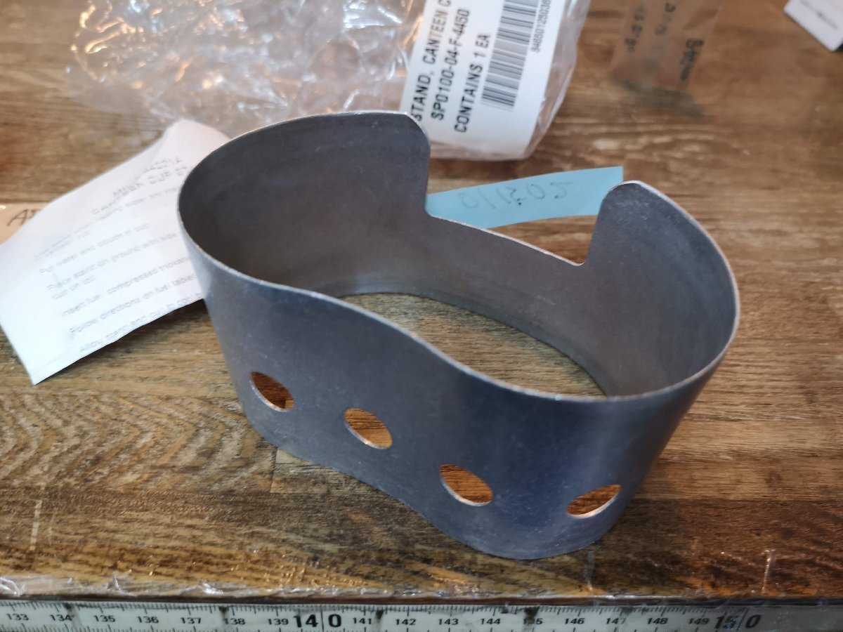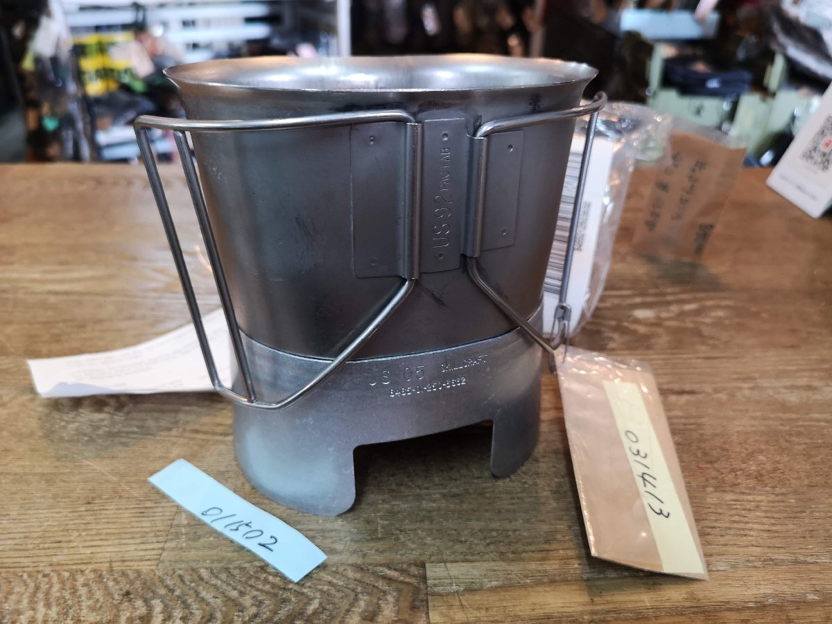 米軍で採用されていたカンティーンスタンドです。 カンティーンや飯盒などのスタンドとして中に固形燃料や小枝などを用いて使用できます。 風防兼五徳として尚且つ軽量でソロキャンプなどにも重宝します。 1枚目の写真はUSのカップとセットした写真です。カップは付属しません。 サイズ:H約6.2cm×W約11.5cm×D約7.5cm程度です、素材:アルミ 沖縄離島を除く全国元払い500円にてお送りいたします。落札価格にプラスでお願いいたします。