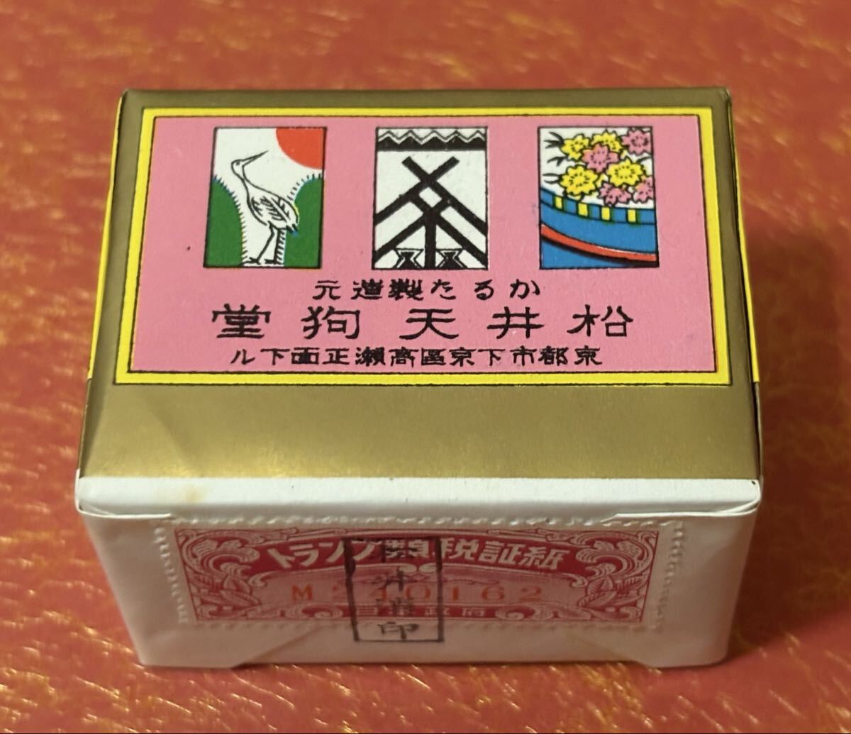 松井天狗堂製の花札は近年特に貴重な存在となっていますが、かなり珍しい未開封品状態の花札です。特に包み紙の下面にトランプ類税証紙が貼り付けられていることからも、かなりの年代品となっています。