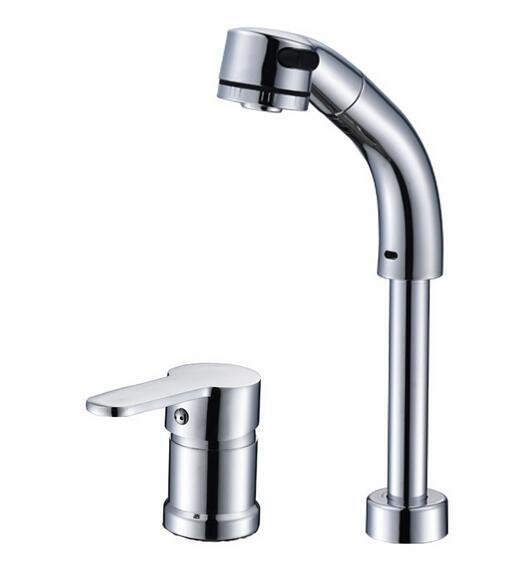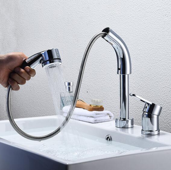 新作 実用 洗面台蛇口水栓2つの水流モード360°回転吐水口昇降ツーホール式洗髪用混合栓2穴台付ホース引き出し式取り付けホース付き