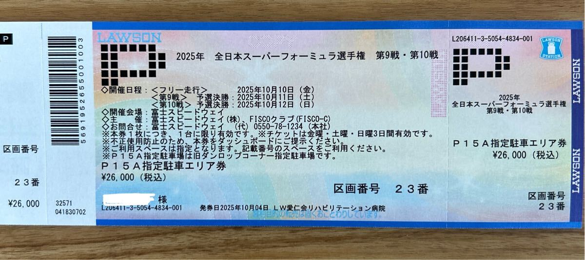 2025年10月10日から12日開催のスーパーフォーミュラ富士ダンロップコーナー駐車券です。
