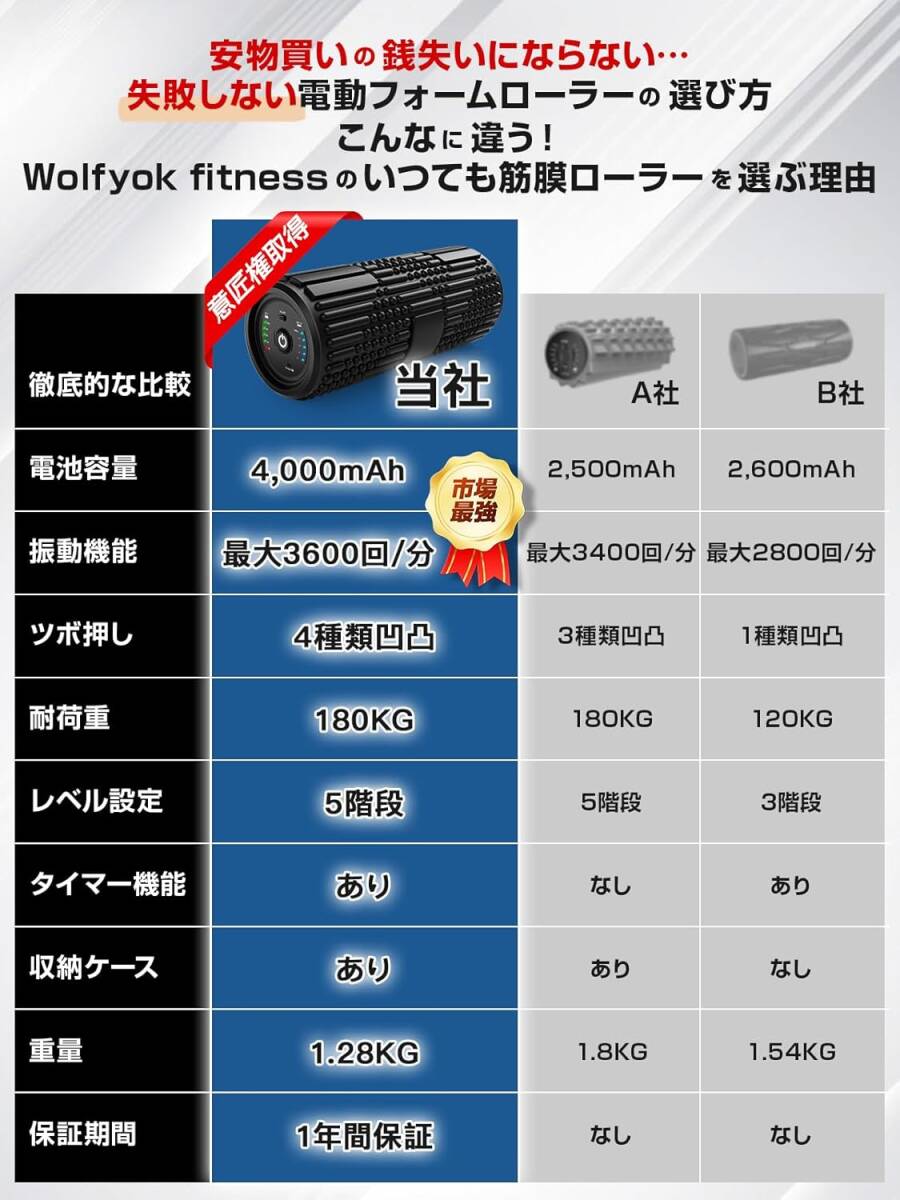 ブラック色 【国内ブランド】Wolfyok fitness フォームローラー 電動 筋膜リリース ローラー 4000mAh 大容量電池 多種類の凹凸