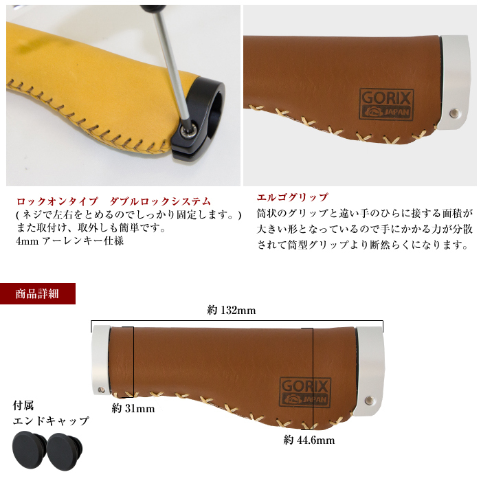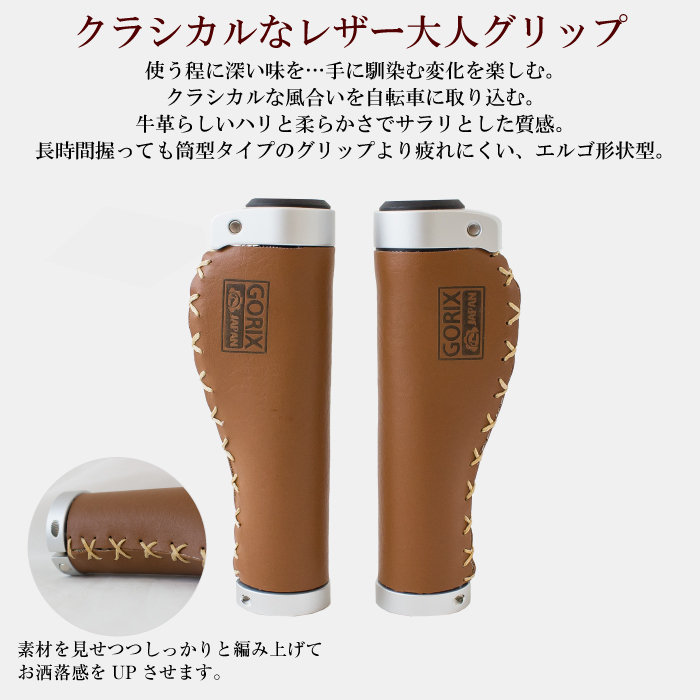 使う程に深い味を…手に馴染む変化を楽しむ。 クラシカルな風合いを自転車に取り込む。 落ち着きある定番のブラウンカラーの牛革素材ハンドルグリップです。 グリップ面には牛革らしいハリと柔らかさでサラリとした質感。 クラシックレトロでも、オシャレで格好良くどのようなカラーでも色合馴染むグリップになります。 ・握り具合はソフト。 ・クロスバイクやミニベロなど様々なフラットハンドルの自転車に最適なグリップです。 ・固定力が強く、脱着も簡易なダブルロックオンタイプ。 ・エルゴ形状なので長時間握っていても筒型タイプのグリップよりも疲れを軽減。 エンドプラグ付属 重量:約180g(ペア) カラー:ブラウン 茶 サイズ(約):長さ132mm 材質:牛革 《ご注意》 ・【初期不良の場合】 到着後3日以内にご連絡頂いた場合商品保証させて頂きます。 (3日以内にご連絡頂けない場合はご対応出来なくなります) ・商品は入荷によりキズがある場合があります。 保証対象外になりますのでご了承お願い致します。 ・ディスプレイ環境により実物と色が異なる場合が有ります。 ・入荷時期により予告無く一部仕様変更する場合が有ります。 | |