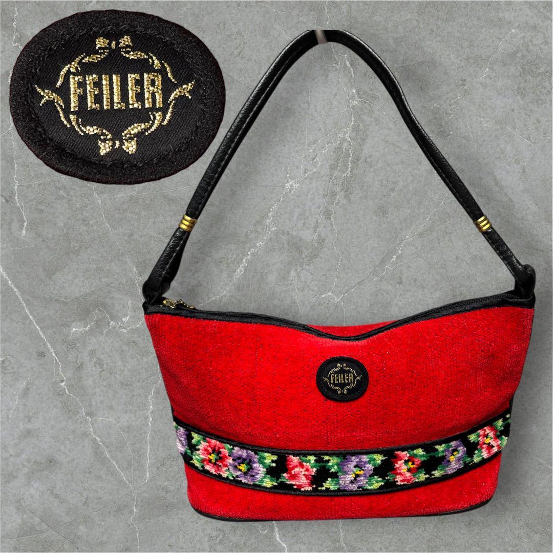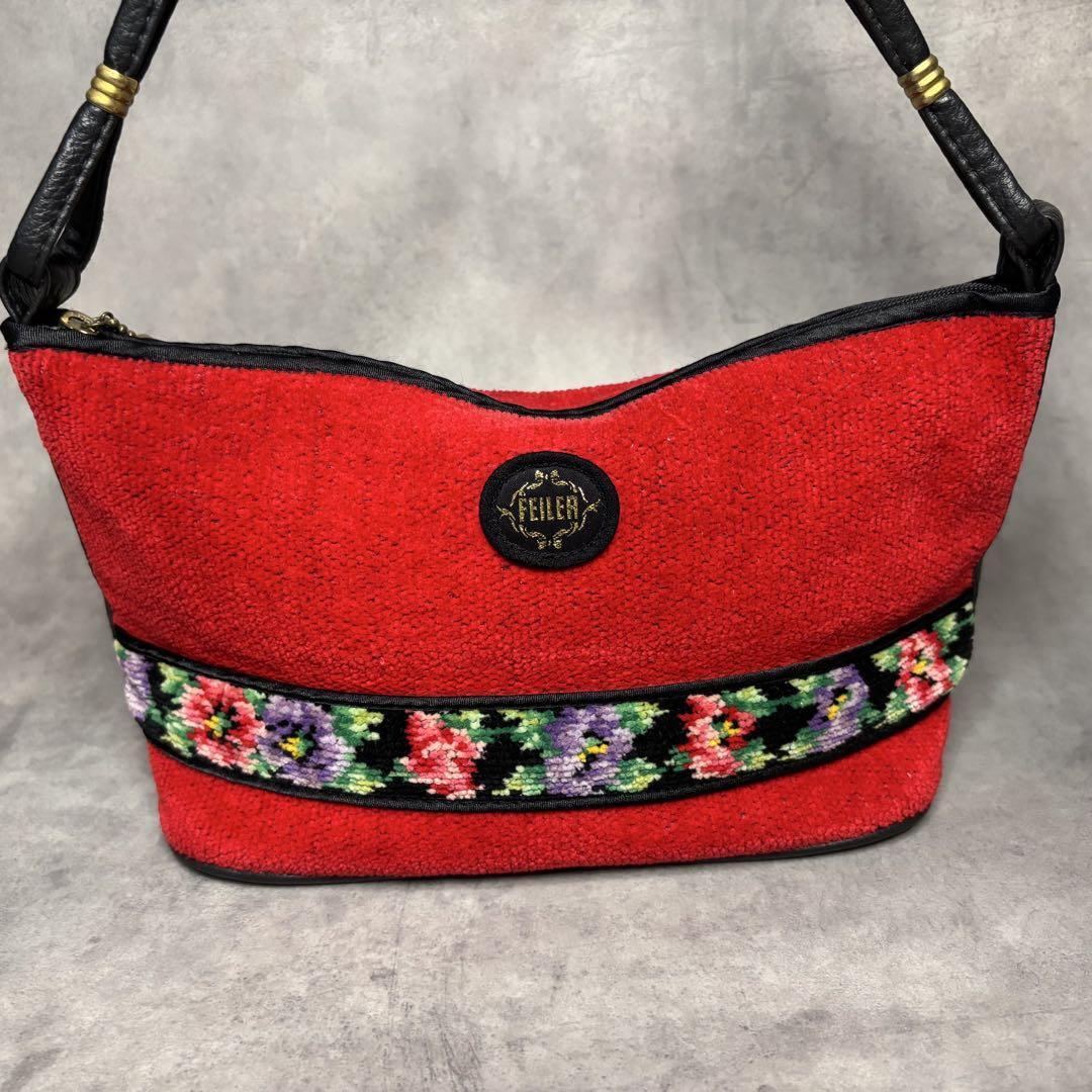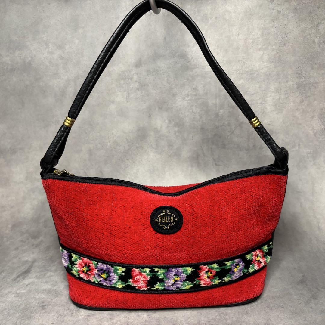 FEILER フェイラー ヴィンテージ ショルダーバッグ ハンドバッグ 赤×花柄 刺繍デザイン