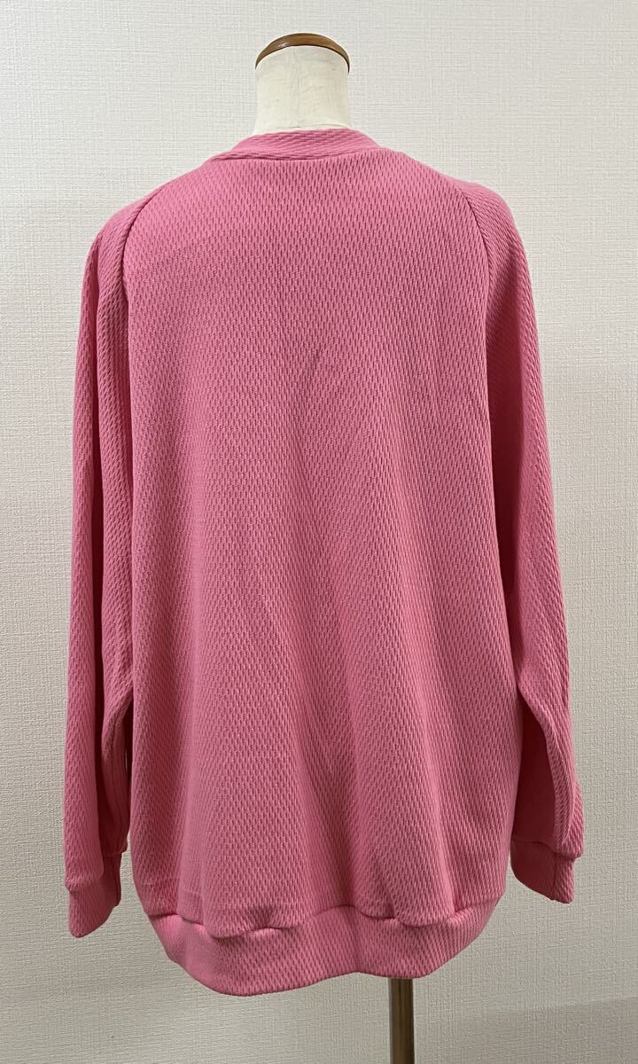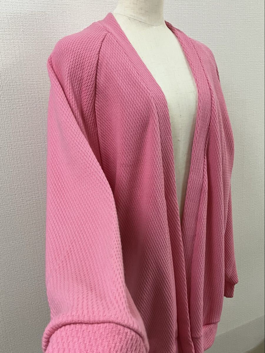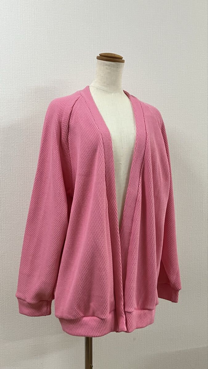 お色はピンクのニットです。ラグラン袖でざっくり大きめのサイズ感が着やすい♪しっかりしたニット素材でコートとカーディガンの間の厚めな流行りのコーディガンです。重みもあり暖かいので肌寒い日に1枚ダバっと着るのにおすすめ!お尻も隠れる安心丈で体型カバーのOK!ビビットなピンク色と全体的に大きめなサイズ感が可愛いです♪ボタン等はありません。透け感なし伸縮性あり