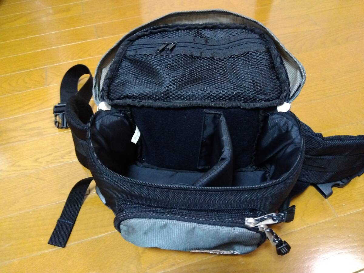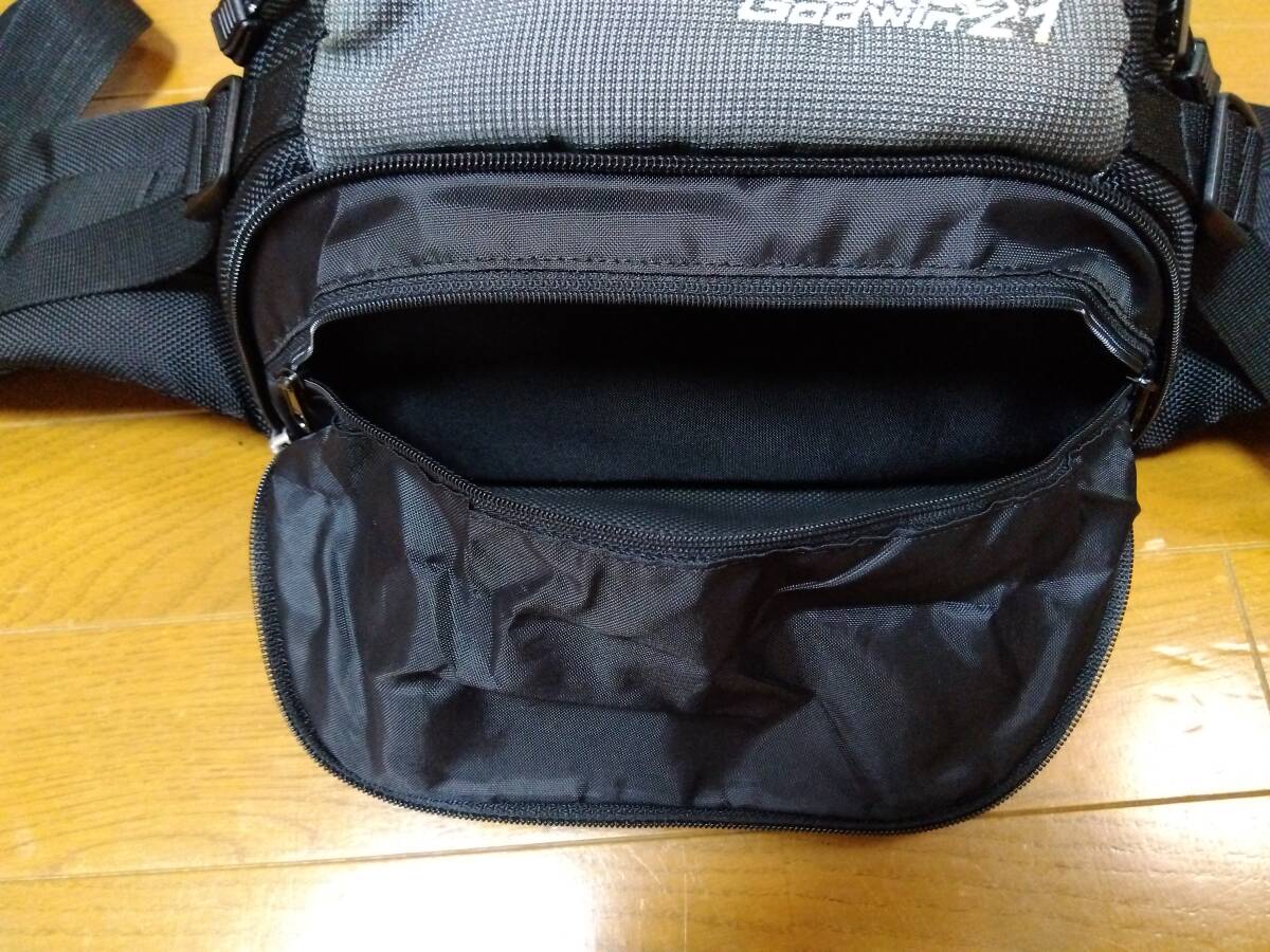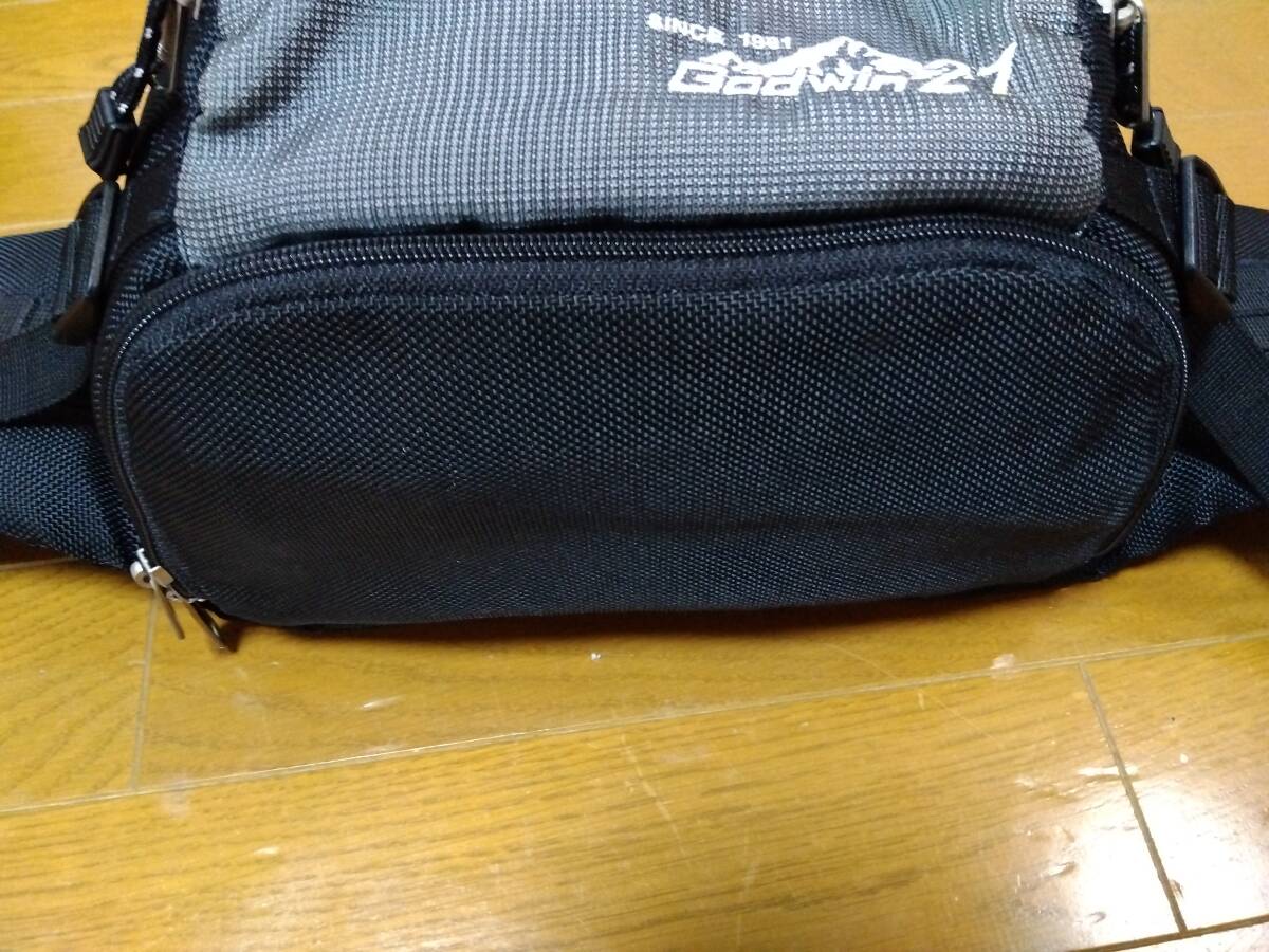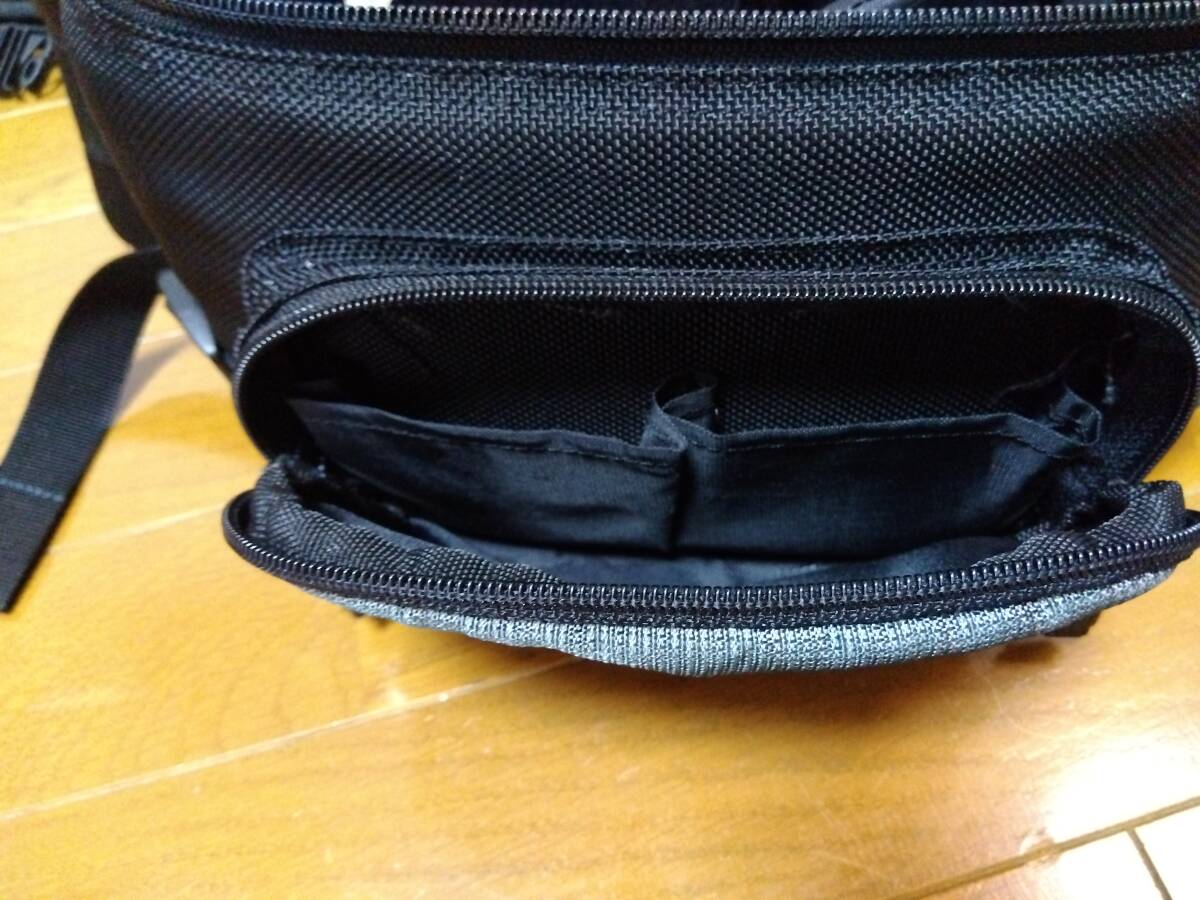 ○下部 ファスナーを開けると下に小物入れがあるので、ペットボトルや財布など収納できます。普段は閉まっておけます。