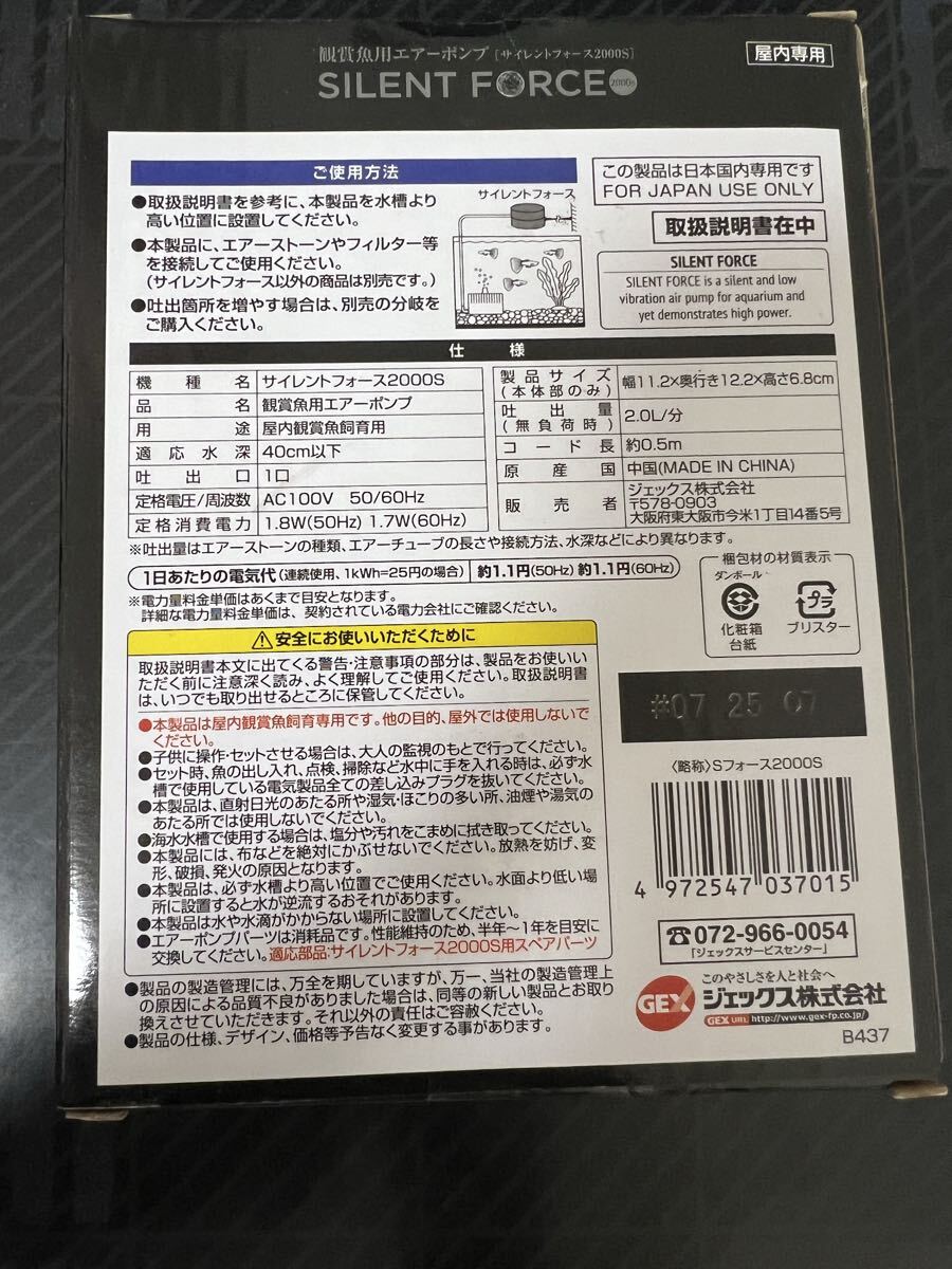 商品名:新品未使用 GEX サイレントフォース 2000S エアーポンプ 低振動静音 ~60cm水槽