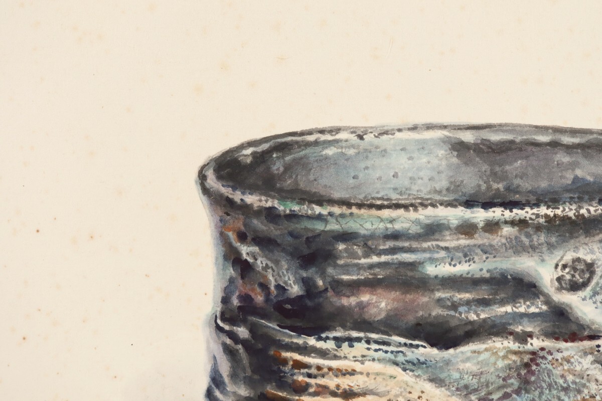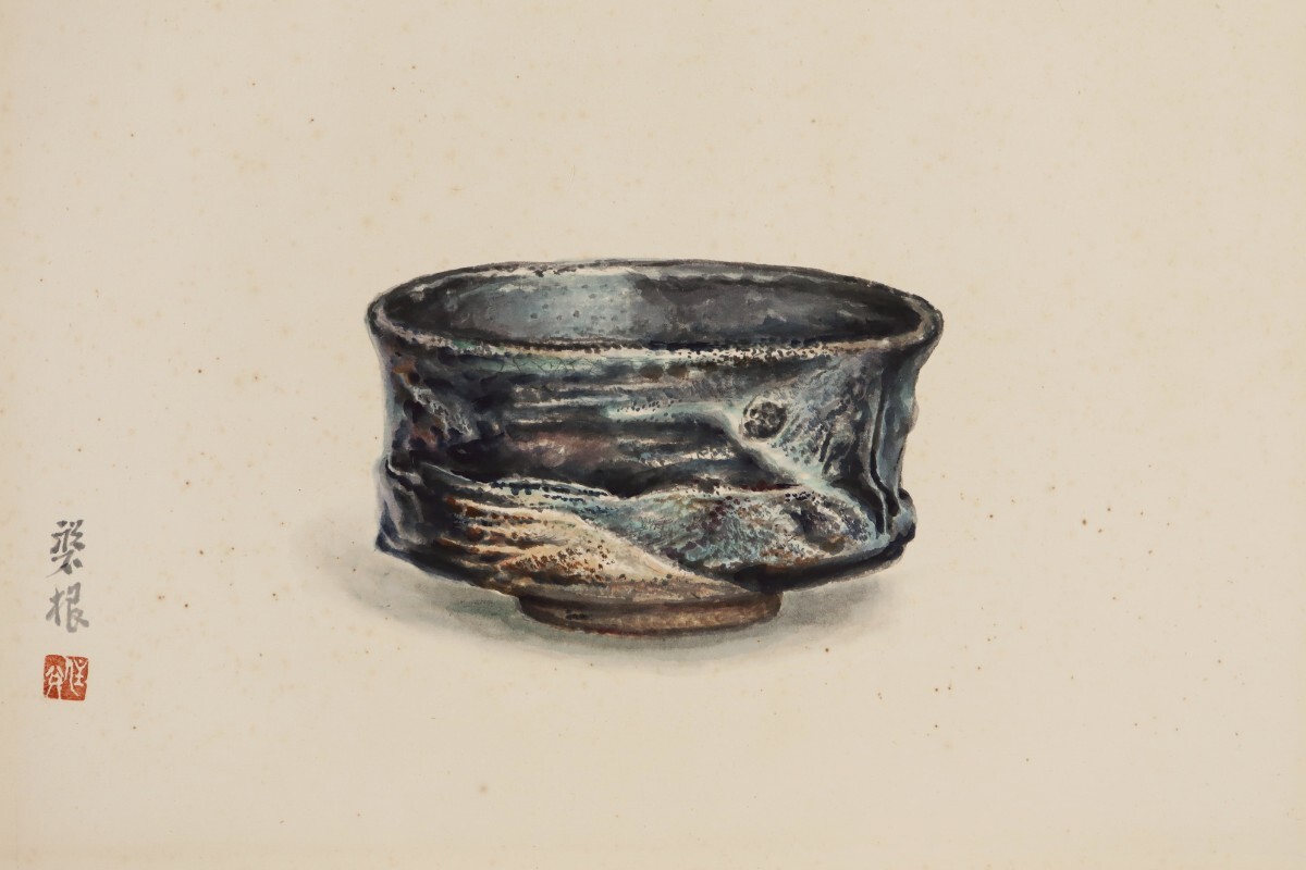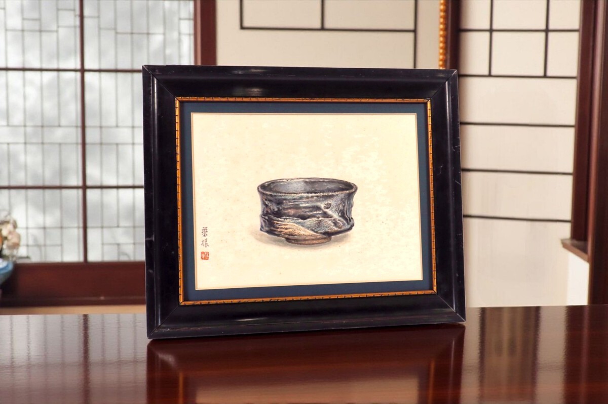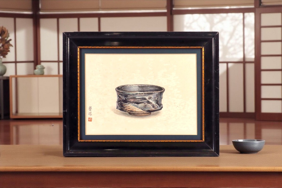真作 住谷磐根 日本画「茶碗」画寸 38.5×29.5cm 群馬県出身 牧野虎雄に師事 黒釉が持つ深い陰影が時間の流れと手仕事の温もり感じる 11561