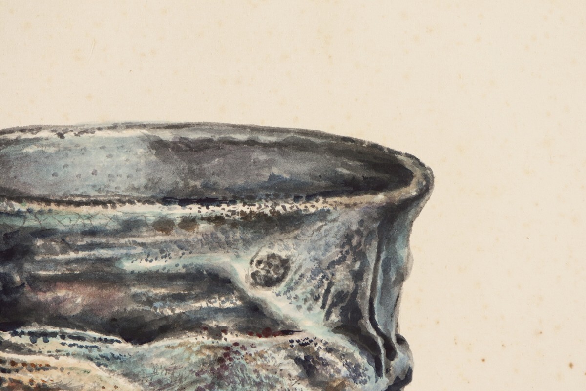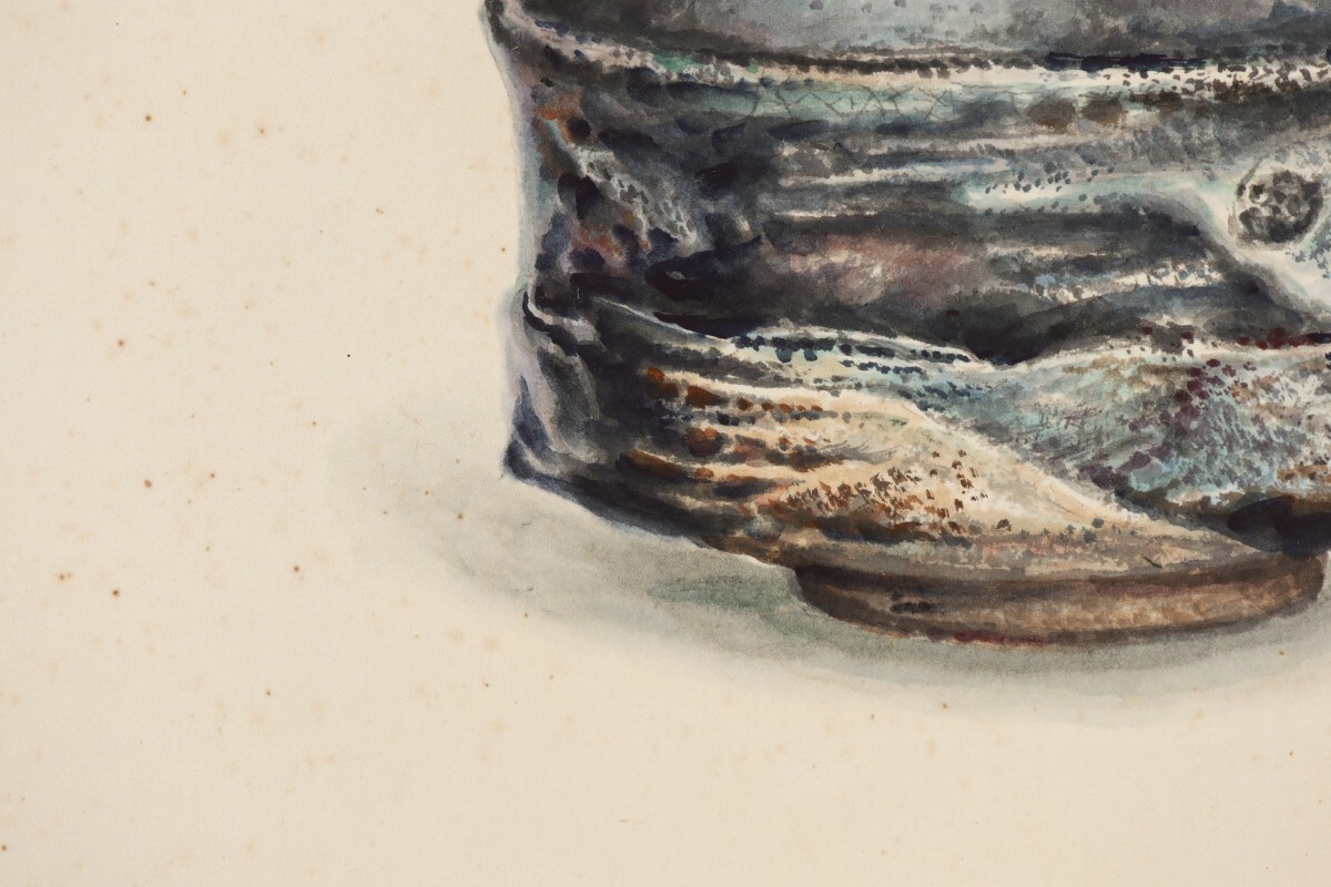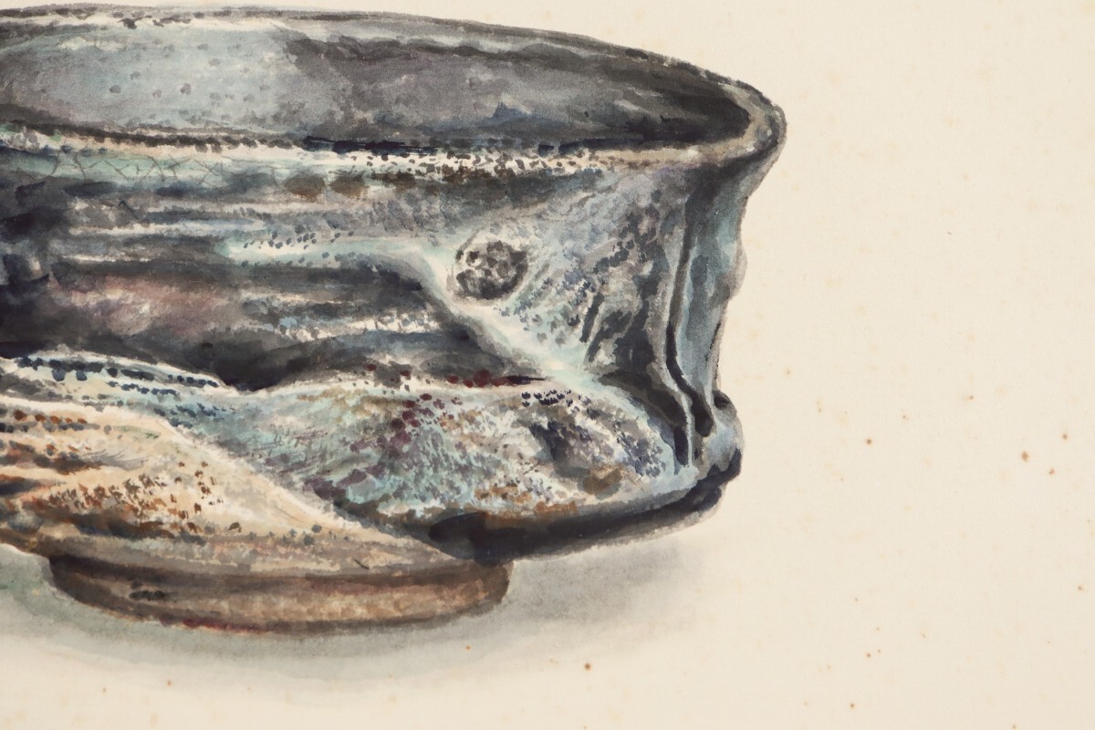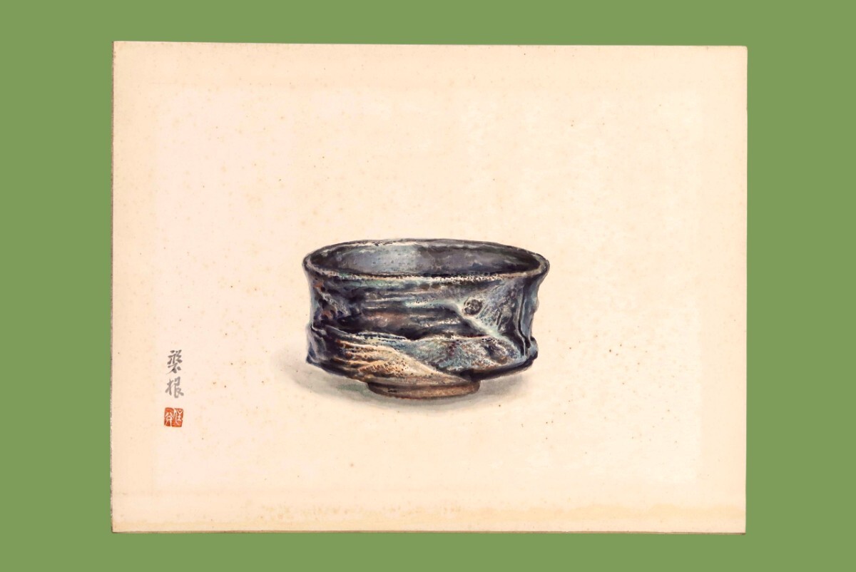真作 住谷磐根 日本画「茶碗」画寸 38.5×29.5cm 群馬県出身 牧野虎雄に師事 黒釉が持つ深い陰影が時間の流れと手仕事の温もり感じる 11561
