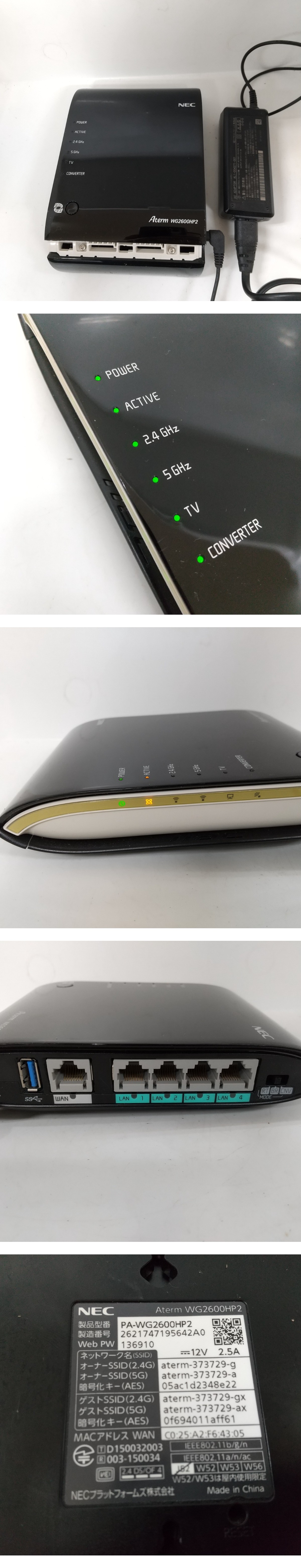 | ※必ず最後までお読みください。 Please be sure to read to the end. 一定要到最后※ | 商品概要 | 数あるオークションの中からこちらの商品をご覧頂きまして誠にありがとうございます! ※商品説明と注意事項を必ず全てお読み頂いた後にご入札下さい※ 引き続き 安心できる気持ちの良いお取引を心掛けてまいりますのでどうぞ 宜しくお願い致します! 色んなジャンルの商品を多数出品しておりますので、 こちらをクリックしてご覧ください!! ◎NEC◎Aterm WG2600HP2 Wi-Fiルーター PA-WG2600HP2 通電確認済 即発送 ※最下部にも写真掲載中なので必ずご覧下さい。 【商品概要】 ・高速通信: 5GHz帯で最大1733Mbps、2.4GHz帯で最大800Mbpsの通信速度に対応しています。 ・4ストリーム(4×4): 5GHz帯と2.4GHz帯の両方で4ストリーム通信に対応しており、多くの端末を接続しても安定した高速通信が可能です。 ・ビームフォーミング: 対応するWi-Fi端末を自動で検知し、その端末に向けて電波を集中させることで、電波強度を向上させます。 ・MU-MIMO: 複数の端末と同時に通信できる技術で、複数台の端末が同時にWi-Fiを利用しても高速通信が可能です。 ・デュアルバンド中継機能: 親機だけでなく、子機や中継機としても利用でき、5GHz帯と2.4GHz帯を利用して最適な中継接続が可能です。 ・子ども安心ネットタイマー: 端末ごとに接続時間を設定できる機能です。 公式サイト⇒こちらをクリックしてご覧ください!! ユーザーズマニュアル 公式サイト⇒こちらをクリックしてご覧ください!! 【状 態】 写真をよくご確認お願い致します。外装ランク:(N-S) 【詳細・備考】 ※立てるための支え(足)が一つ欠品です。 写真に写っているものが全てになります。 また、タイトルや本文と写真が異なる場合は写真を正とします。 保管品なので状態判断には個人差があることを予めご了承の上 写真にてご確認ご判断をお願い致します。 譲り受けたお品で当方は専門店ではないので詳細の質問にはお答えできかねます。 また簡単な検品は行っていますが、譲り受けた商品のため欠品等見落としがある場合がございますので保証等はしかねます。 ※返品不可が入札条件となります。 ※中古現状とは動作未確認のジャンク品になります。 ※通電確認とは電源に繋げてONOFFの確認のみになります。 ※バッテリーや電池は消耗品なので経年劣化がある場合もあることをご了承お願い致します。 ※保管品に関しては未使用でも新品ではございませんので、保管期間による劣化等ある場合もございますので、新品をお求めの方はご入札をお控えください。 ※ジャンク品ではなくても中古品の性質上、配送途中や到着後に万が一不備不良が起きうる場合もございますがも保証はできかねますので、返金返品不可をご了承の上ご入札お願い致します。 ※未開封品に関しては中の状態が不明な為、不具合等ございましたらメーカーとご相談お願い致します。保証対象外とさせて頂きますのでこちらでは対応いたしません。 尚、実際の色とパソコンや携帯の画面を通じた色彩は異なる場合もございますのでお気をつけ下さい。 =外観ランク表記= (N)長期保管/未使用品(新品ではございません) (S)数回程度使用の美品 (A)多少の傷、若干の使用感がありますが程度良好の美品 (B)一般的な使用感あります。 (C)汚れ、使用感を感じるがまだまだ使える品物 (D)汚れ、使用感等が見受けられる難有品 (E)ジャンク品 ※大体の目安としてお考え下さい。 新品に近いものをご希望の方や神経質な方のご入札はご遠慮下さい。 ご入札頂いた時点で本文説明文に了承を頂き、商品にご納得して頂いたと当方で判断させて頂きますので 【ノークレーム・ノーリターンがご入札の条件となります】 また、弊社のオークションでは いろんなジャンルで多数出品しておりますので是非ご覧ください(^_-)-〇 ![]() ▶入札の取り消しは受け付けておりません。 落札後の質問やキャンセルも受け付けておりません。 尚、営業時間が9-18時となっておりますのでオークション終了間際や質問内容によっては返答できない場合がございます。 ジャンク商品に関してはいかなる場合も返品返金の対応はできかねます。 落札後のサイズ違いやイメージ違い等のキャンセル、クレーム、返品等はお受けできませんので予めご了承ください。 ご入札の方につきまして、当方にて評価が著しく悪いと判断した場合は、トラブル防止の観点からご入札を取り消させていただく場合がございますので予めご了承ください。 新規IDの方や、いたずら入札と判断した場合、入札削除させていただく場合がございますので、新規の方は質問欄にて購入意思を示してからのご入札をお願い致します。 ※ヤフオクの障害等で入札が不適切に成立した場合は落札された場合でも削除対象になりますことを予めご了承お願い致します。 取り置きは可能ですが物や金額によってはすぐに決済をお願いする場合がございます。 当方大量の商品を管理している為、複数落札の同梱ご希