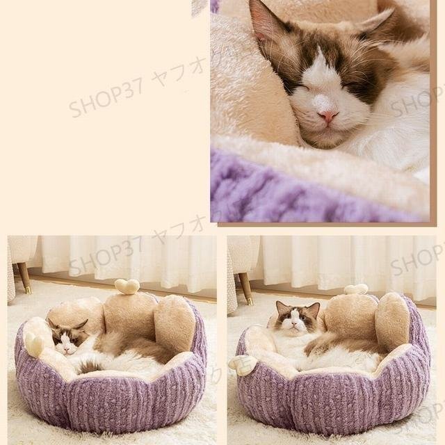 猫や小型犬に適した居心地のペットベッドです。ペットが楽に出入りできるようにデザインしております。 安心な素材を使用しております。柔らかい生地のフチは空間を暖かくし、ペットが頭を乗せられる快適なヘッドレストとしても機能します。柔らかい生地で空間を暖かくし、手足が伸ばしやすく,もっちりとした感触の柔らかベッドがネコと犬の体をやさしく包まれ、ふんわり支えます。 底面には滑り止めのドリップモールドを施し、湿気を防げ、摩擦抵抗を増加させ、ベッドが滑りにくくなっています。