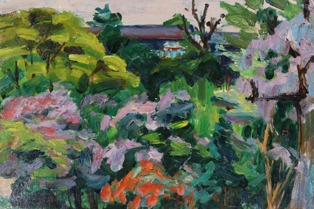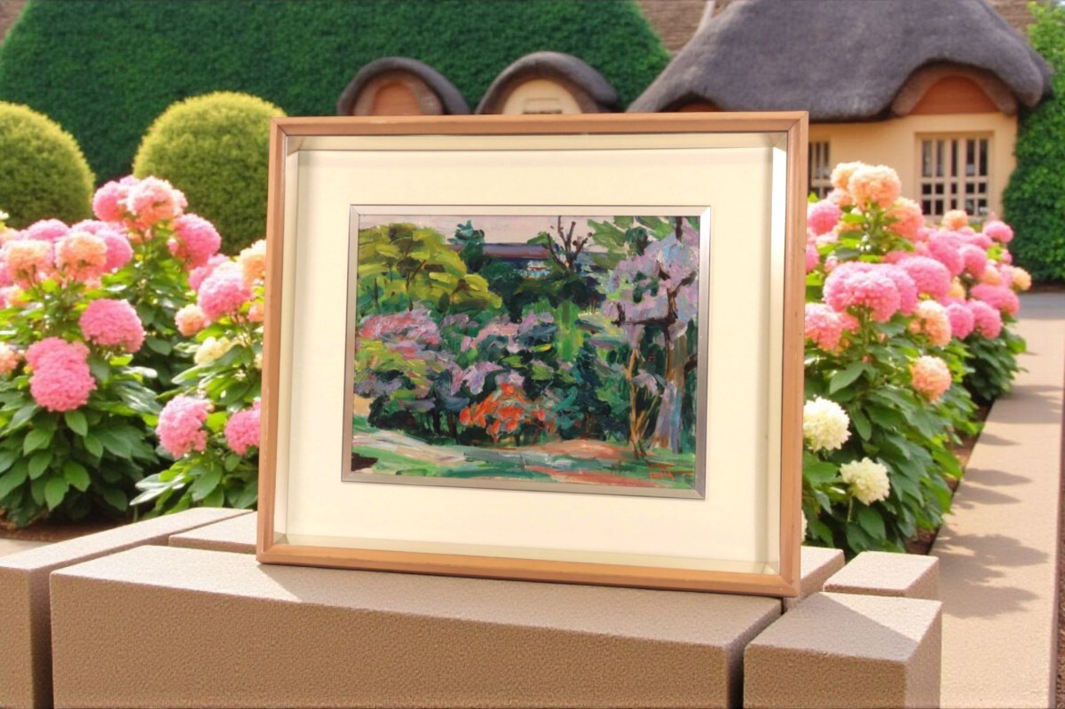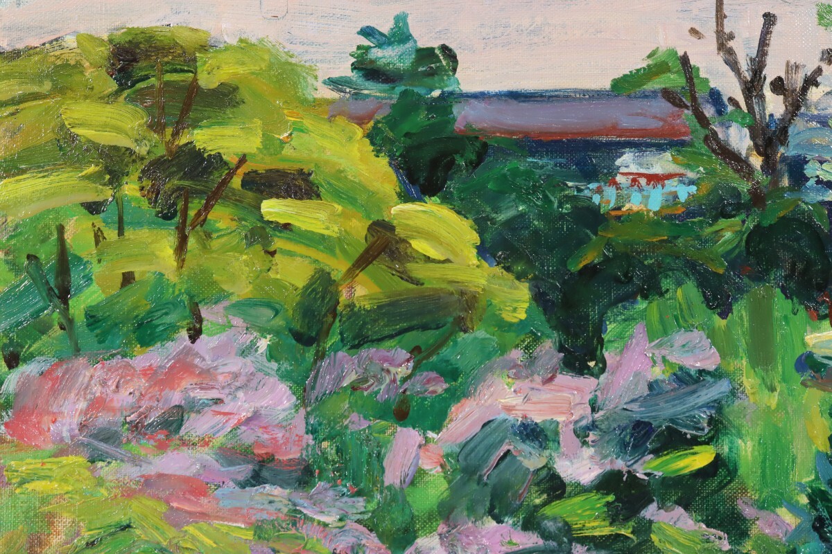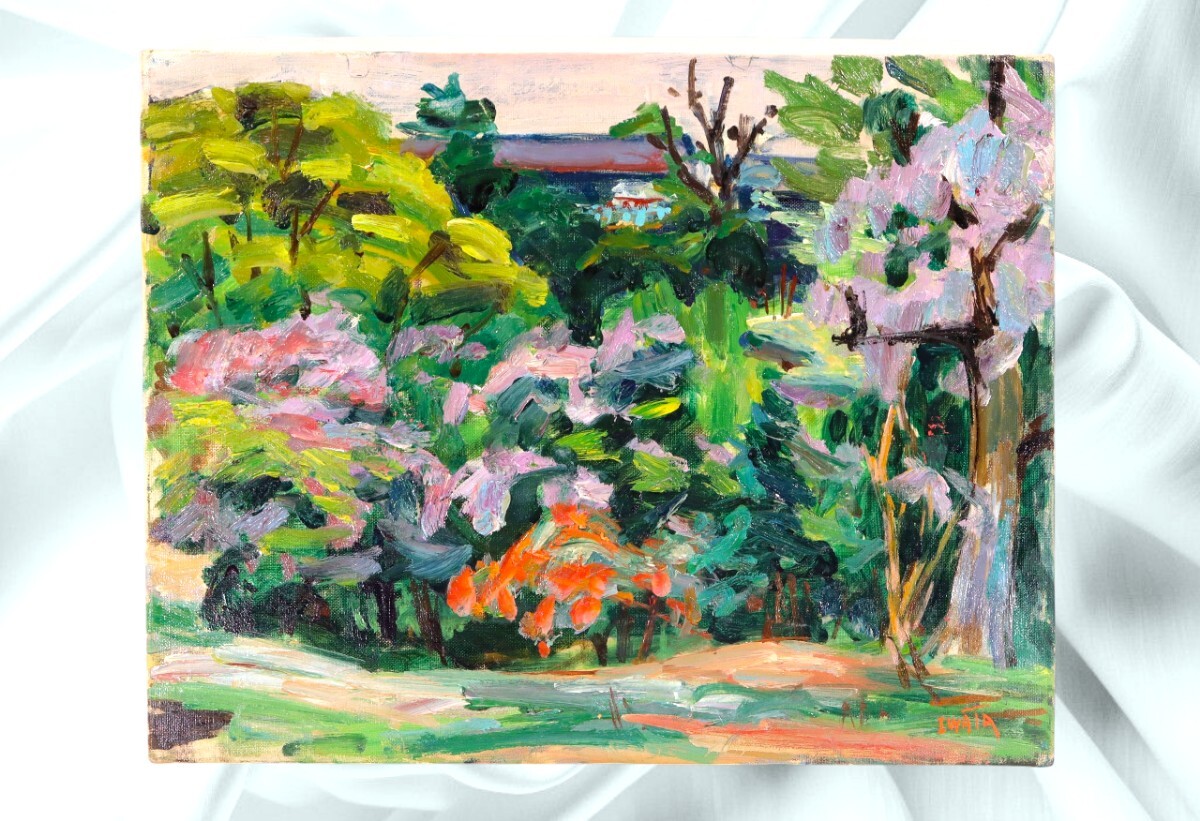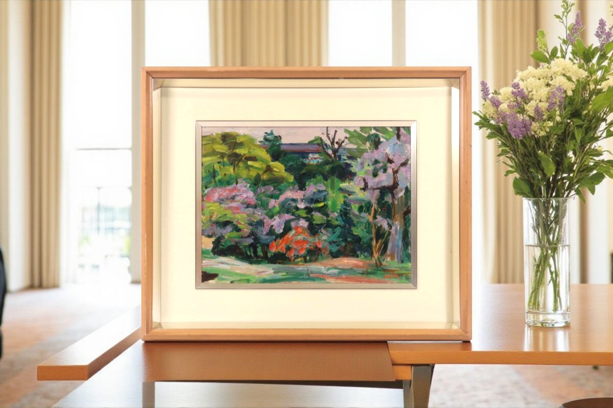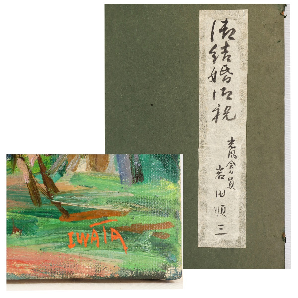 真作 岩田順三 油彩「新緑風景」画寸 F6 大阪府出身 光風会員 鮮やかな筆致と力強い色彩 生命の息吹と祝福 新緑と花々が織りなす風景 11564