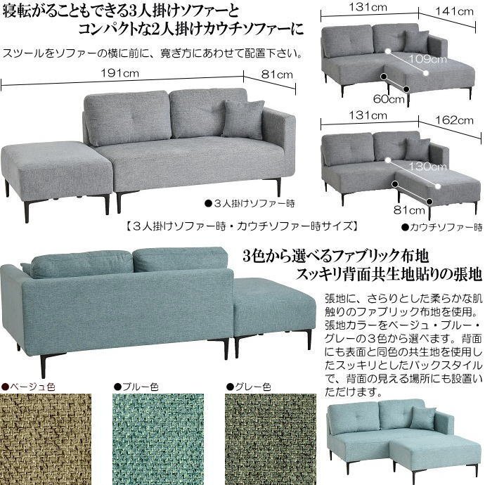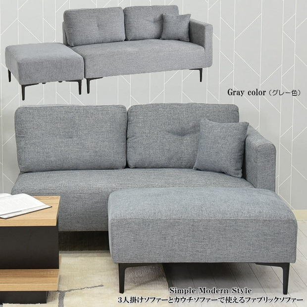 | 【商品名】 | 3人掛けソファーとカウチソファーで使えるスツール付片肘2人掛けソファー (グレー色) |