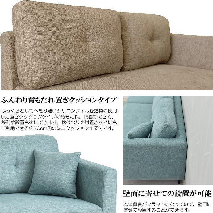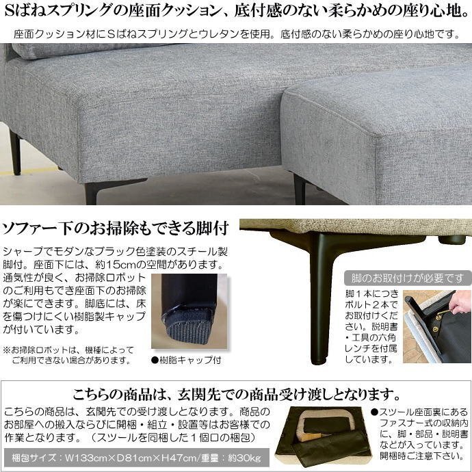 | 【商品特徴】 | ・片肘2人掛けソファーにワイドスツールが付いた2点セット。スツールをソファーの横に配置して3人掛けソファーに、スツールを前に配置して2人掛けカウチソファーにとご利用できます。 ・ふっくらとしてへたり難いシリコンフィルを詰物に使用した置きクッションタイプの背もたれ。脱着ができて、移動や設置も楽にできます。 ・枕代わりや肘置きなどにもご利用できる約30cm角のミニクッション1個付です。 ・本体背裏がフラットになっていて、壁面に寄せて設置することができます。 ・座面クッション材にSばねスプリングとウレタンを使用。底付感のない柔らかめの座り心地です。 ・シャープでモダンなブラック色塗装のスチール製脚付。座面下には、約15cmの空間があります。通気性が良く、お掃除ロボットのご利用もでき座面下のお掃除が楽にできます。脚底には、床を傷つけにくい樹脂製キャップが付いています。 ・ローバックタイプの背もたれで総高は71cm。幅131cmのコンパクトサイズでお部屋に圧迫感が少なく、奥行81cmの省スペースタイプの片肘2人掛けソファーです。 ・座面サイズ81cm×60cmのワイドサイズスツールです。足置きのオットマンとしてもご利用できます。 ・和風・洋風どちらにもあわせやすいシンプルなデザインです。 ・張地に、さらりとした柔らかな肌触りのファブリック布地を使用しています。 ・背面にも表面と同色の共生地を使用したスッキリとしたバックスタイルで、背面の見える場所にも設置いただけます。 ・2人掛ソファーとスツールともに、お客様で脚のお取付が必要となります。(説明書・工具の六角レンチを付属しています。) |