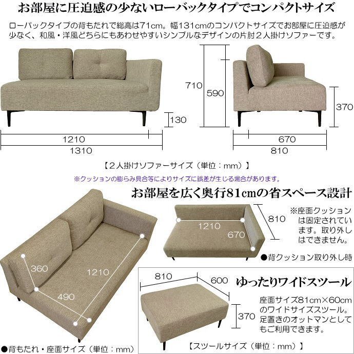 | 【サイズ】 | 2人掛けソファー:幅1310mm×奥行810mm×高710mm(座面高:370mm) スツール:幅810mm×奥行600mm×高370mm |