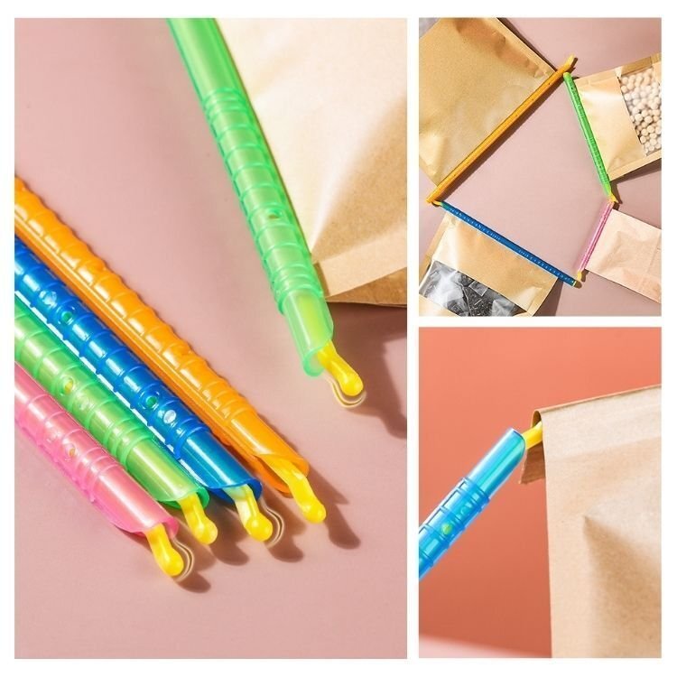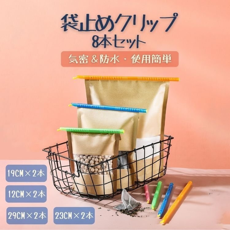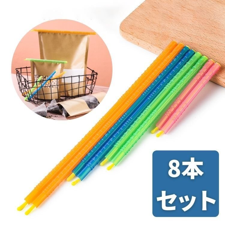 ◆袋止めクリップ 8本セット 棒状クランプ 密封クリップ 防水 湿気防止 食材保存 鮮度保ち 袋密封 4サイズ 各2本 お菓子袋 ビニール袋に 用途が広い カラフル MFT08S