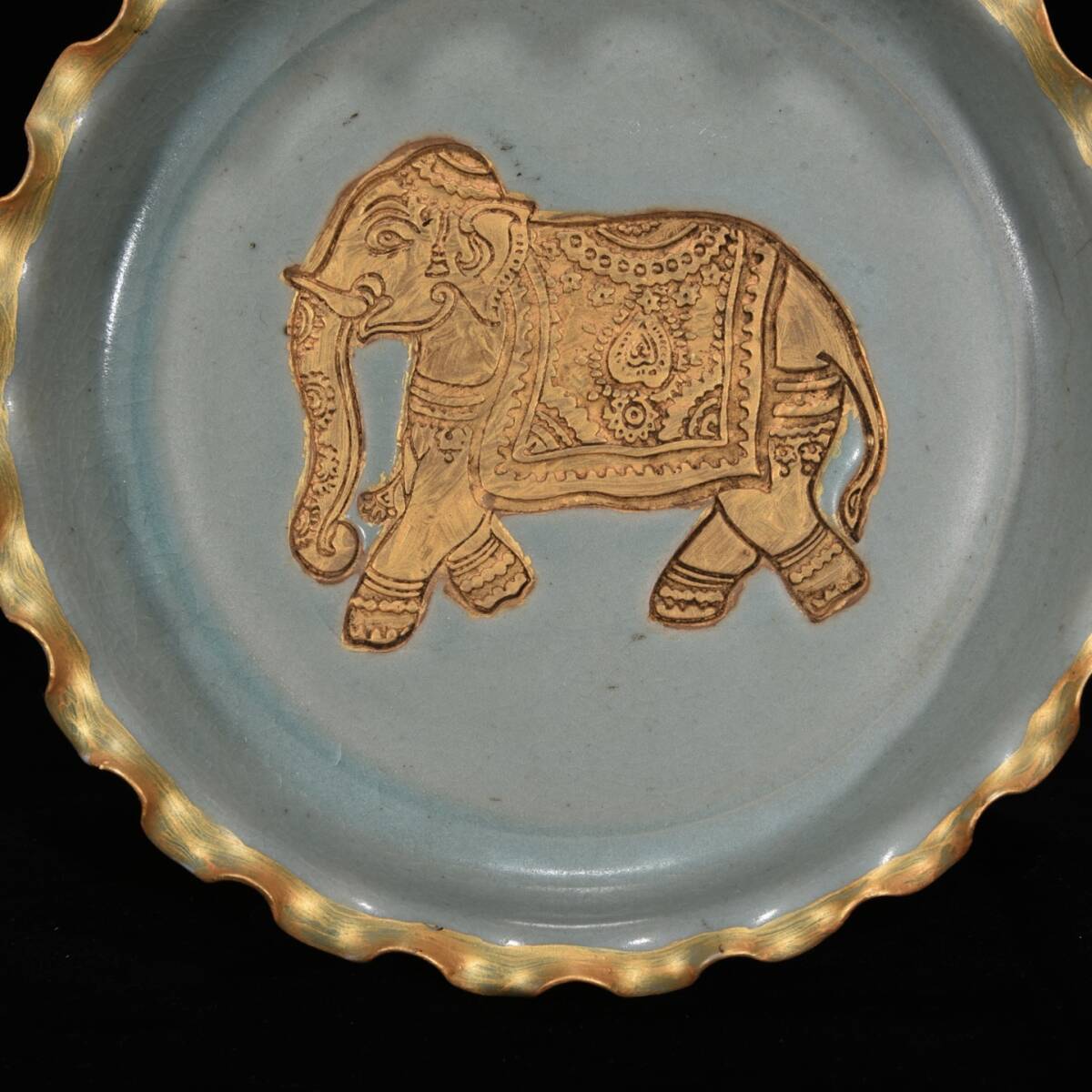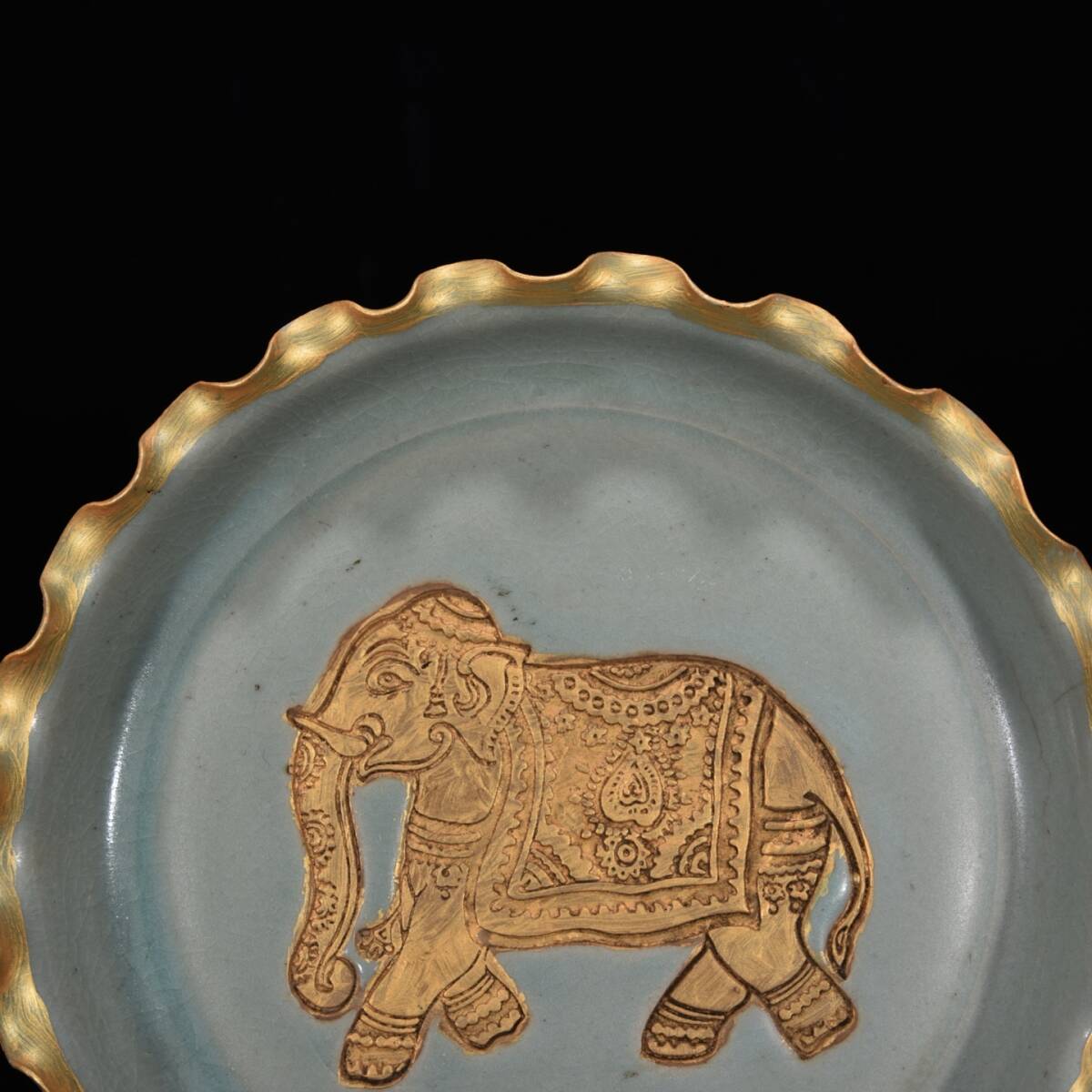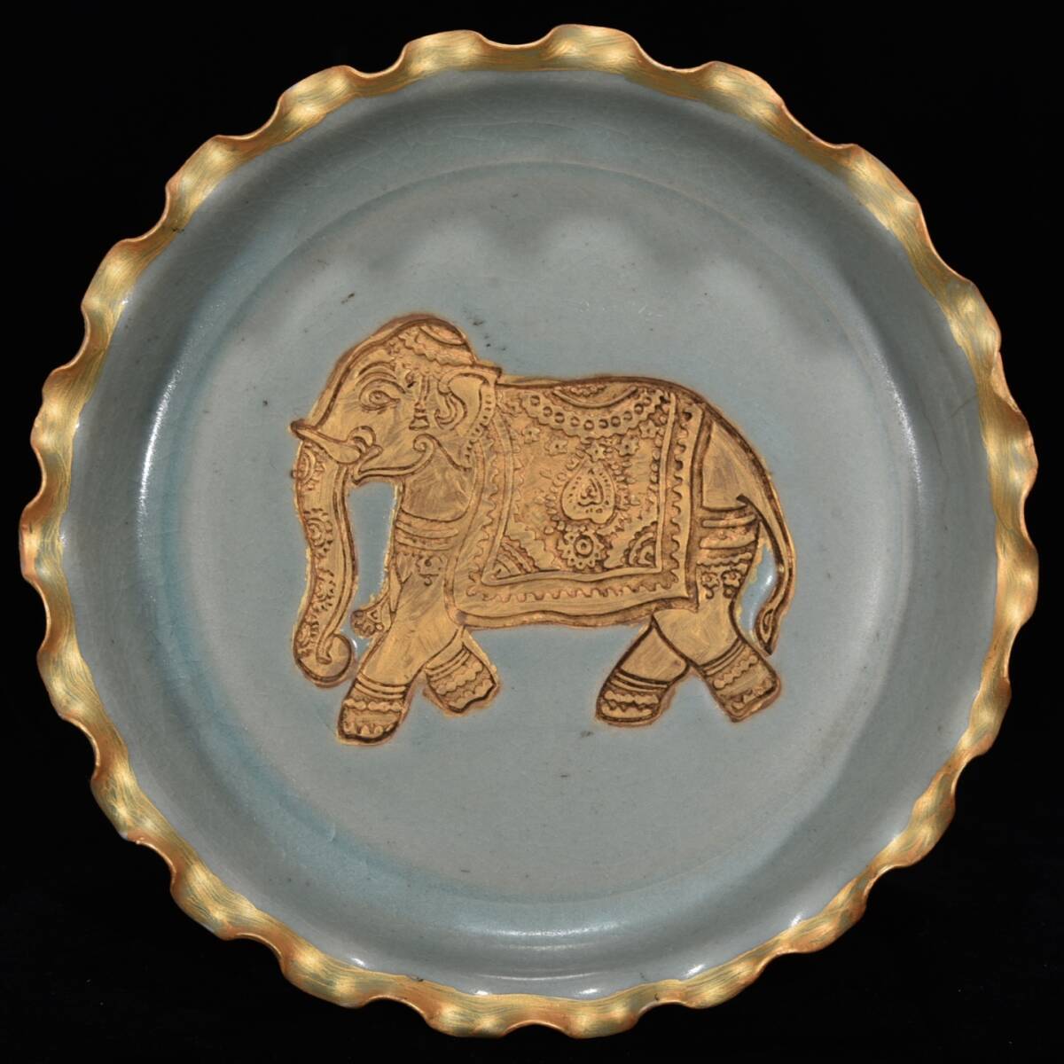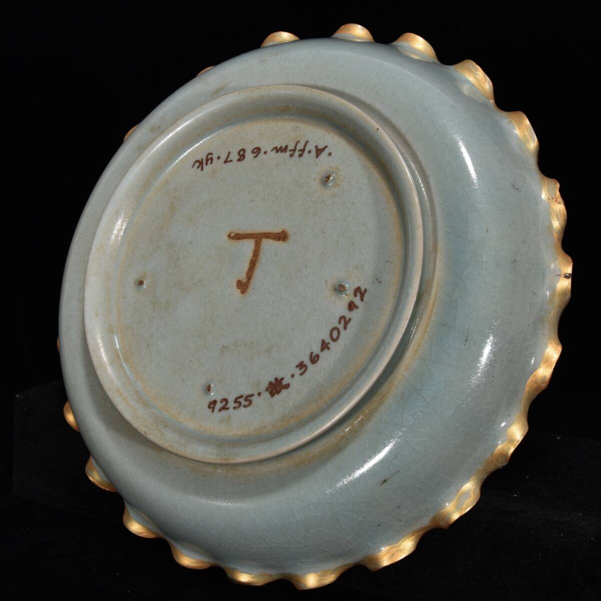 唐物 宋 汝窯 塗金刻像紋 花口洗 陶芸 古陶磁器 中国磁器 極細工 中国古玩 骨董品 古美味 D610
