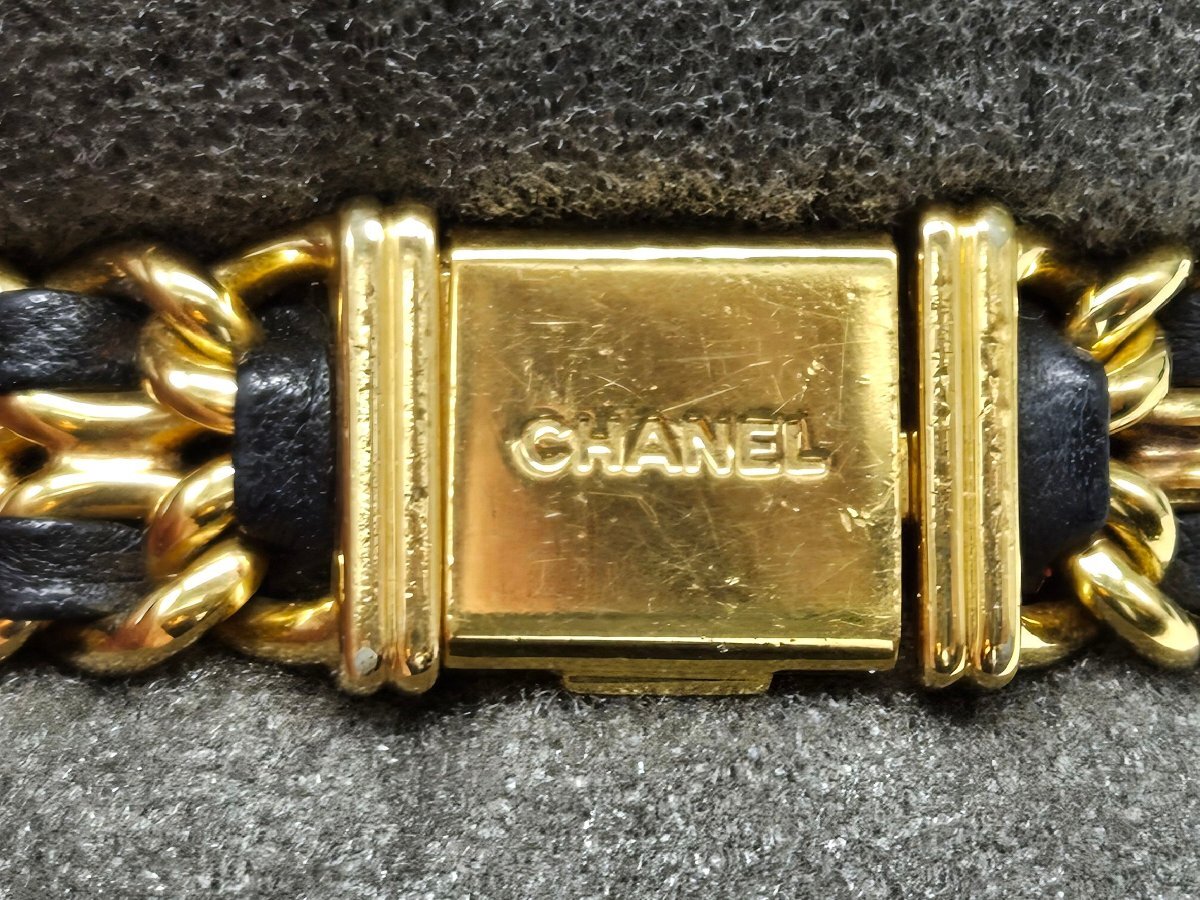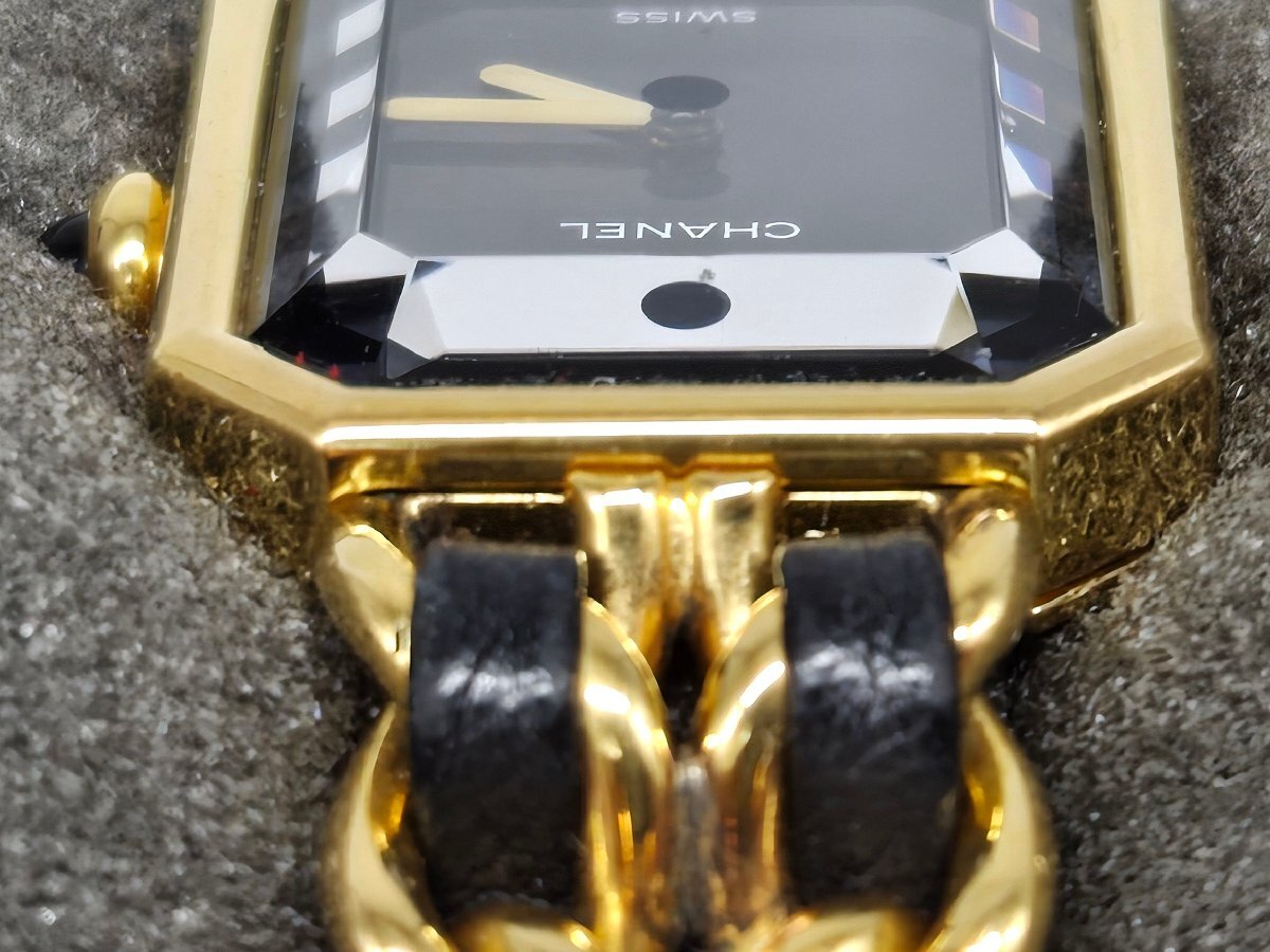 Θ人気【CHANEL シャネル プルミエール Mサイズ H0001 腕時計 GP ゴールド クオーツ ブラック文字盤 レディース 中古】HM2585