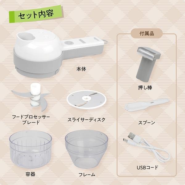 セット内容 本体、フードプロセッサーブレード、スライサーディスク、容器、フレーム、押し棒、スプーン、USBコード
