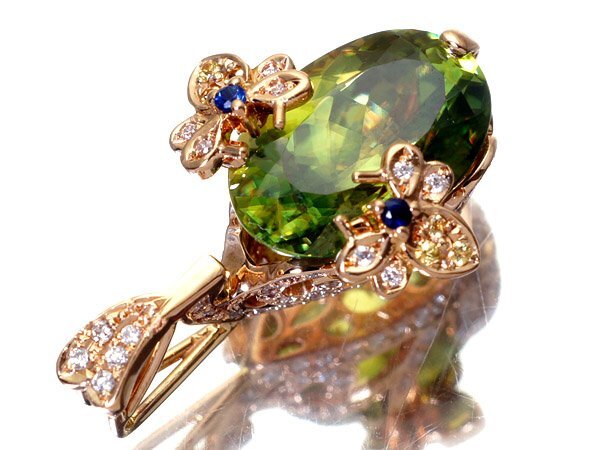 ダイヤモンドよりも屈折率の高い唯一の天然宝石のスフェーンは、非常に美しい虹色のファイア輝きを魅せてくれています! こちらのスフェーンは、良質なペリドットのような黄色味の少ない美しいグリーンカラーの中にダイヤモンドのような極上の虹色のファイアを放つ、極上の天然スフェーンです!
