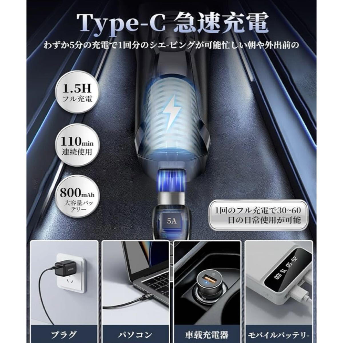 【大容量バッテリー&Type-C 充電】高性能なリチウムイオン電池により、フル充電(120分間)で99分間ぐらい超長時間使用できます。外出先でもバッテリーの心配はいりません。最新のType-C充電ポートを採用し、わわずか5分の充電で1回分のシェービングが可能。忙しい朝や外出前の準備時間でも安心して使える設計です。シンプルで使いやすい設計により、シェーバーの管理がストレスフリーになります。