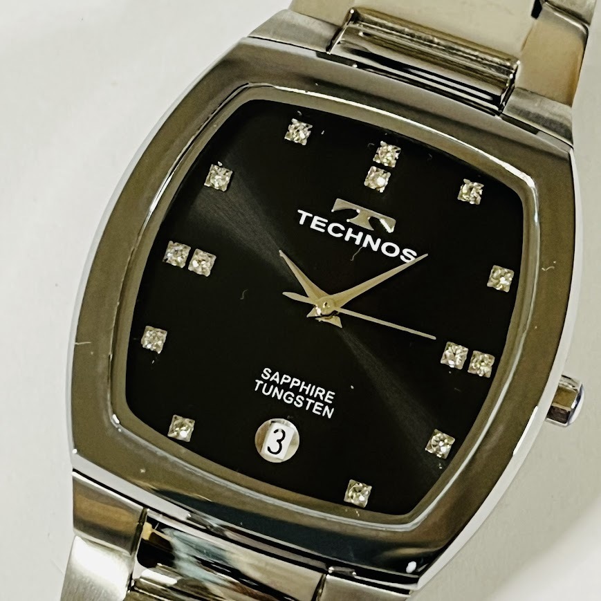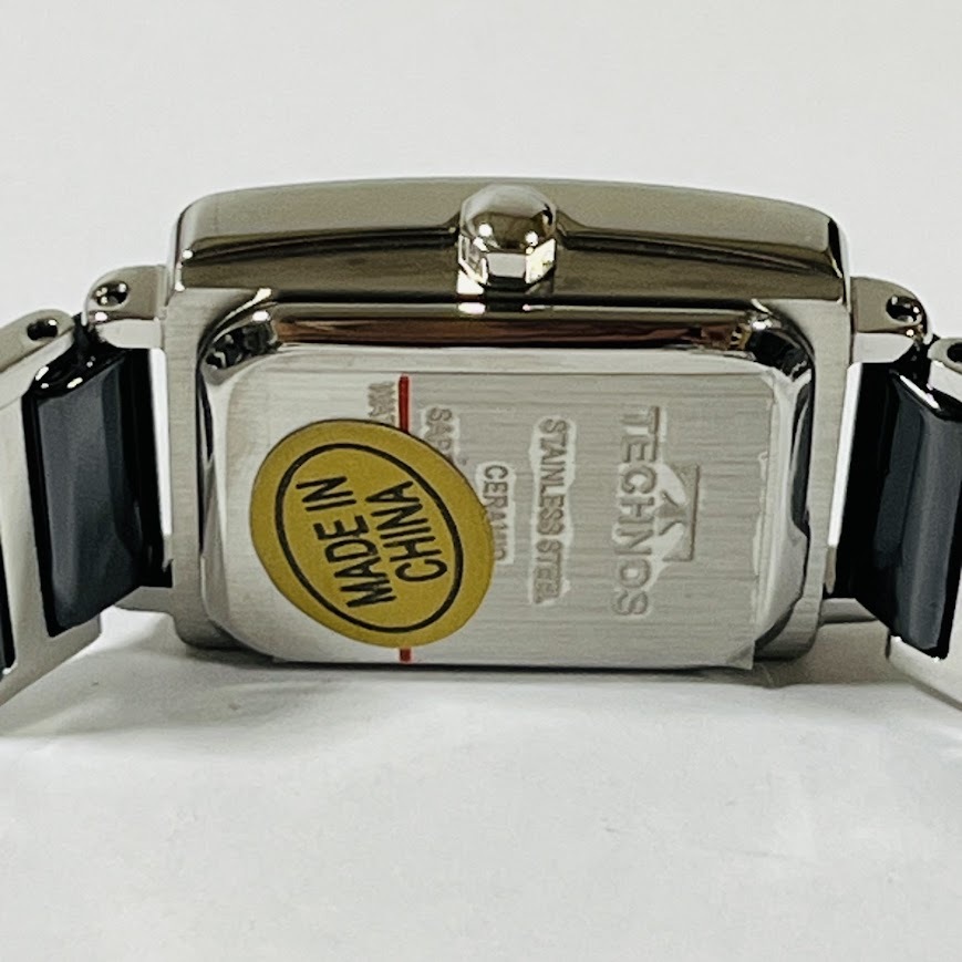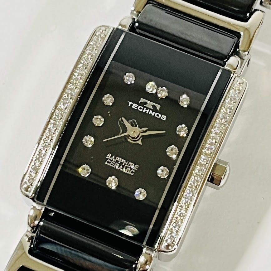 ★TECHNOS★ テクノス 超硬タングステン セラミック 黒文字盤 ラインストーン クオーツ メンズ・レディース 未使用品 動作未確認