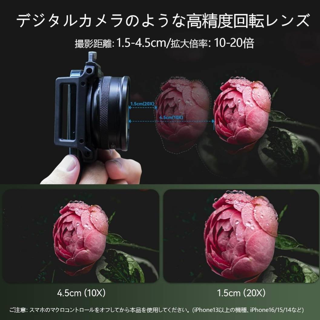 焦点距離の説明:10-20倍スマホズームマクロレンズ、15-45cm焦点距離可変です。