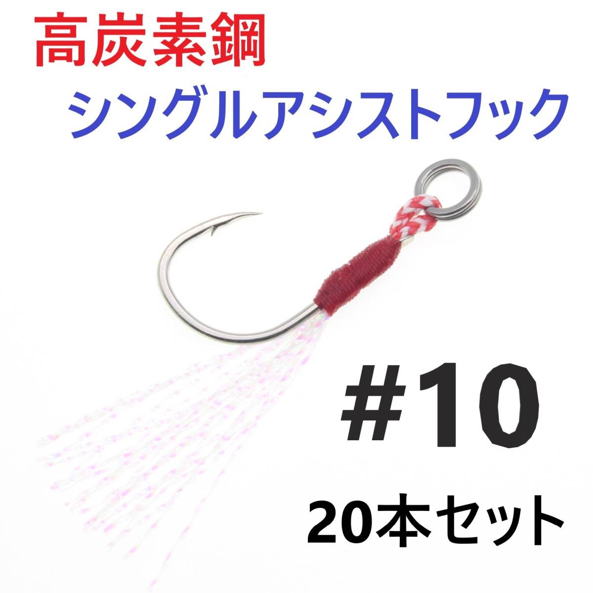 【送料無料】高炭素鋼 シングル アシストフック #10 20本セット ジギング メタルジグ 伊勢尼針 ティンセル スプリットリング付き