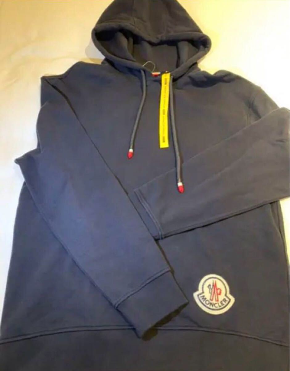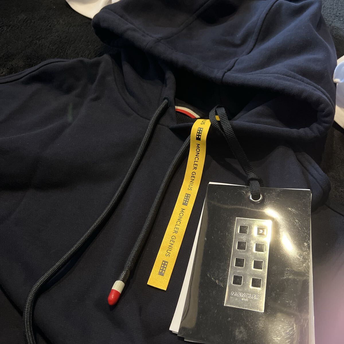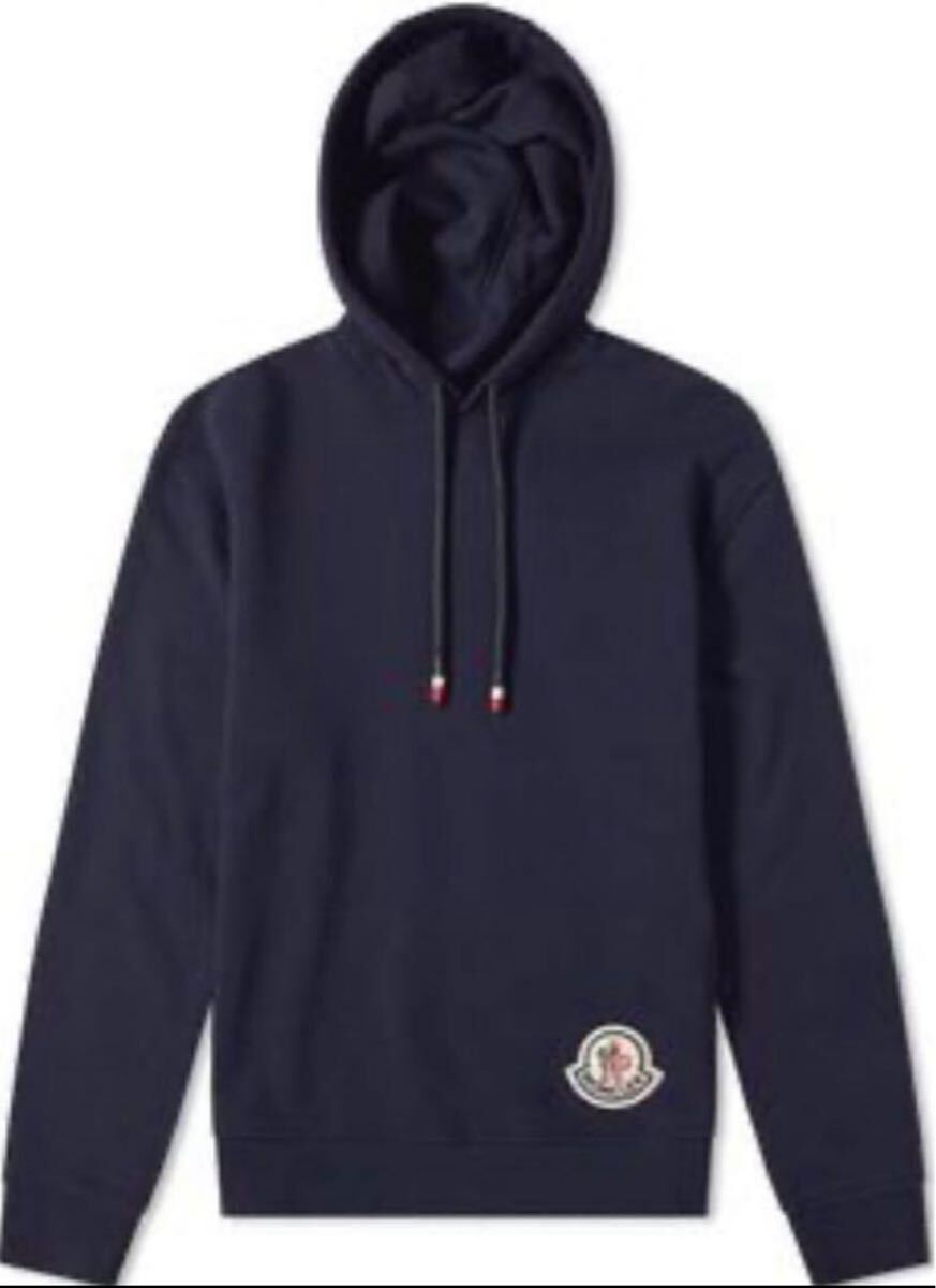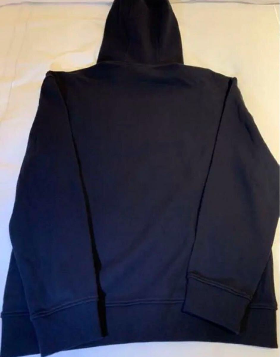 ネイビーのフード付きパーカー、イエローのドローストリングと刺繍ロゴが特徴。