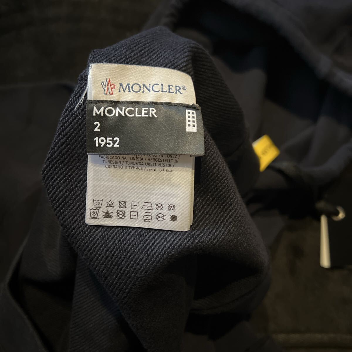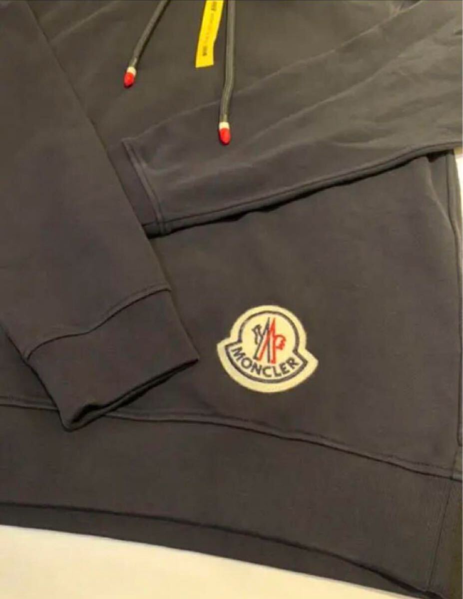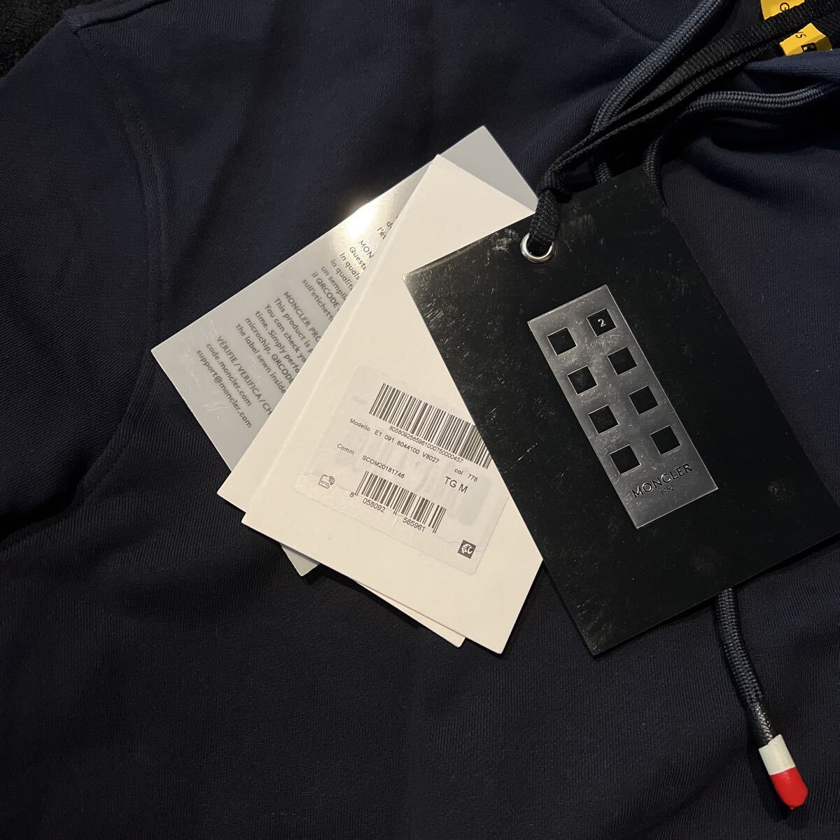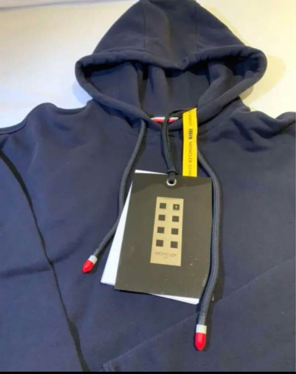 ネイビーのフード付きパーカー、イエローのドローストリングと刺繍ロゴが特徴。
