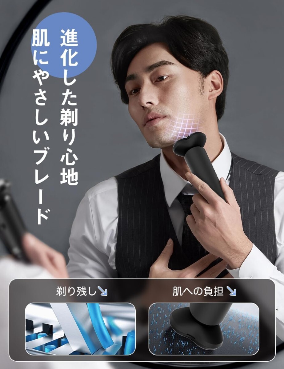 【3D回転式・極薄メッシュ刃・自動研磨システム】シェーバー は 極薄メッシュ刃が搭載し、V字型の内刃と外刃がヒゲを挟み込み、逃すことなく確実に深剃りを実現します。3つの丸みを帯びたコンフォートカット刃がお肌を守りながら、アゴ下や頬の小さな凹凸に均一に圧力がかかりやすく、肌にやさしく密着し、快適な 髭剃り を実現します。ひげそり 電動シェーバー は自動研磨システムを搭載しており、回転するたびに内刃が外刃で研磨され、常にシャープな切れ味。長持ちしやすく、耐久性が優れています。