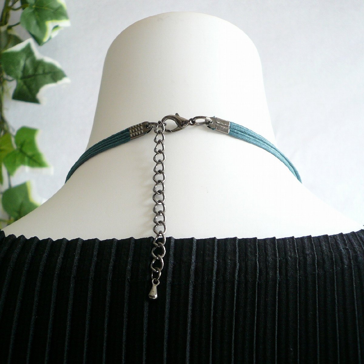 ネック部分にはレザー風合皮紐を使用し、ナチュラルな質感と軽やかな着け心地を両立。