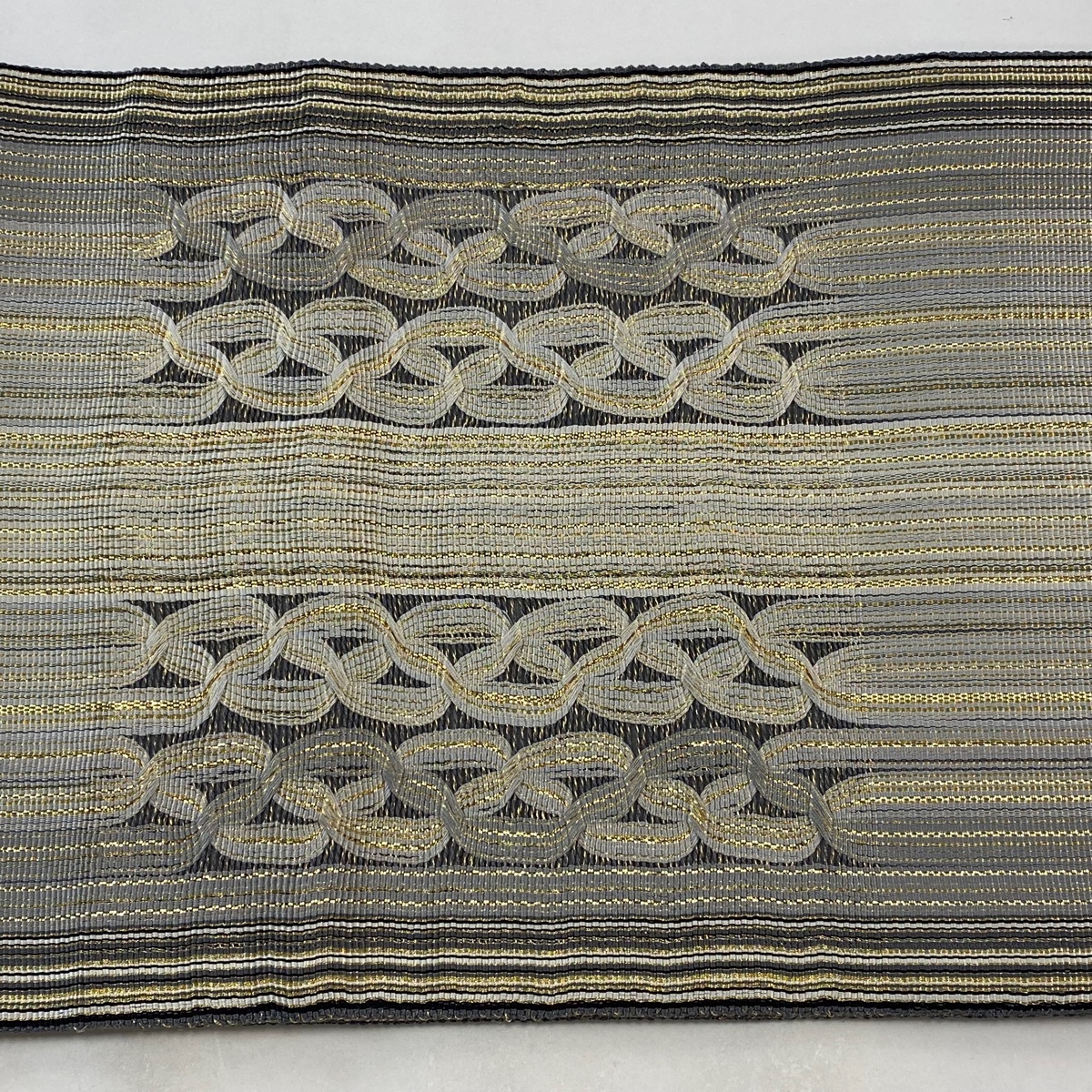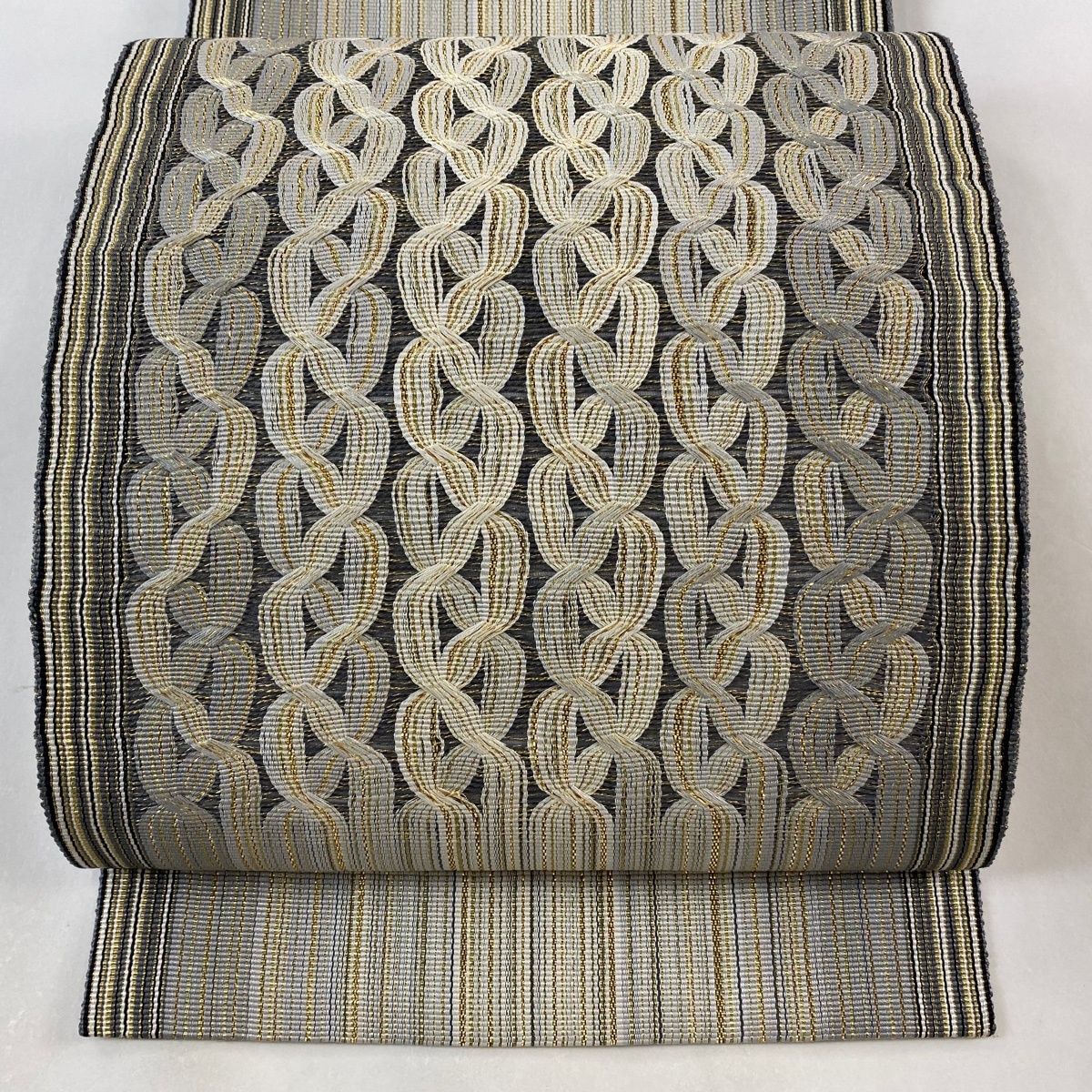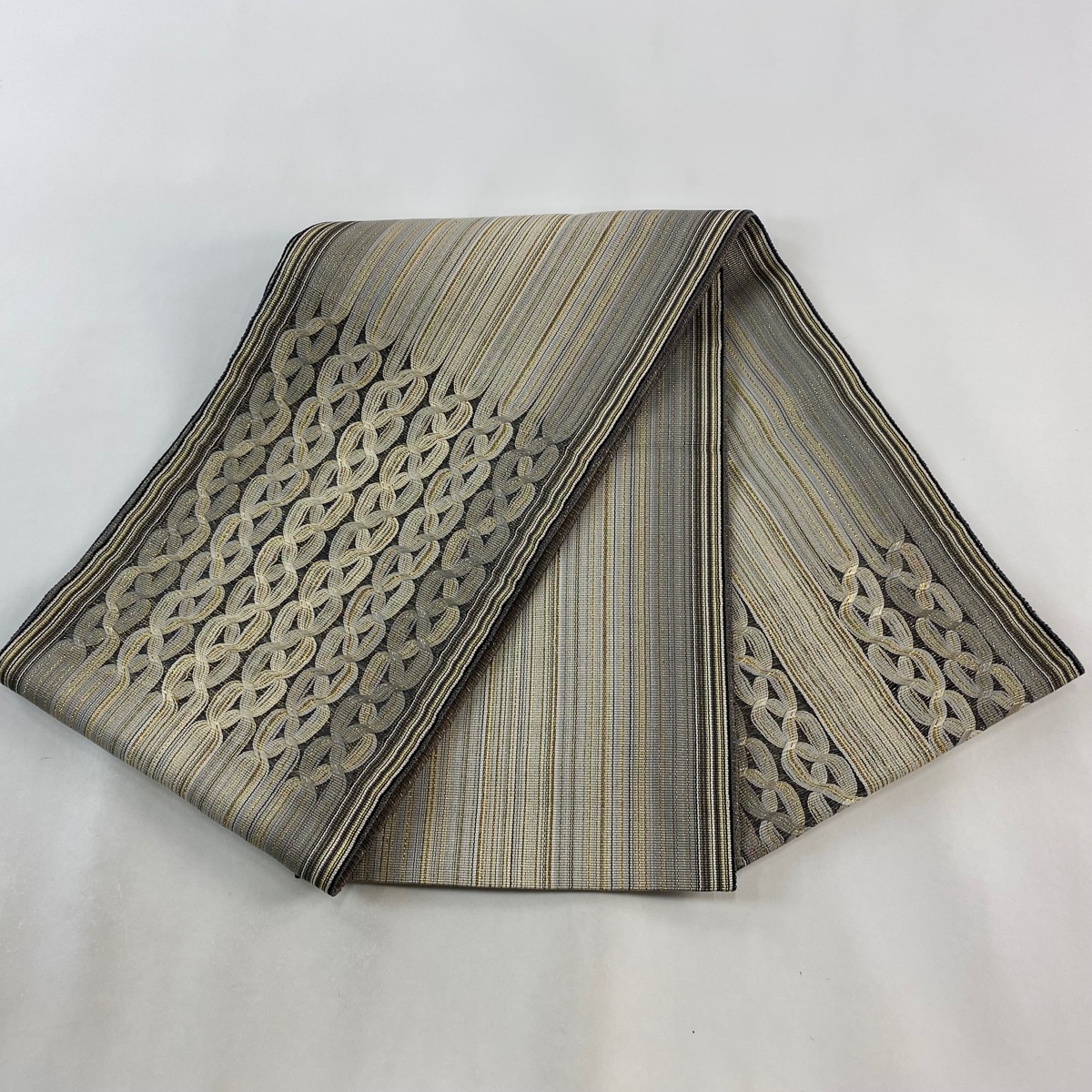 | 袋帯 美品 名品 幾何学 縞 箔 金糸 灰緑 お太鼓柄 正絹 【中古】 |
