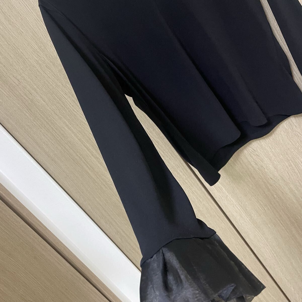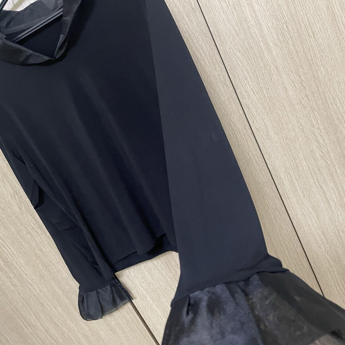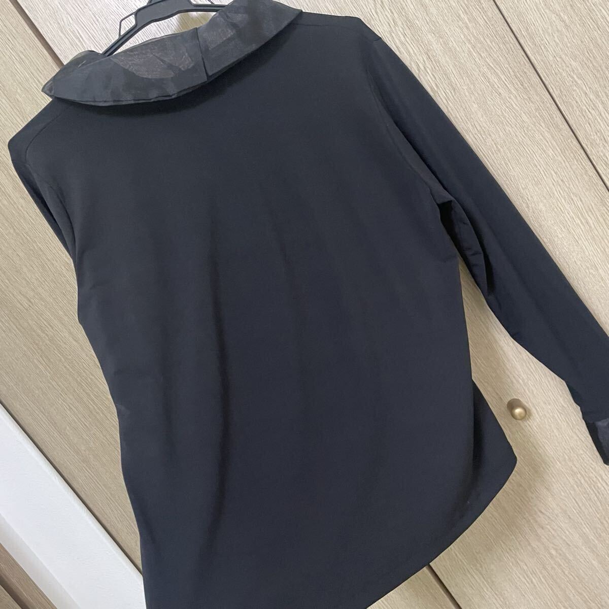 柔らかめのとろみ素材に襟と袖口にチュールぽいオーガンジーぽい感じの素材が付いてます。タックも入ってとても素敵です♪