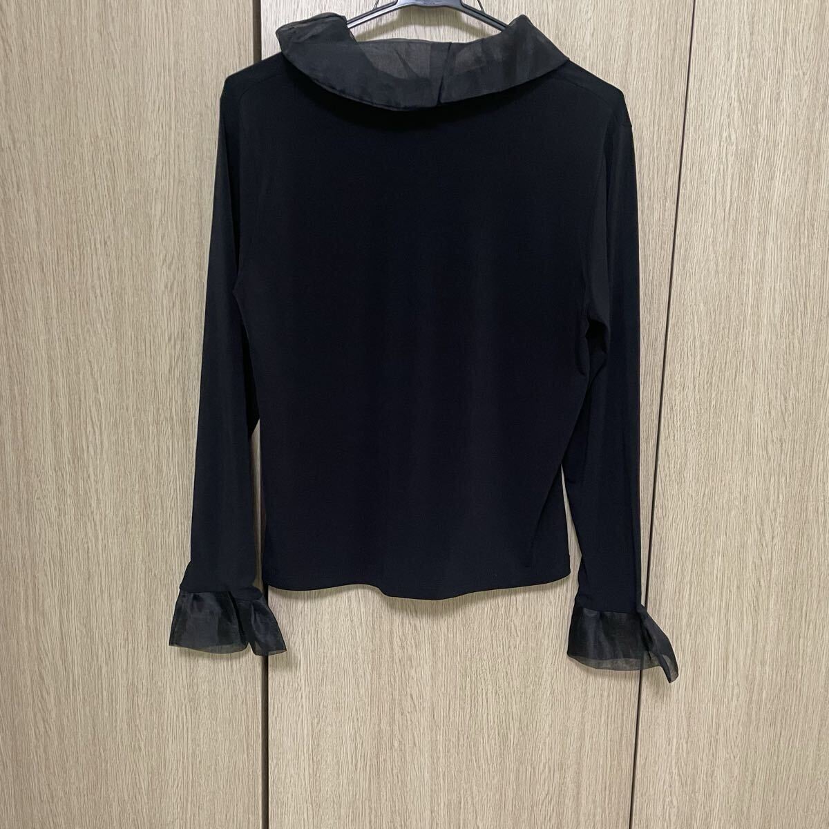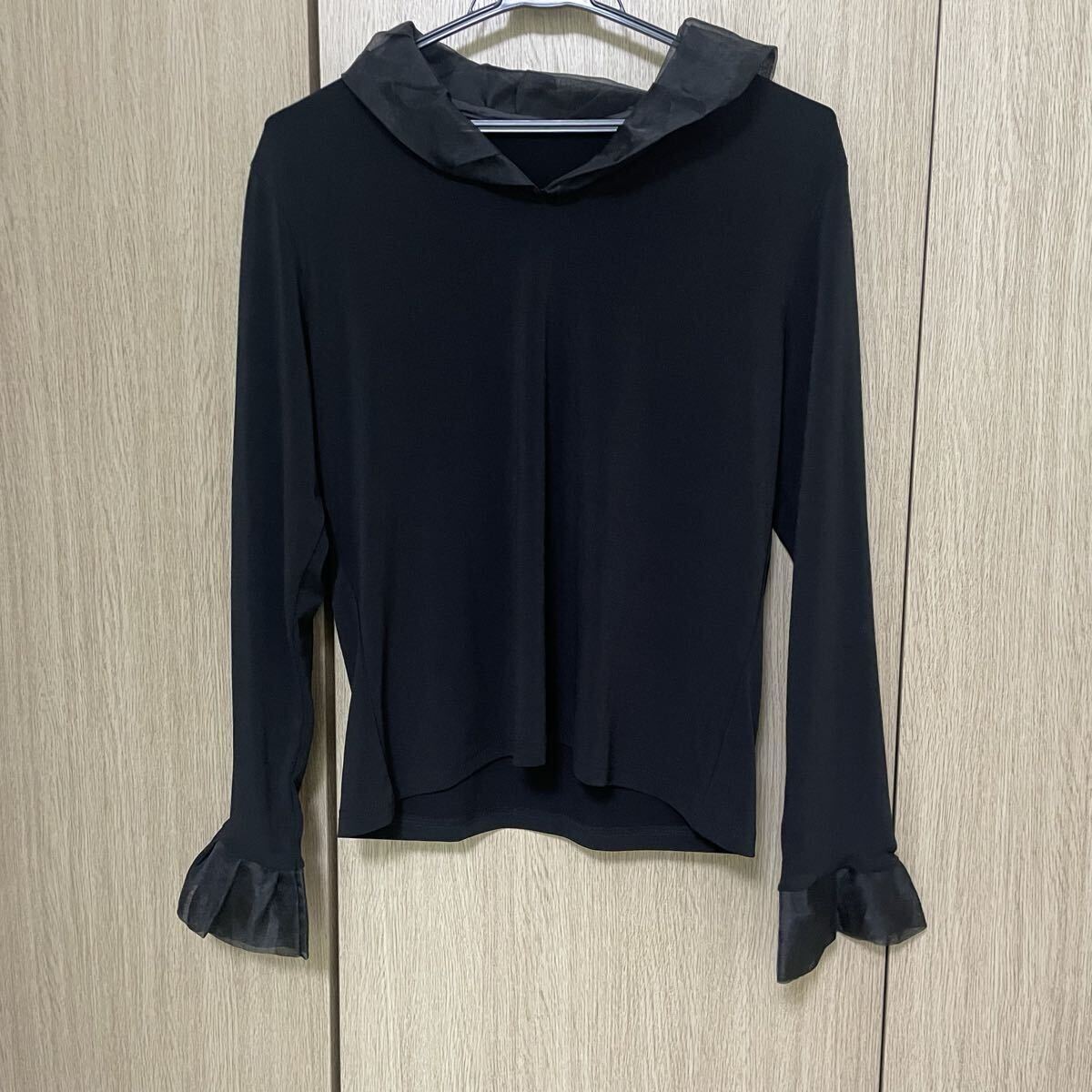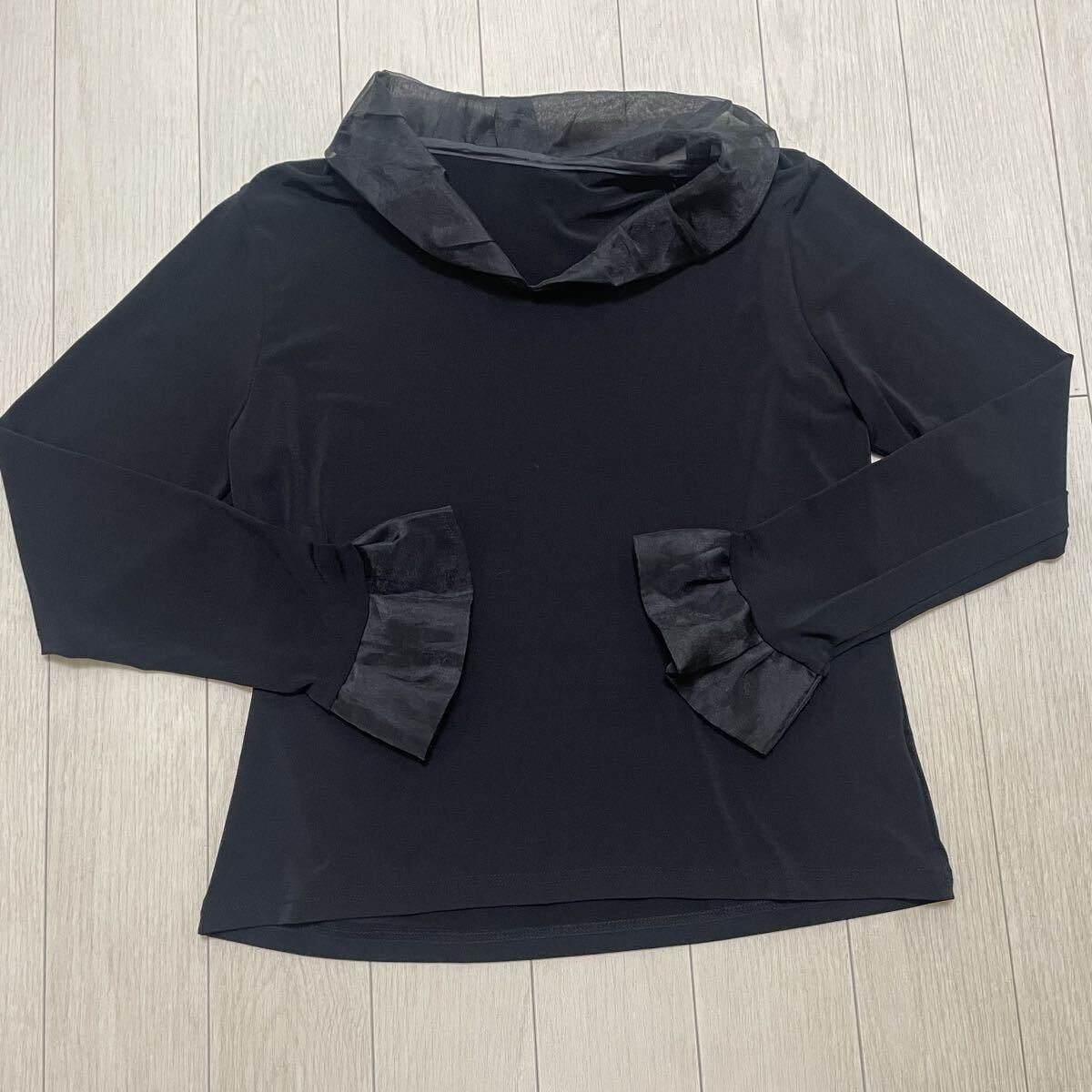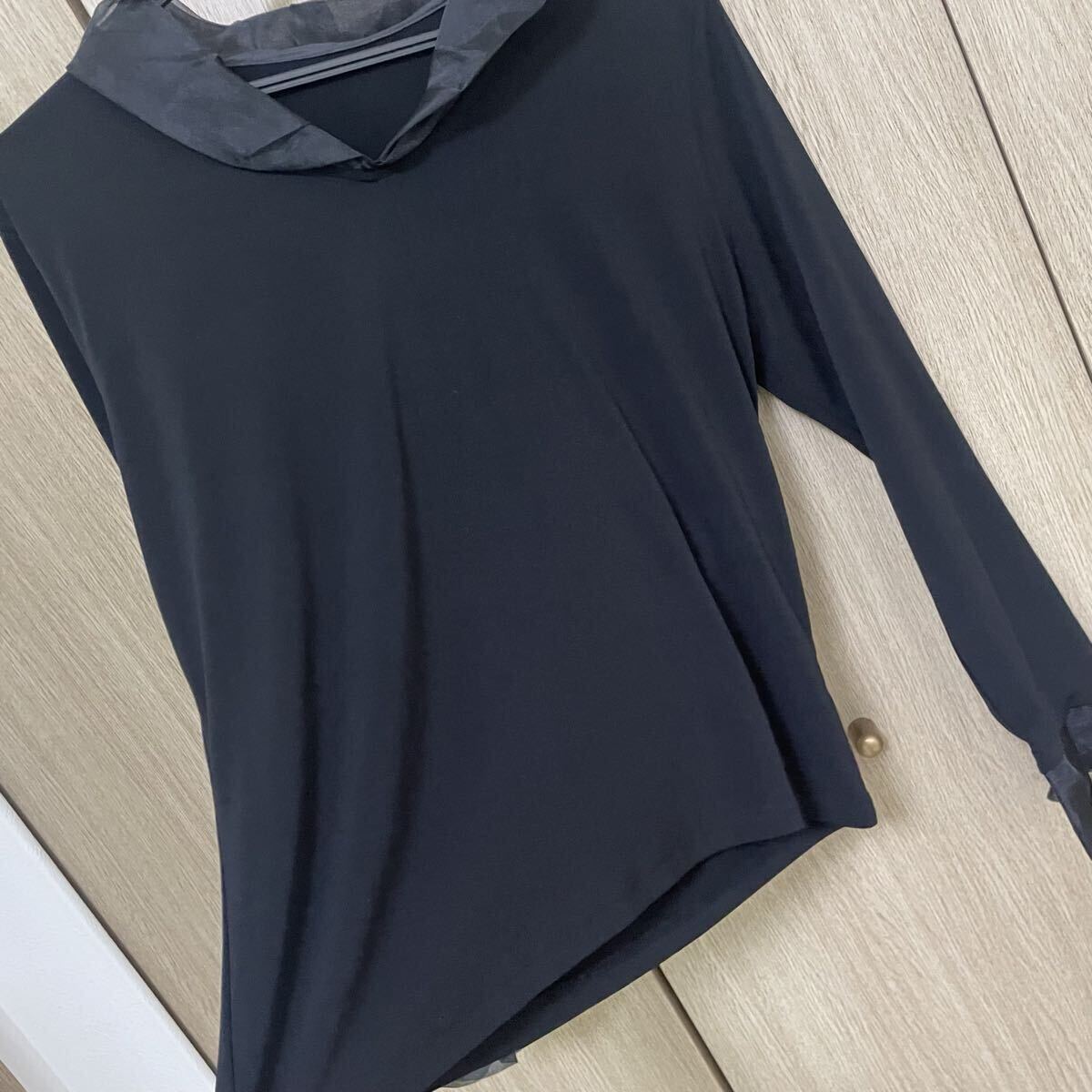 柔らかめのとろみ素材に襟と袖口にチュールぽいオーガンジーぽい感じの素材が付いてます。タックも入ってとても素敵です♪