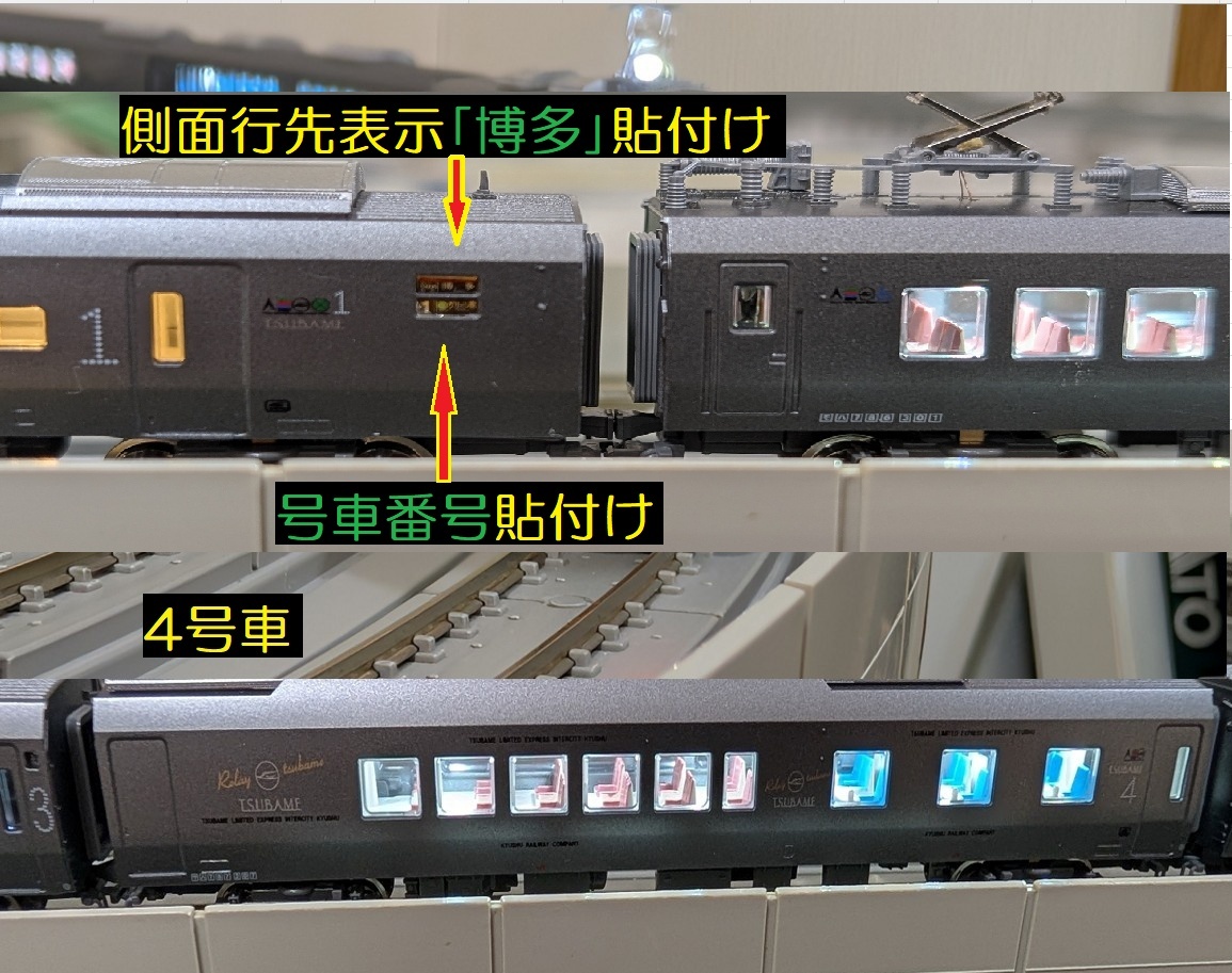 ・付属品として、根上パーツを全て取付け(残あり)、つばめシールを側面行先表示「博多」号車番号貼付け。